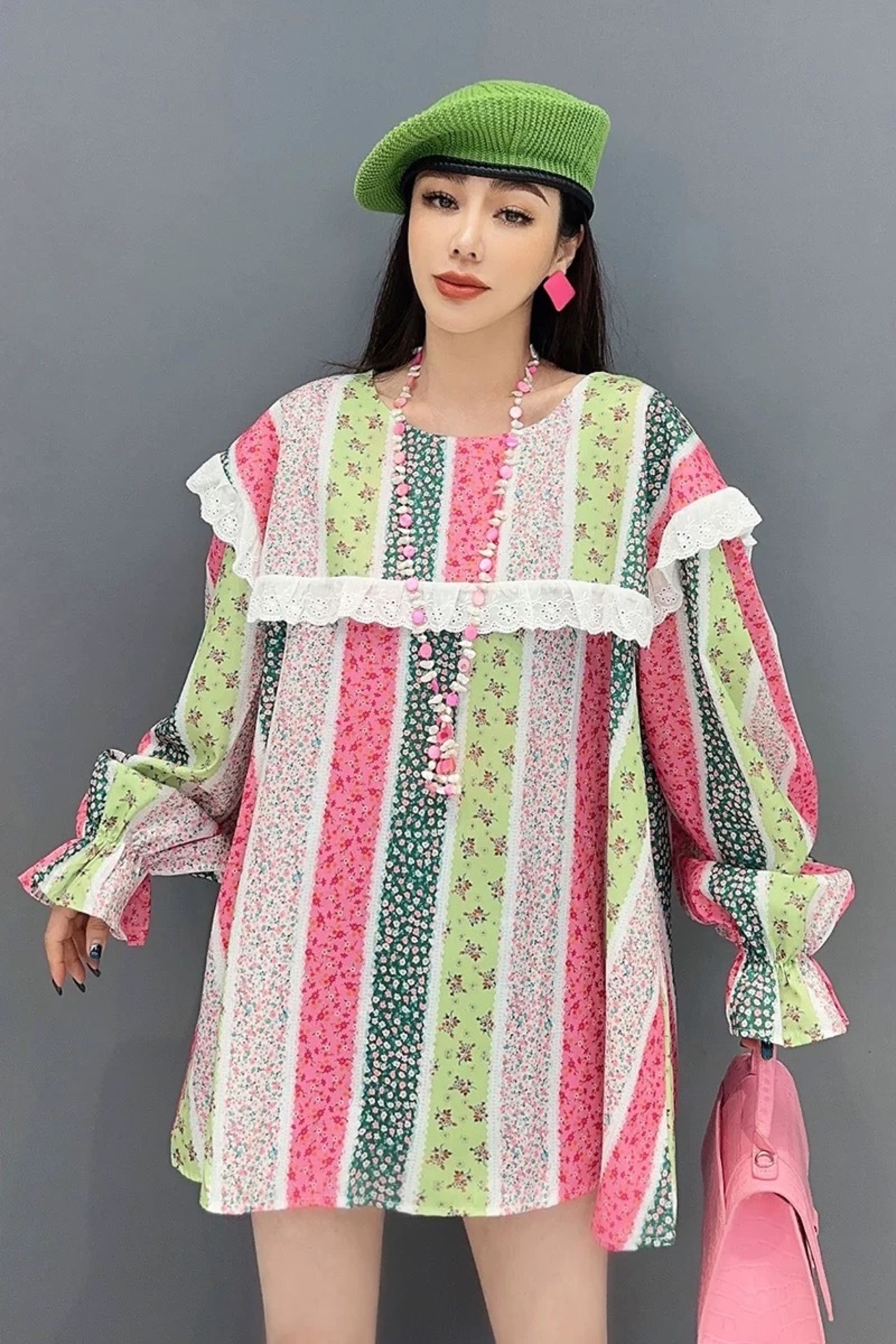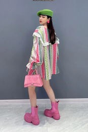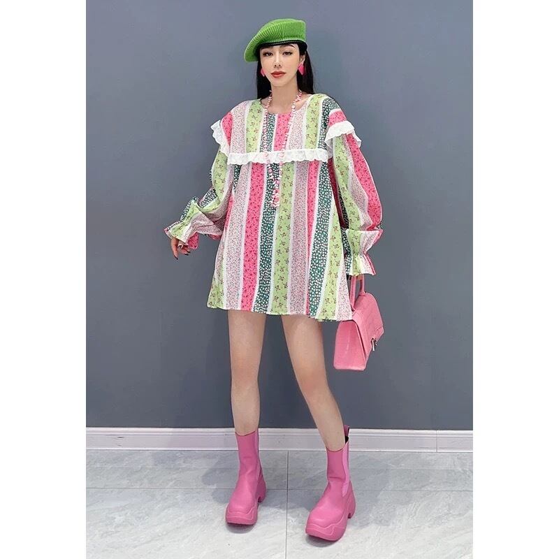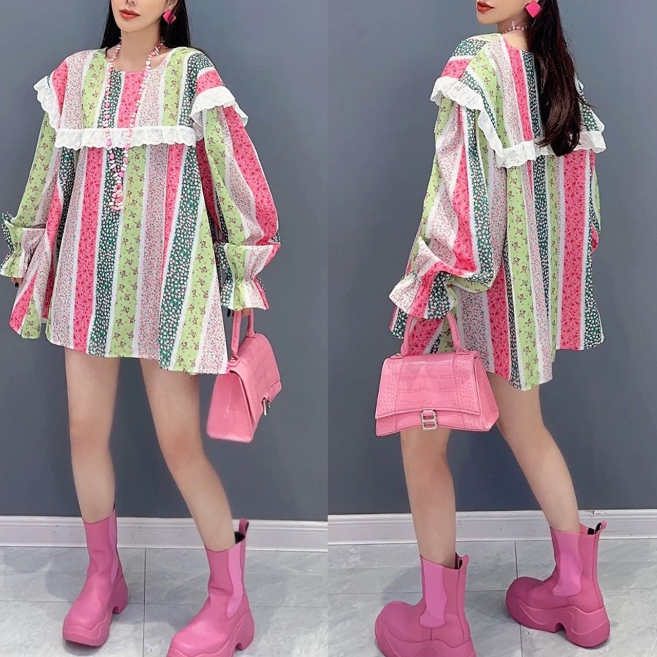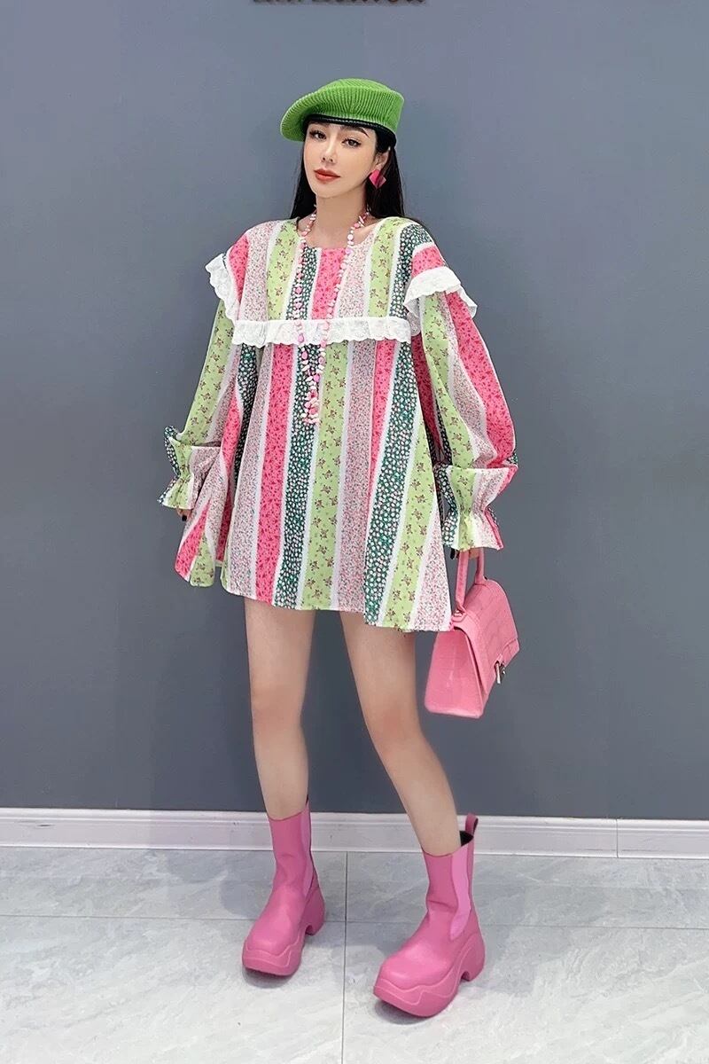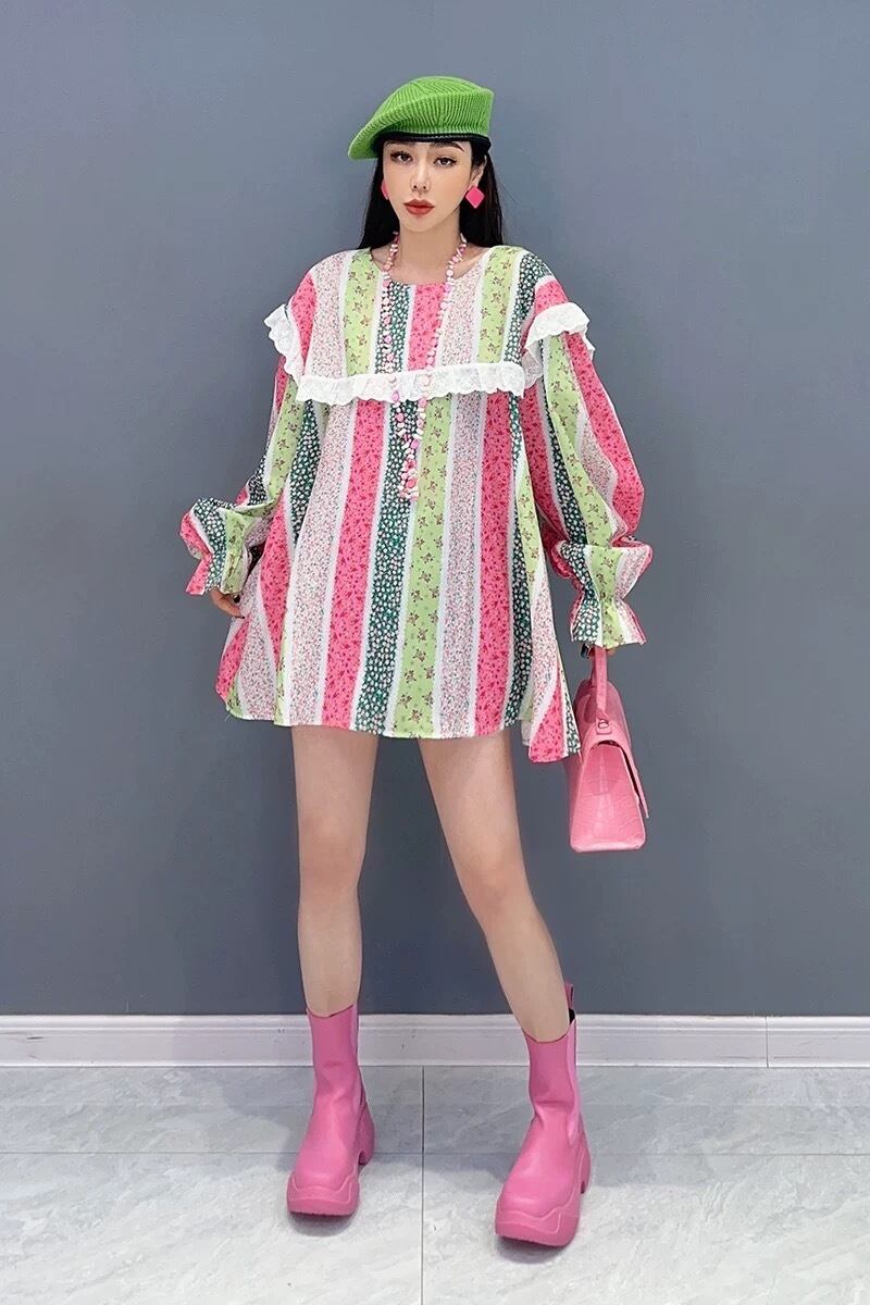 ボーダー チェック カラフル ブラウス ワンピース ピンク 緑 丸襟 カジュアル