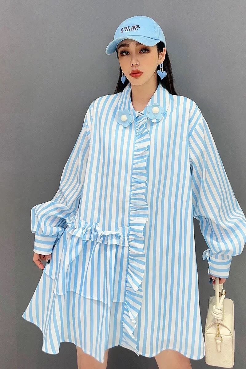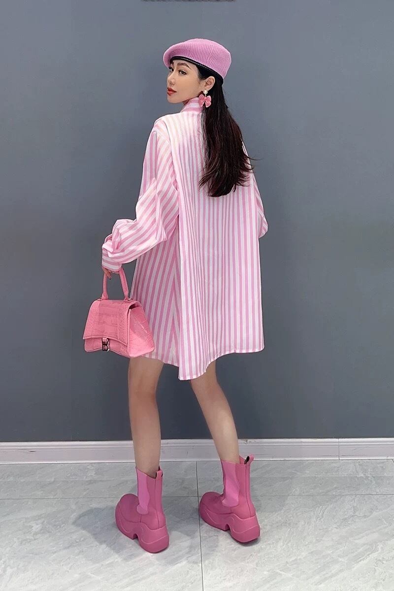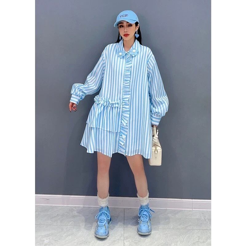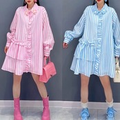 水色 ピンク 丸襟 ブラウス ワンピース シャツ トップス チェック ゆったり