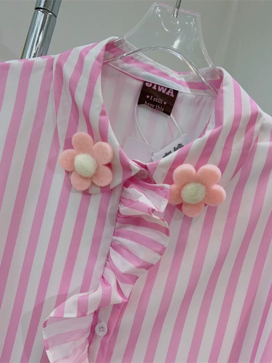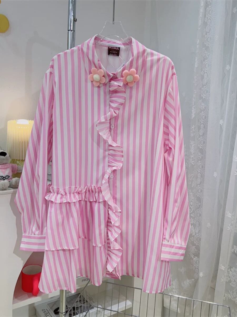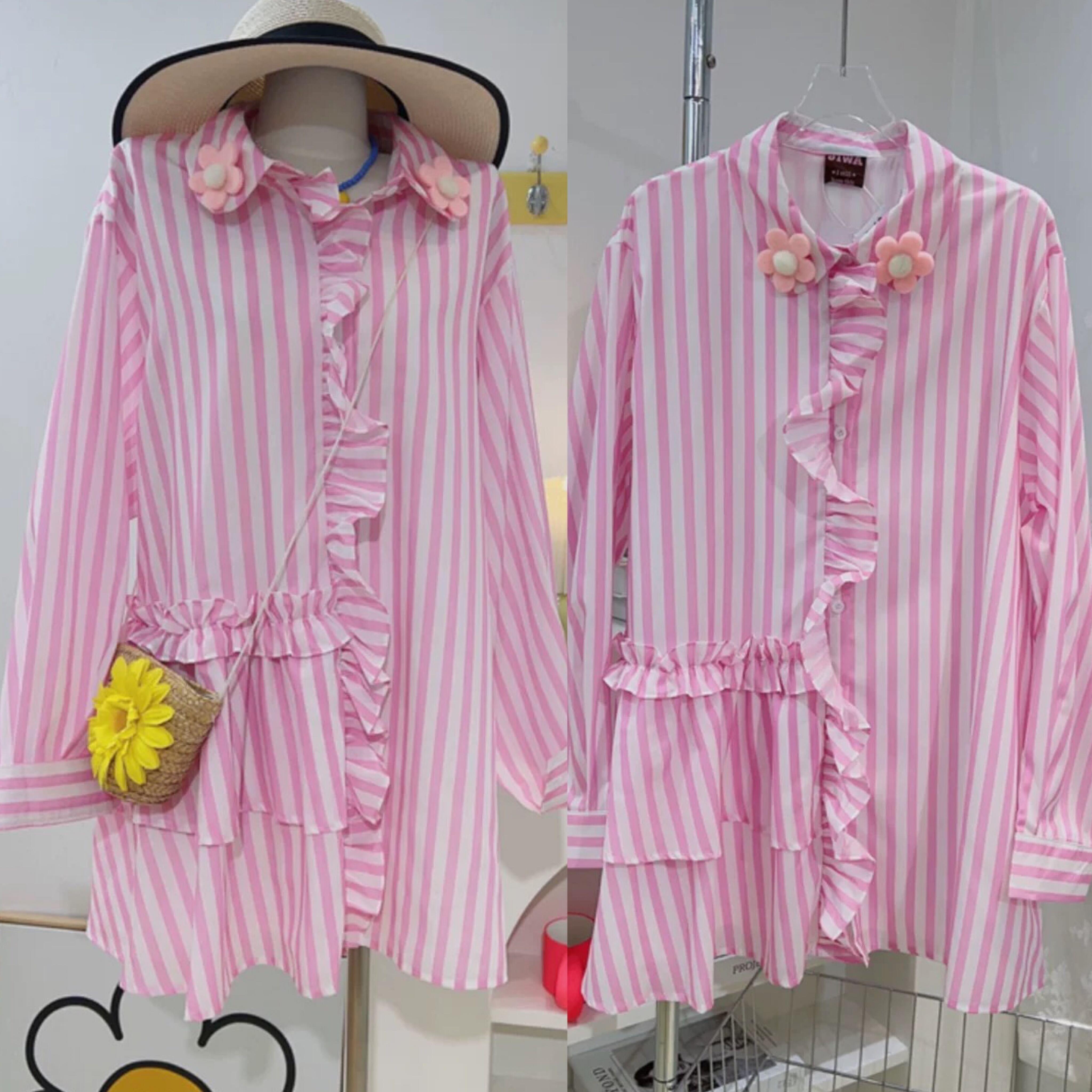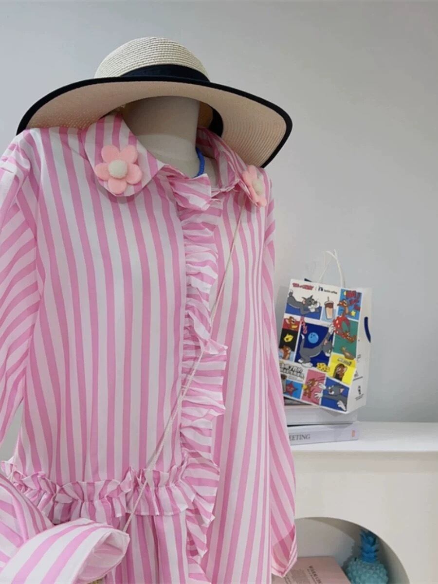 ピンク チェック ボーダー リボン ブラウス ストライプ ガーリー ワンピース