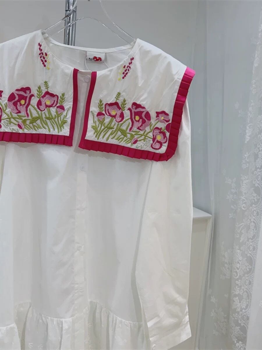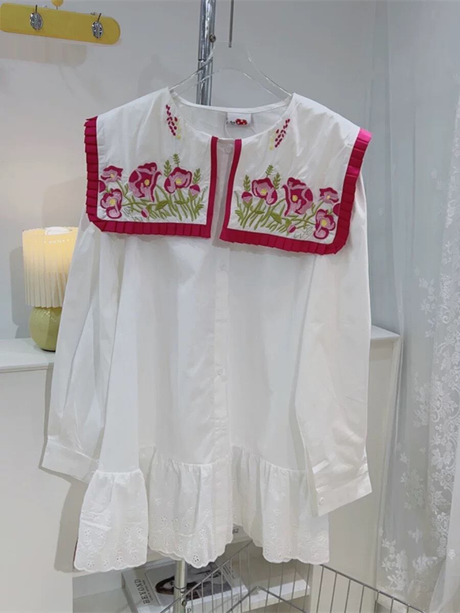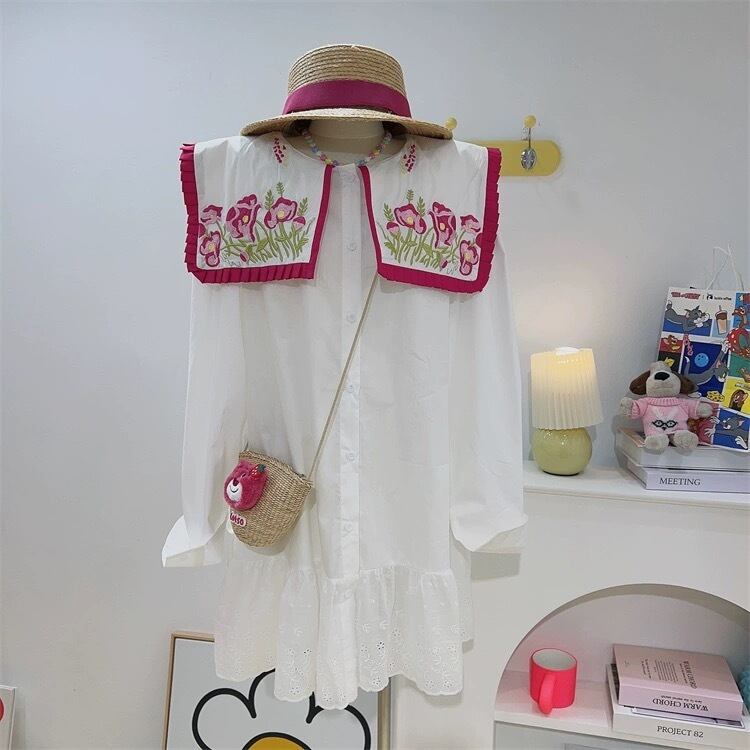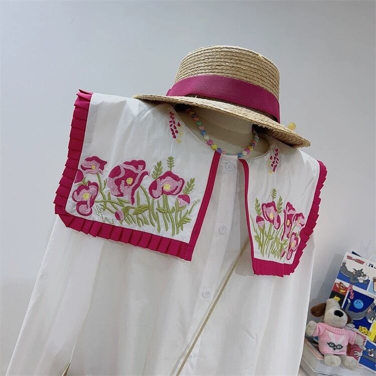 ワンピース 白 ブラウス トップス ガーリー ゆったり カジュアル 花柄 襟 フラワー