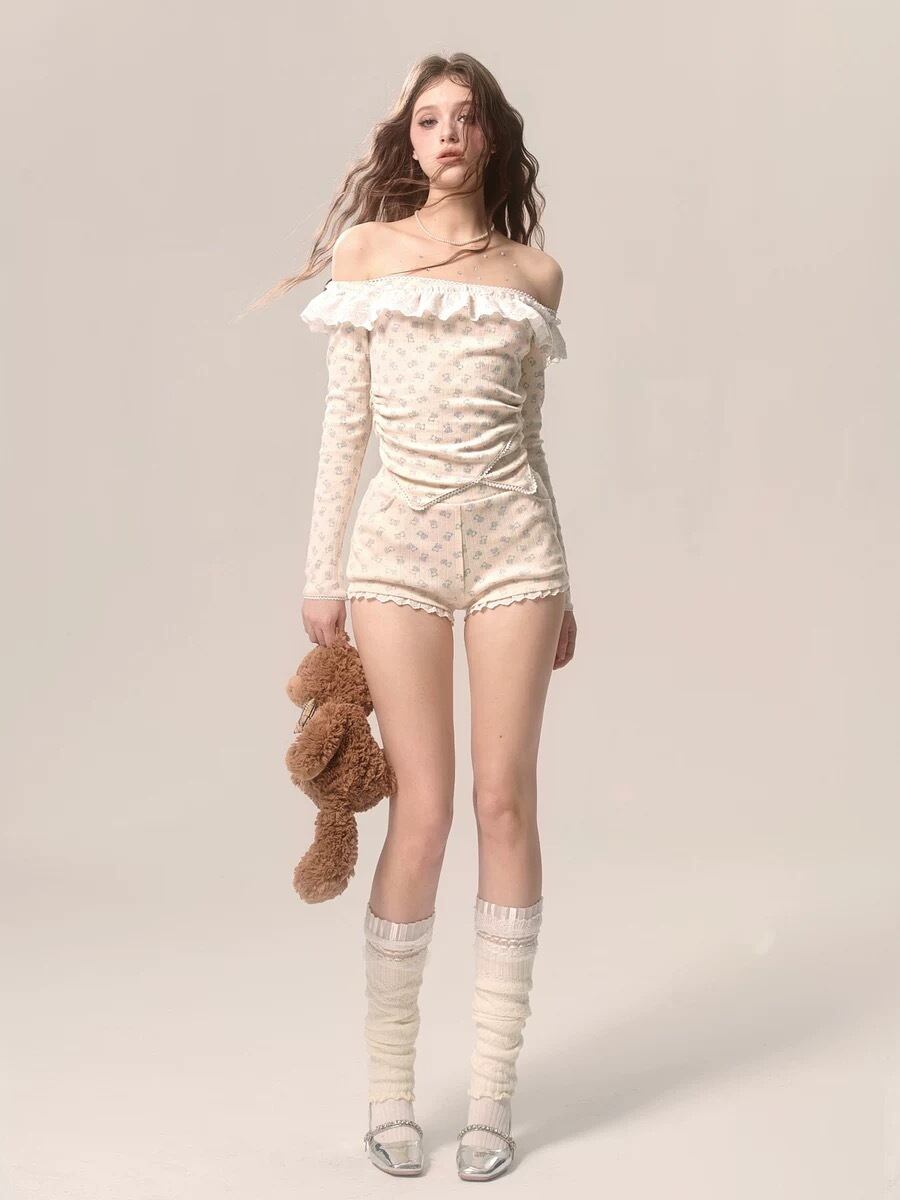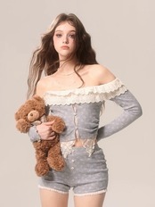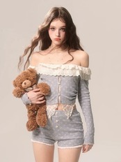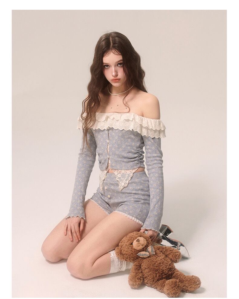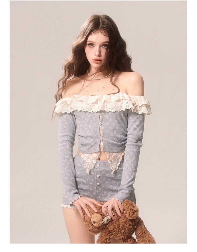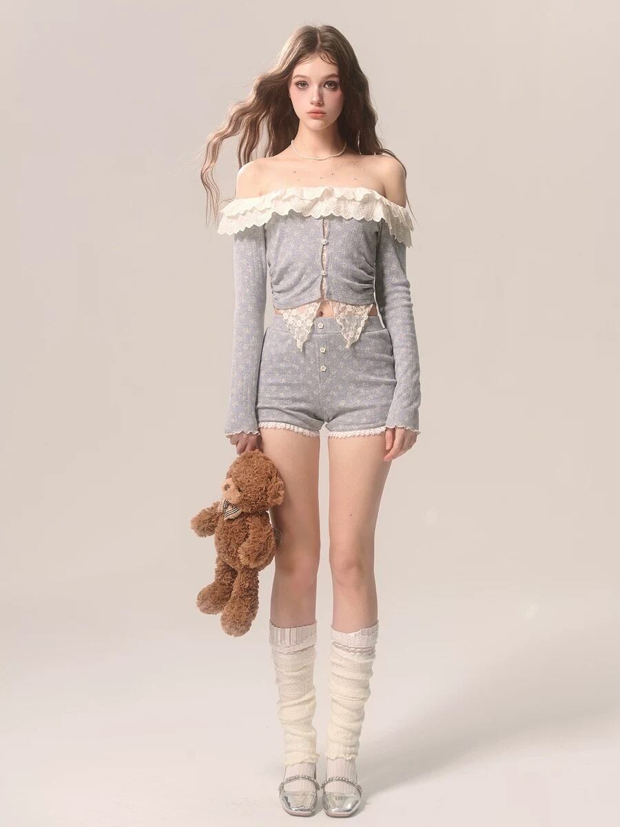 【セットアップ】カジュアル トップス ブラウス ルームウェア スウェット オフショルダー カーディガン フリル リボン