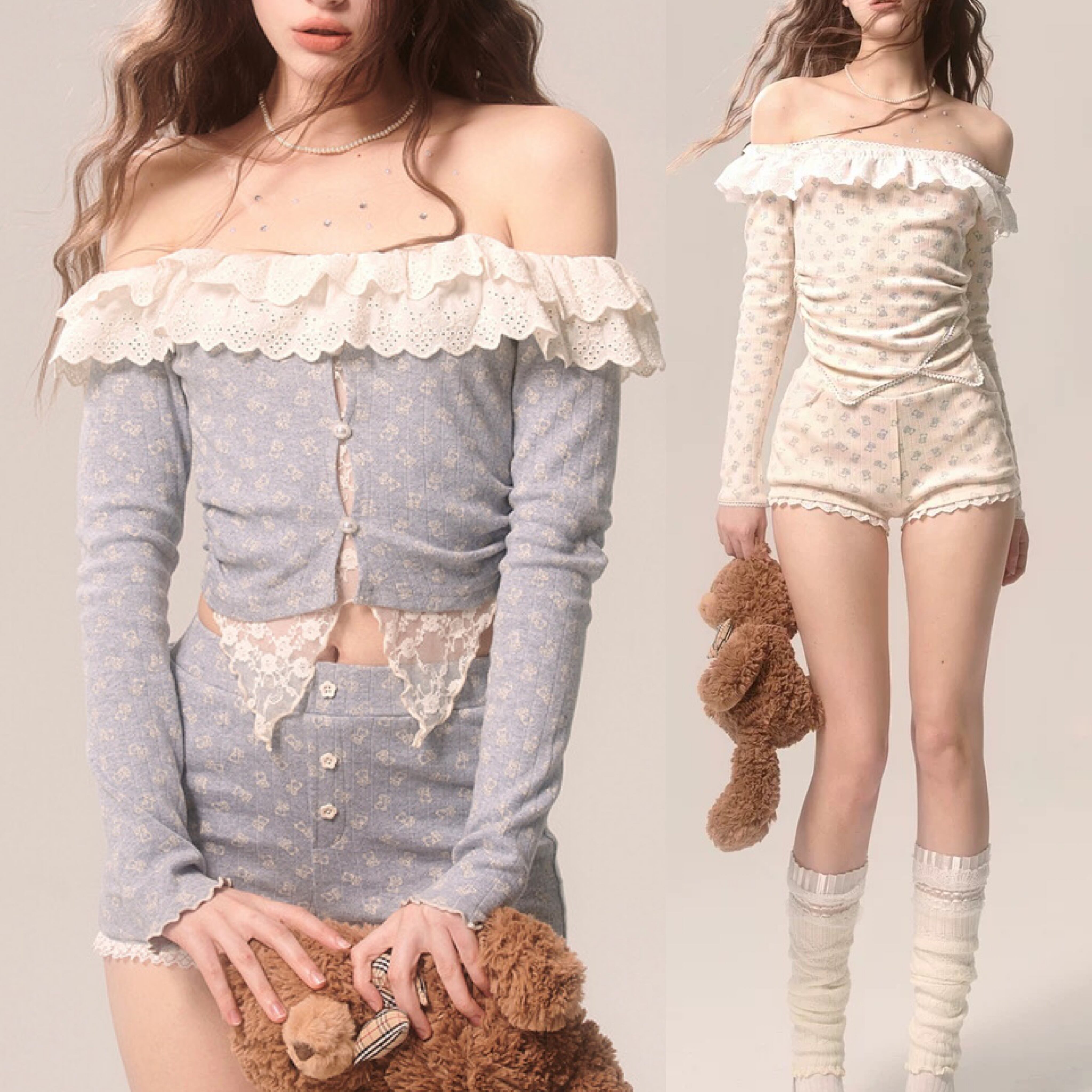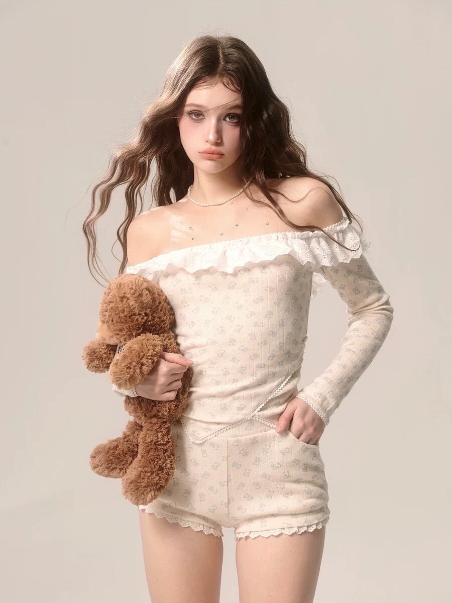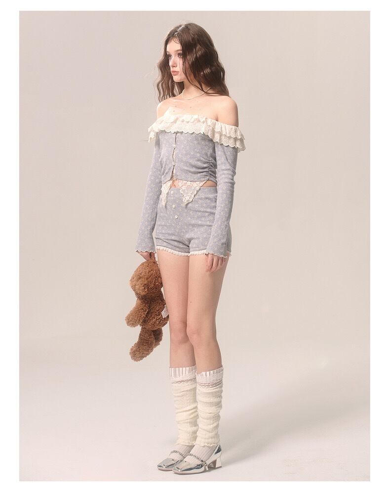 【セットアップ】カジュアル トップス ブラウス ルームウェア スウェット オフショルダー カーディガン フリル リボン