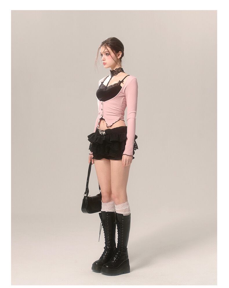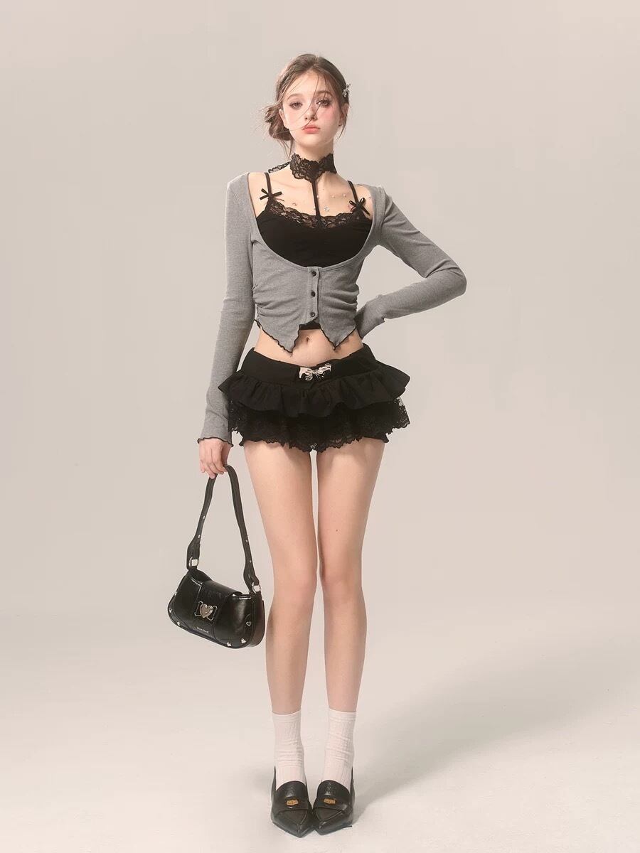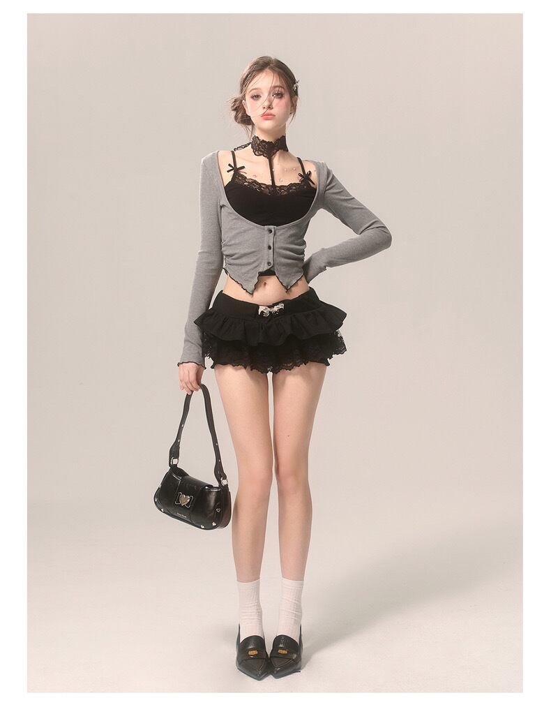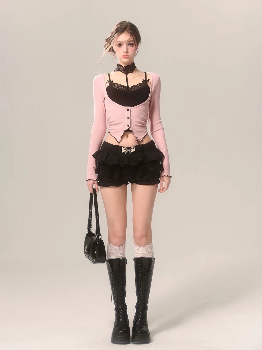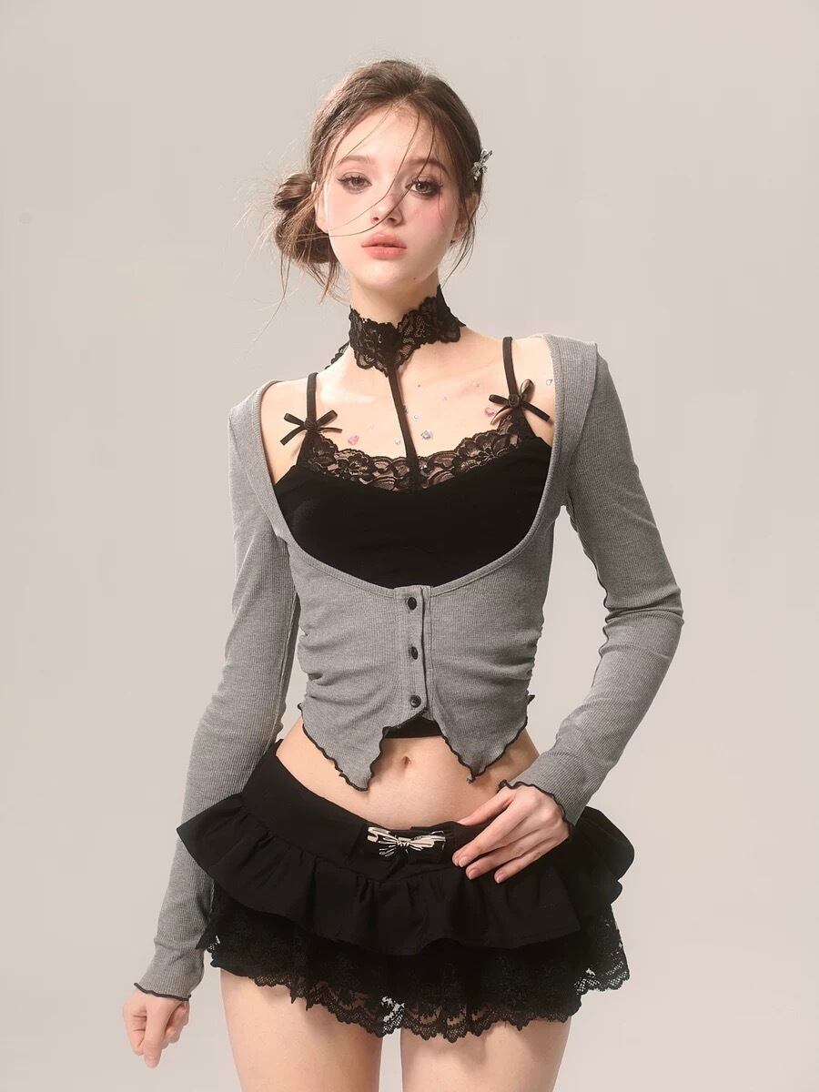 トップス グレー ピンク カーディガン スウェット カジュアル リボン 黒 キャミソール