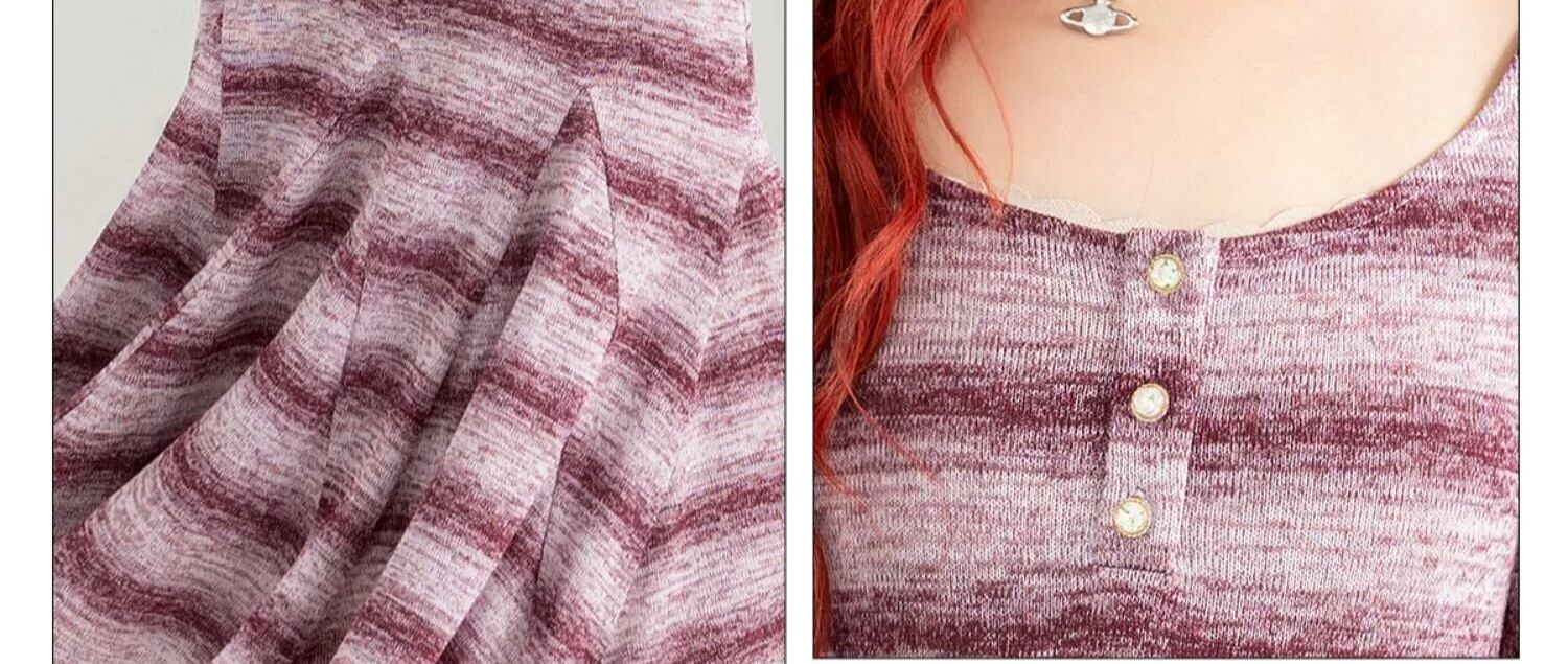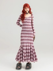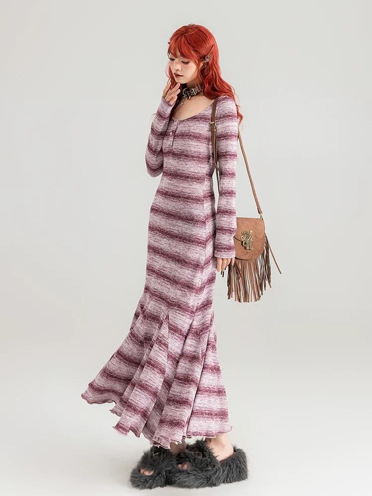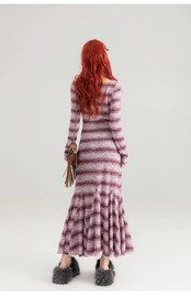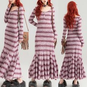 紫 チェック ボーダー ワンピース ゆったり マキシ スカート