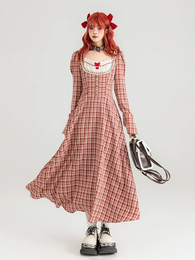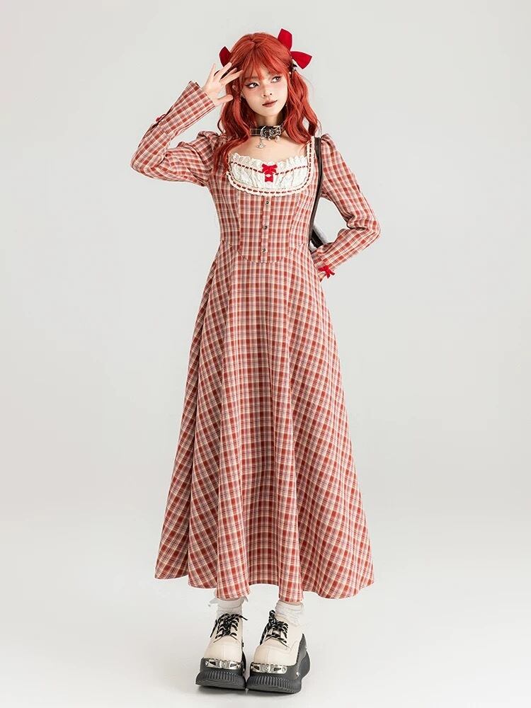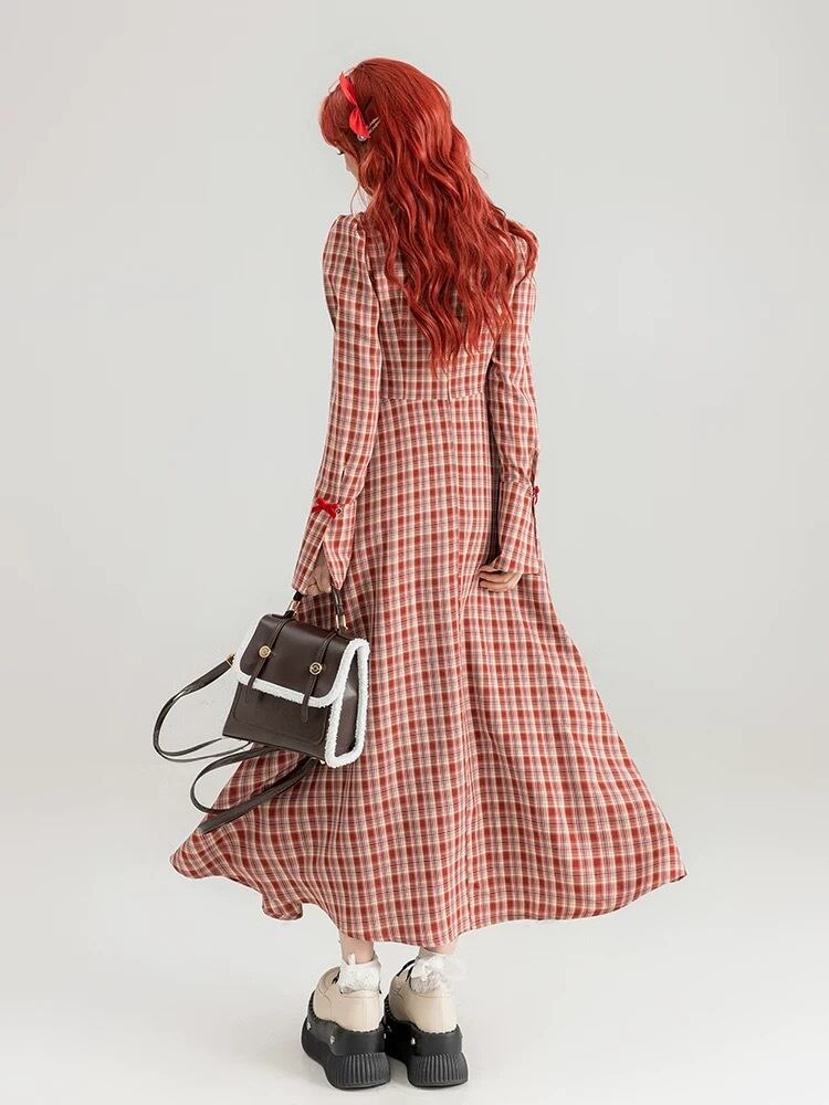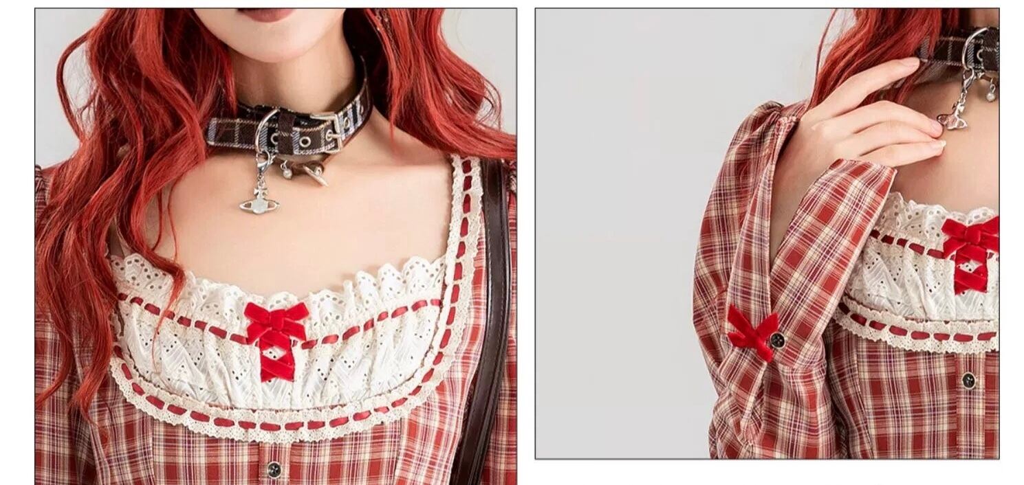 赤 チェック ワンピース ブラウス リボン ガーリー ゆったり