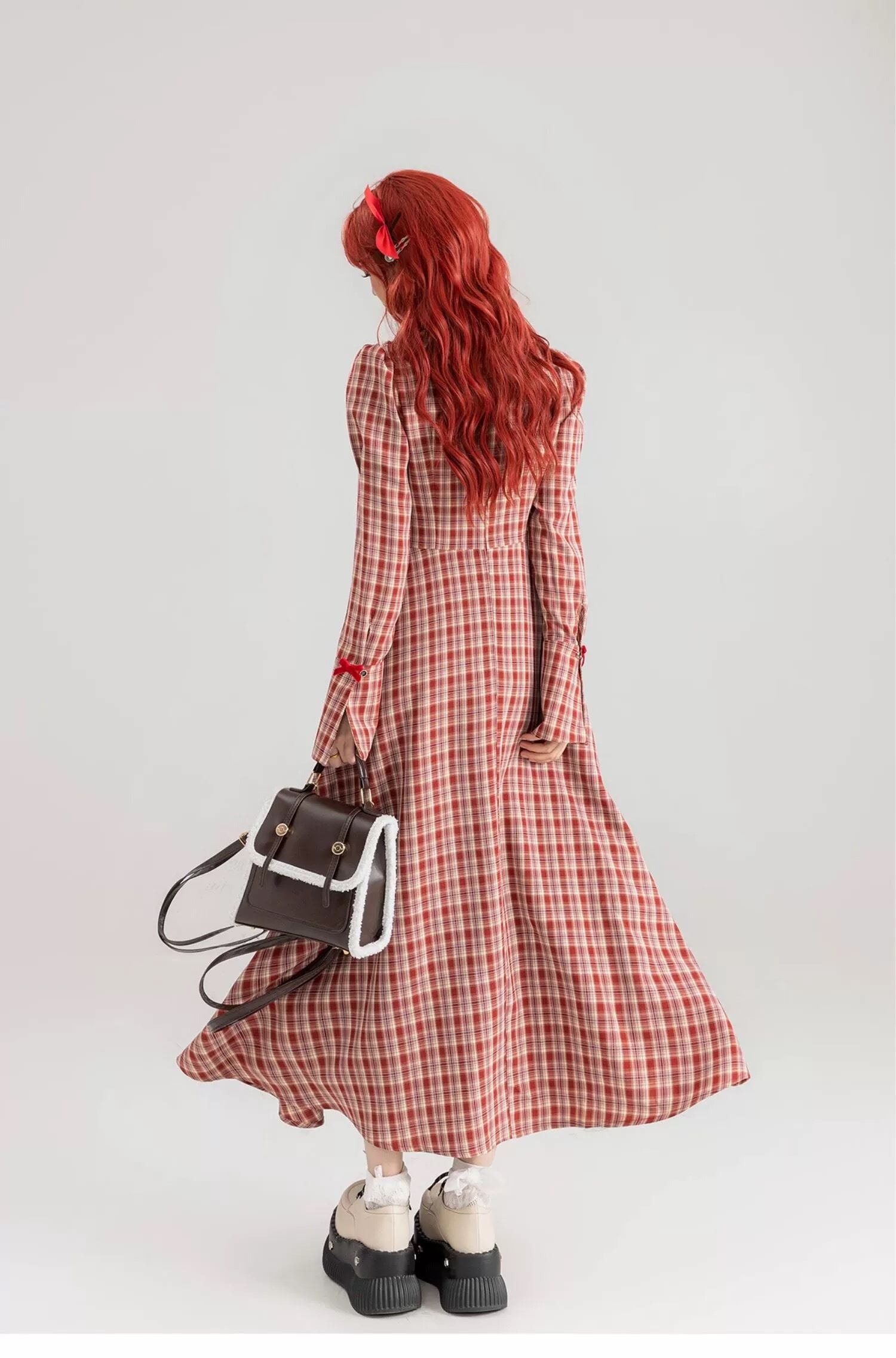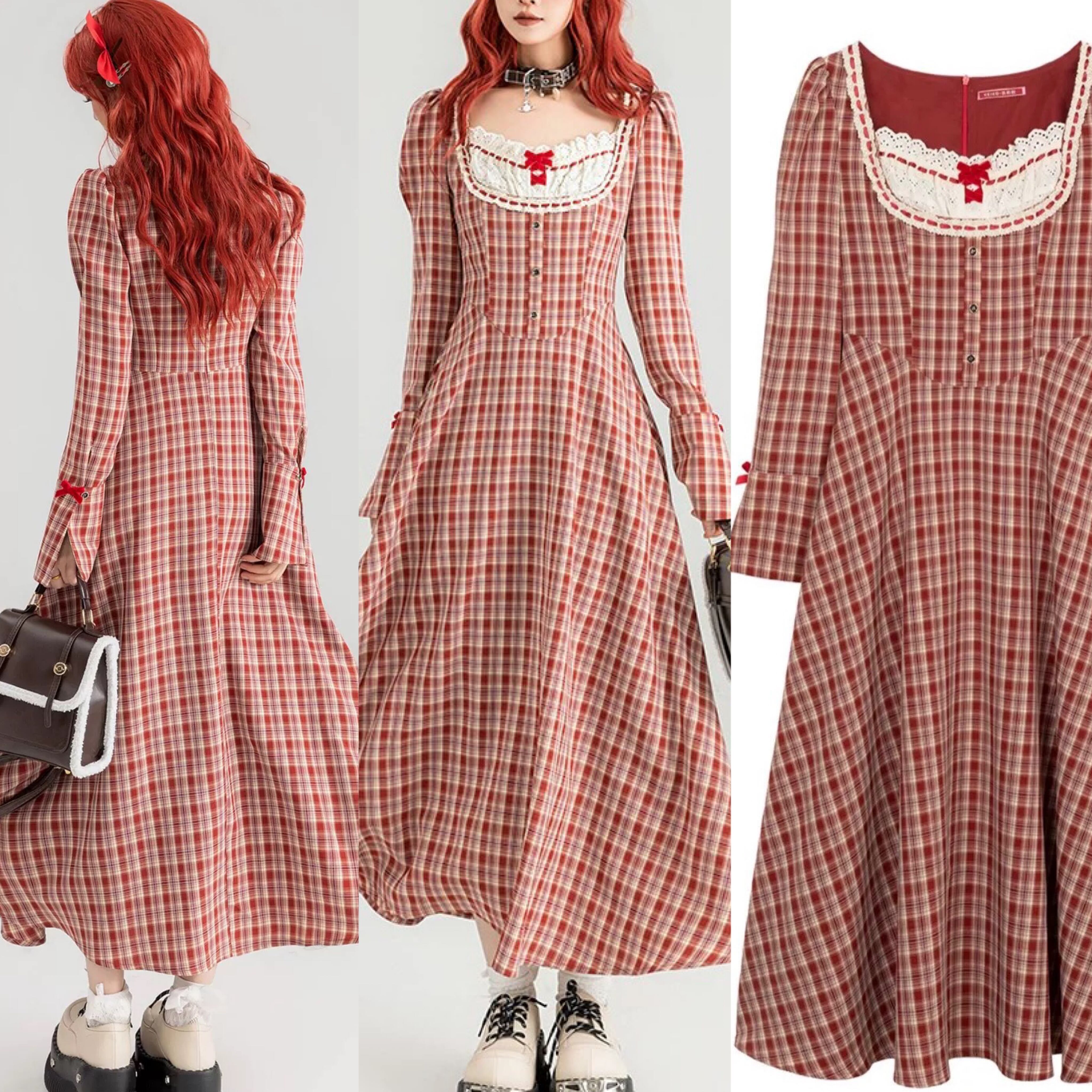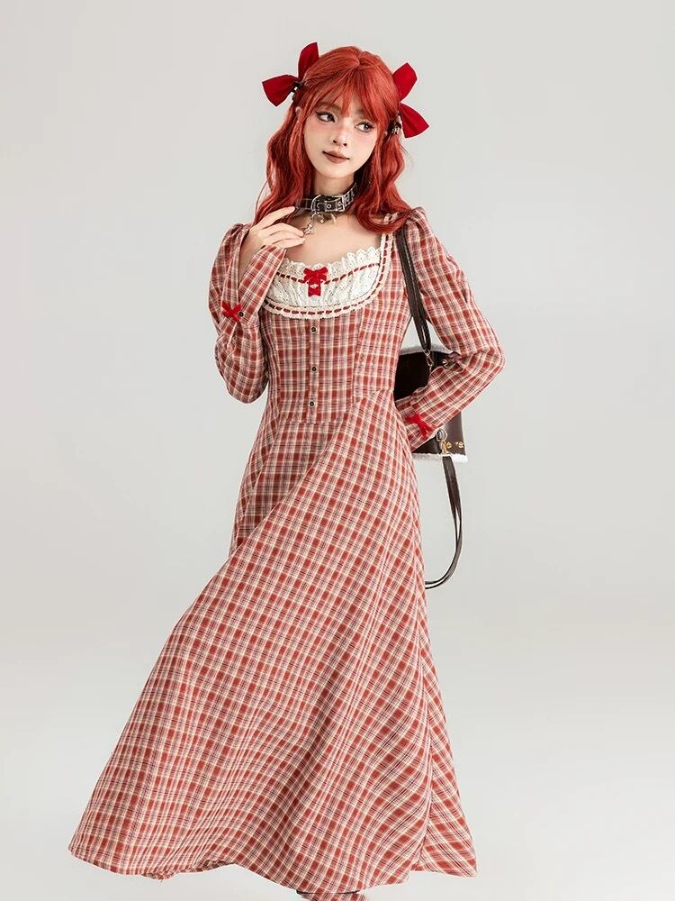 赤 チェック ワンピース ブラウス リボン ガーリー ゆったり
