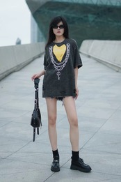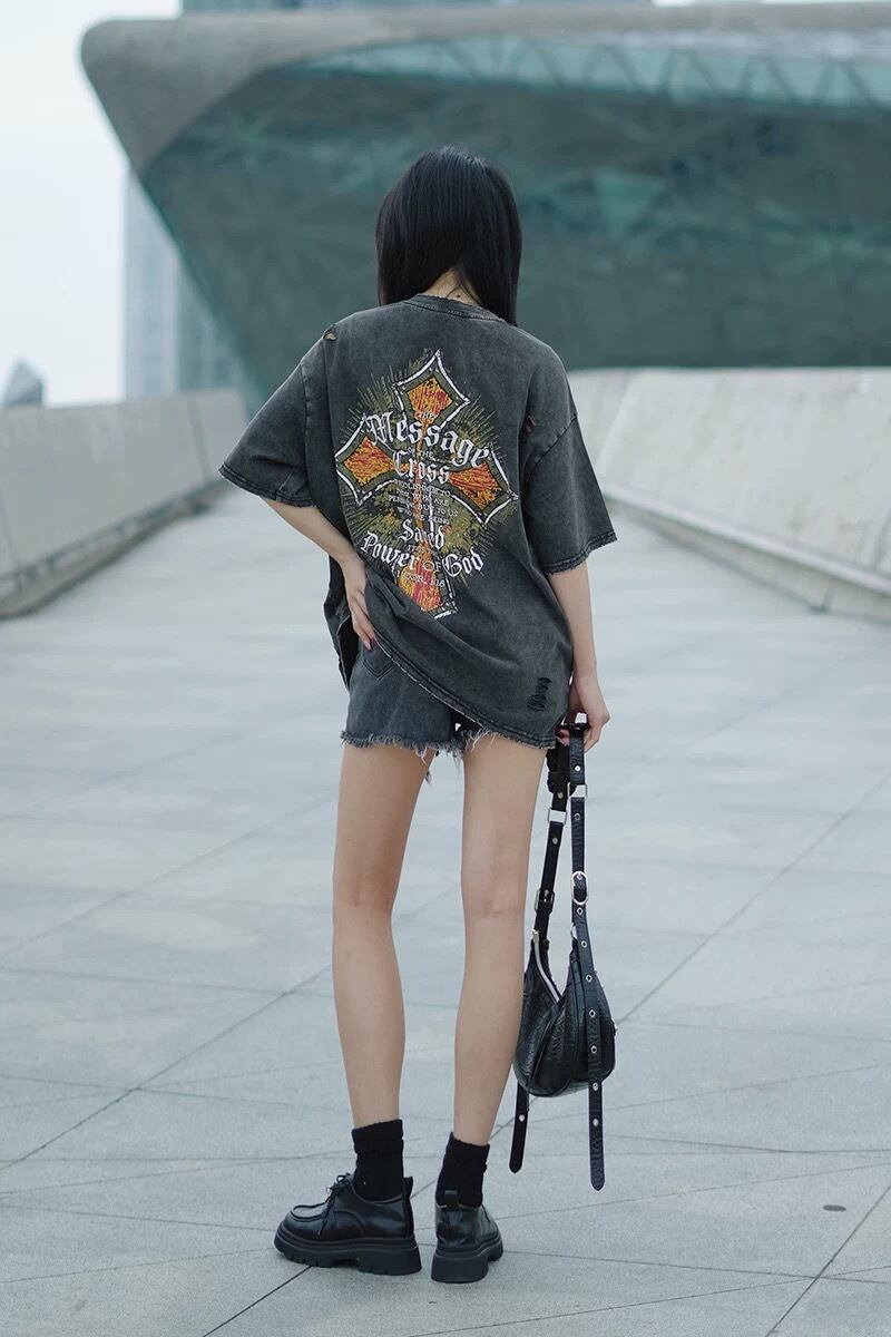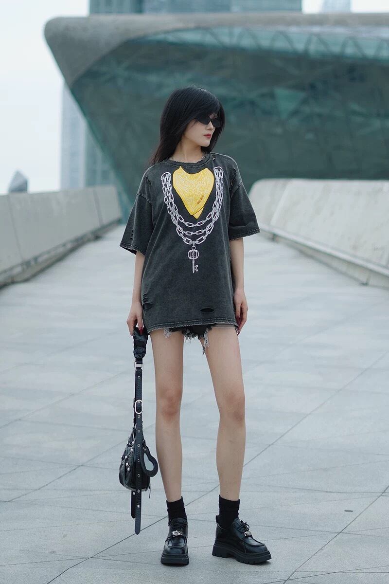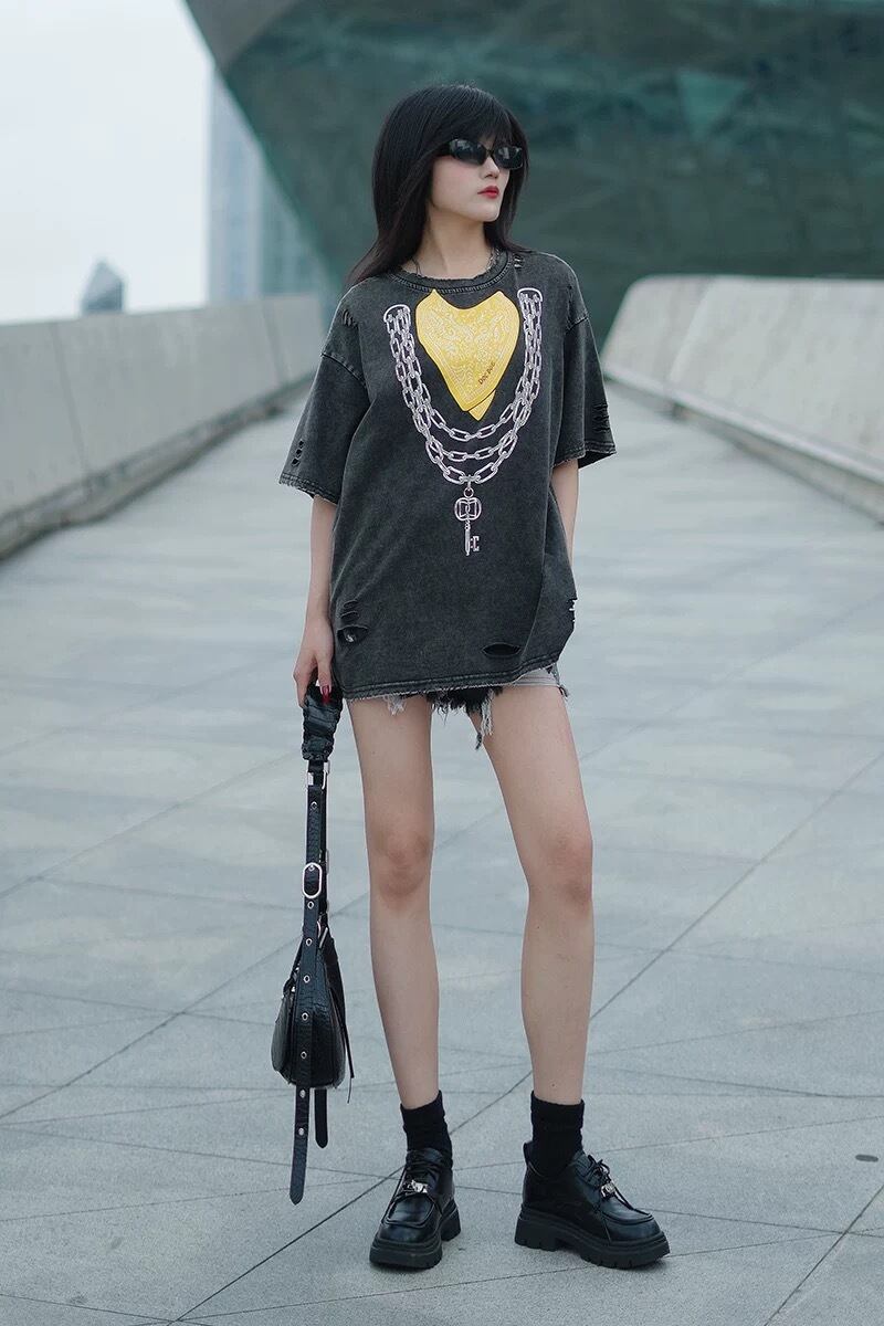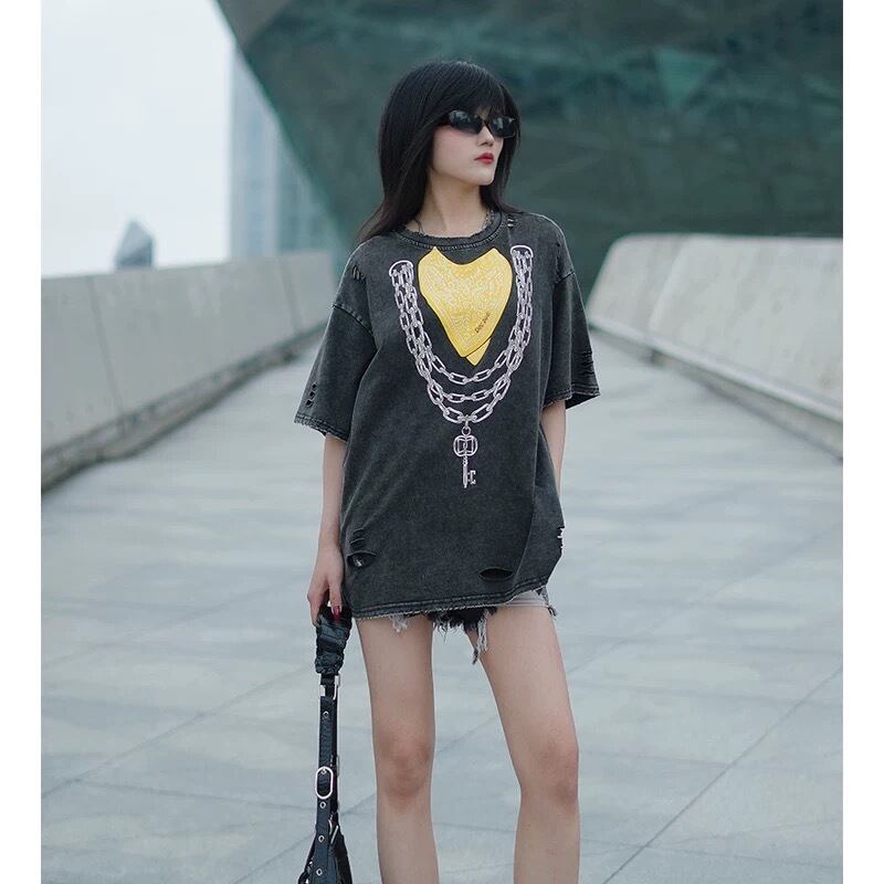 トップス Tシャツ クロス ロック カジュアル 黄色 ハート クロス チェーン