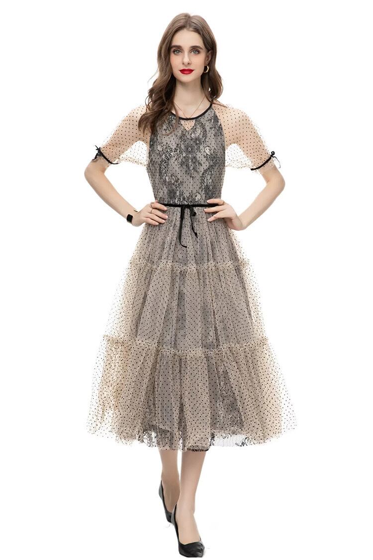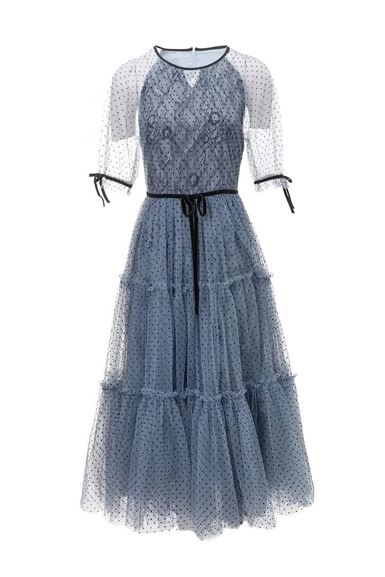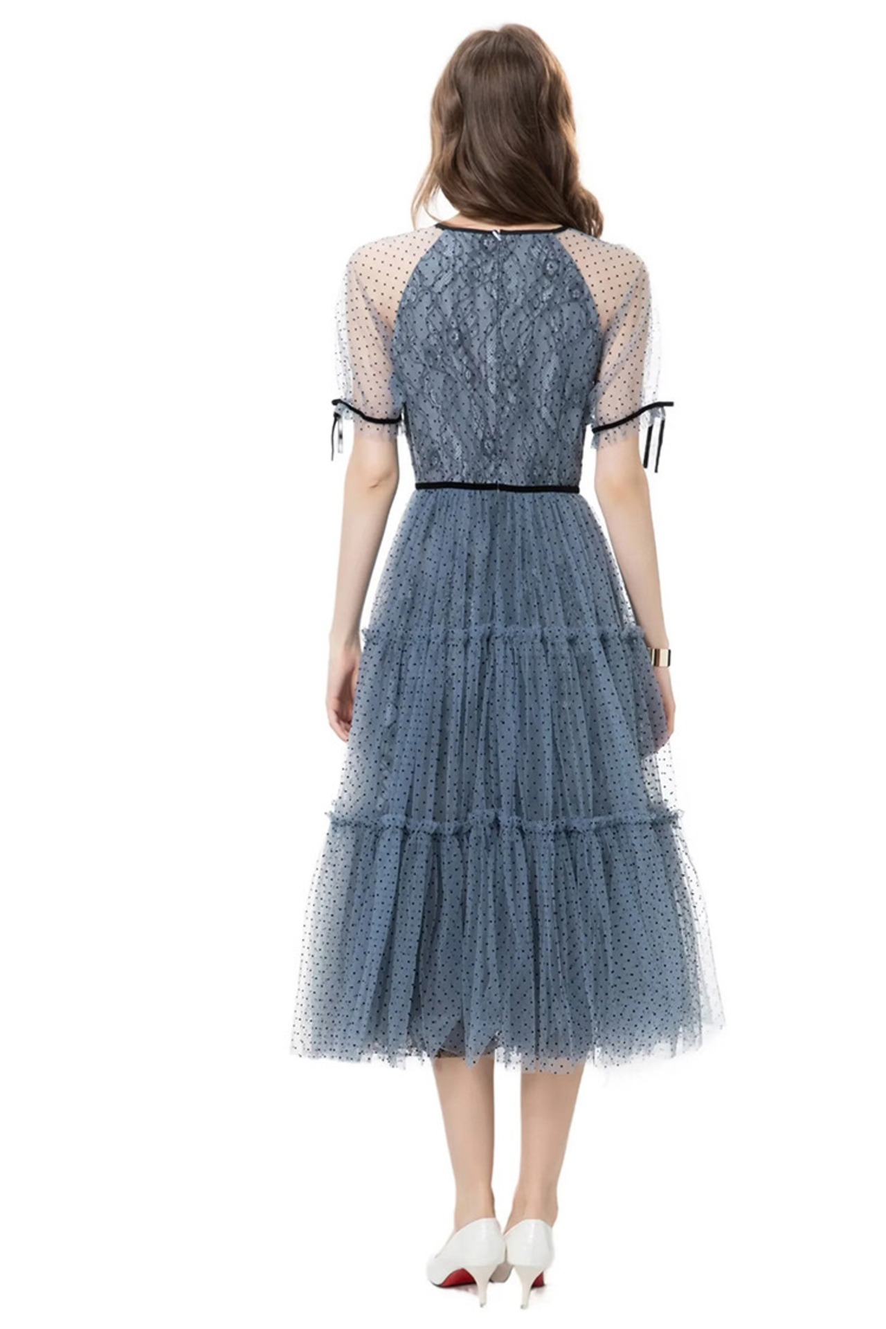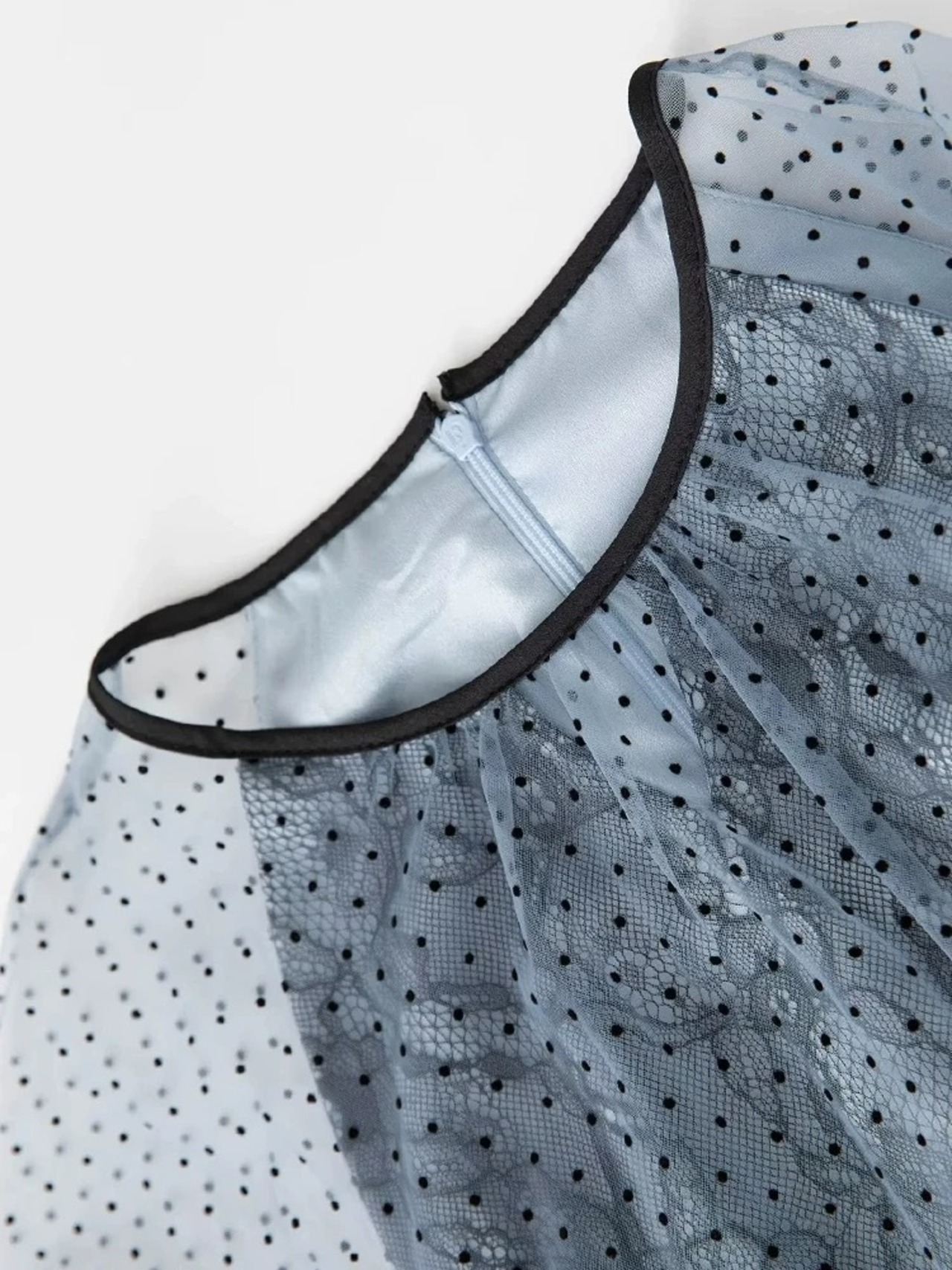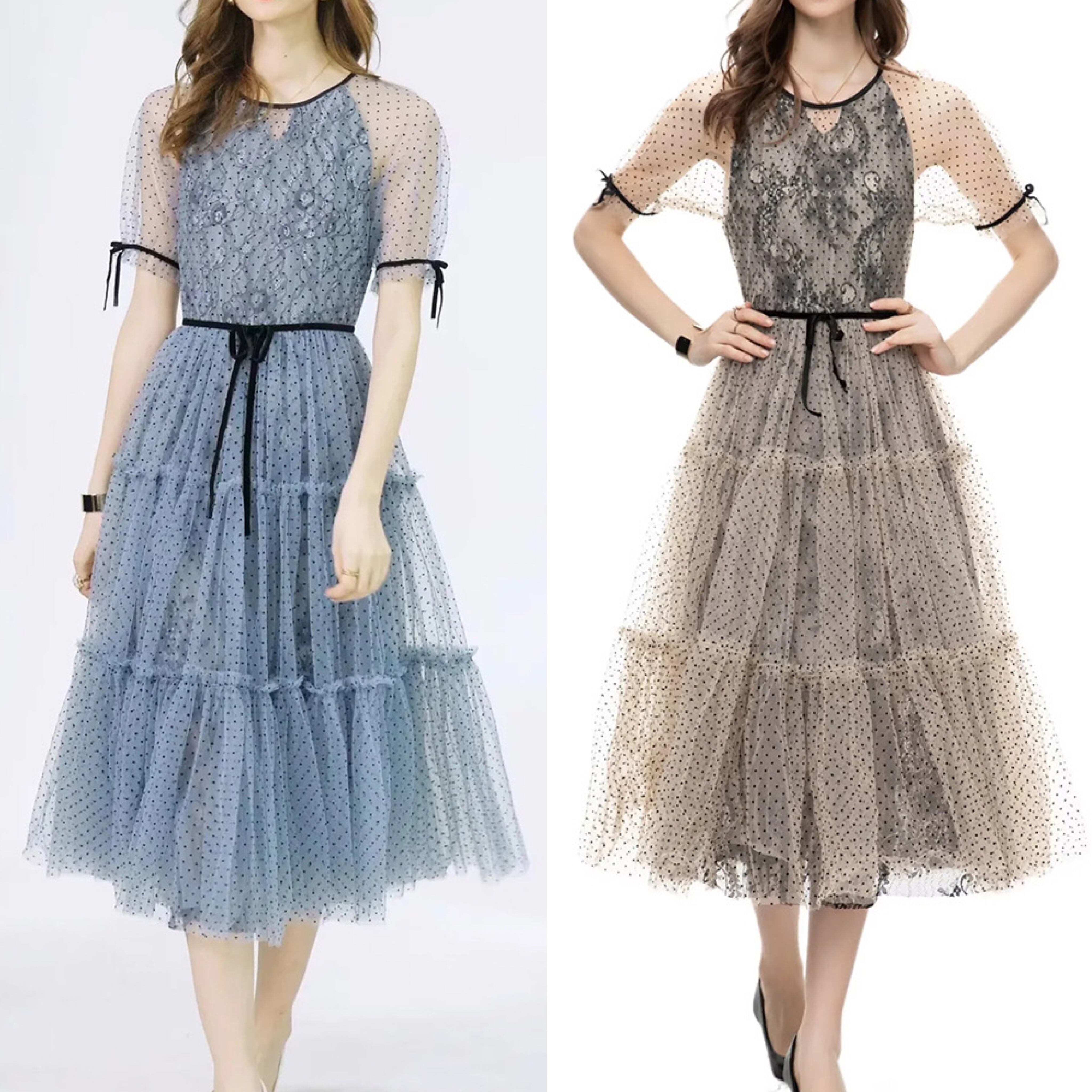 水玉 ドレス 水色 ベージュ ドット ワンピース リボン エレガント ブラウス ガーリー