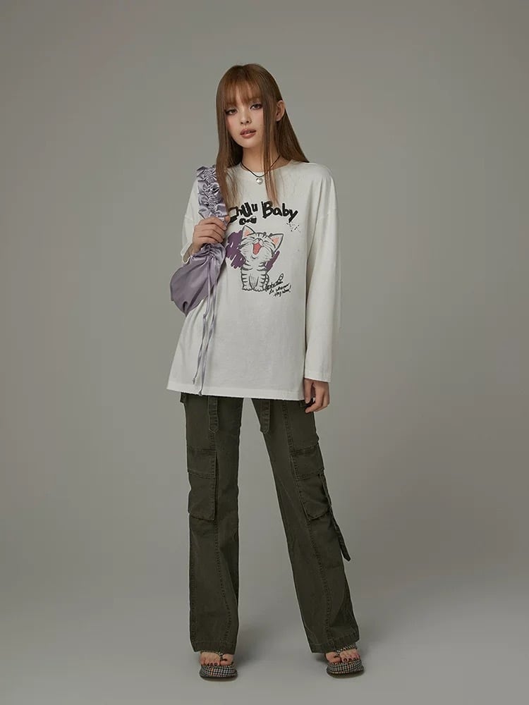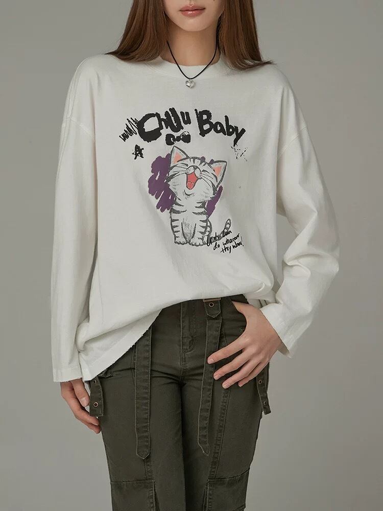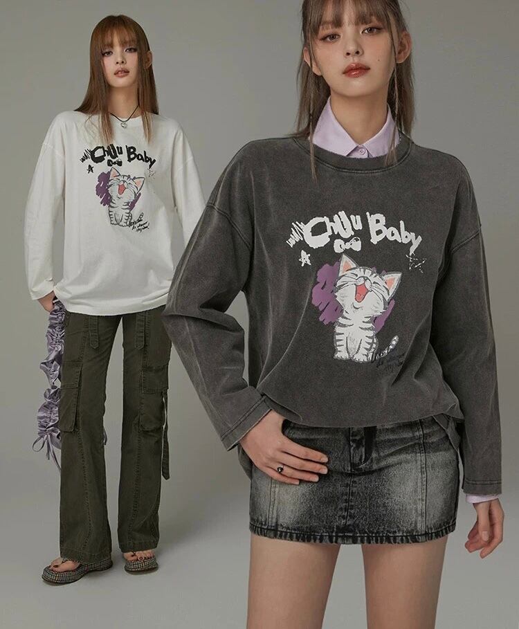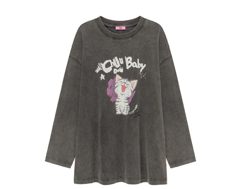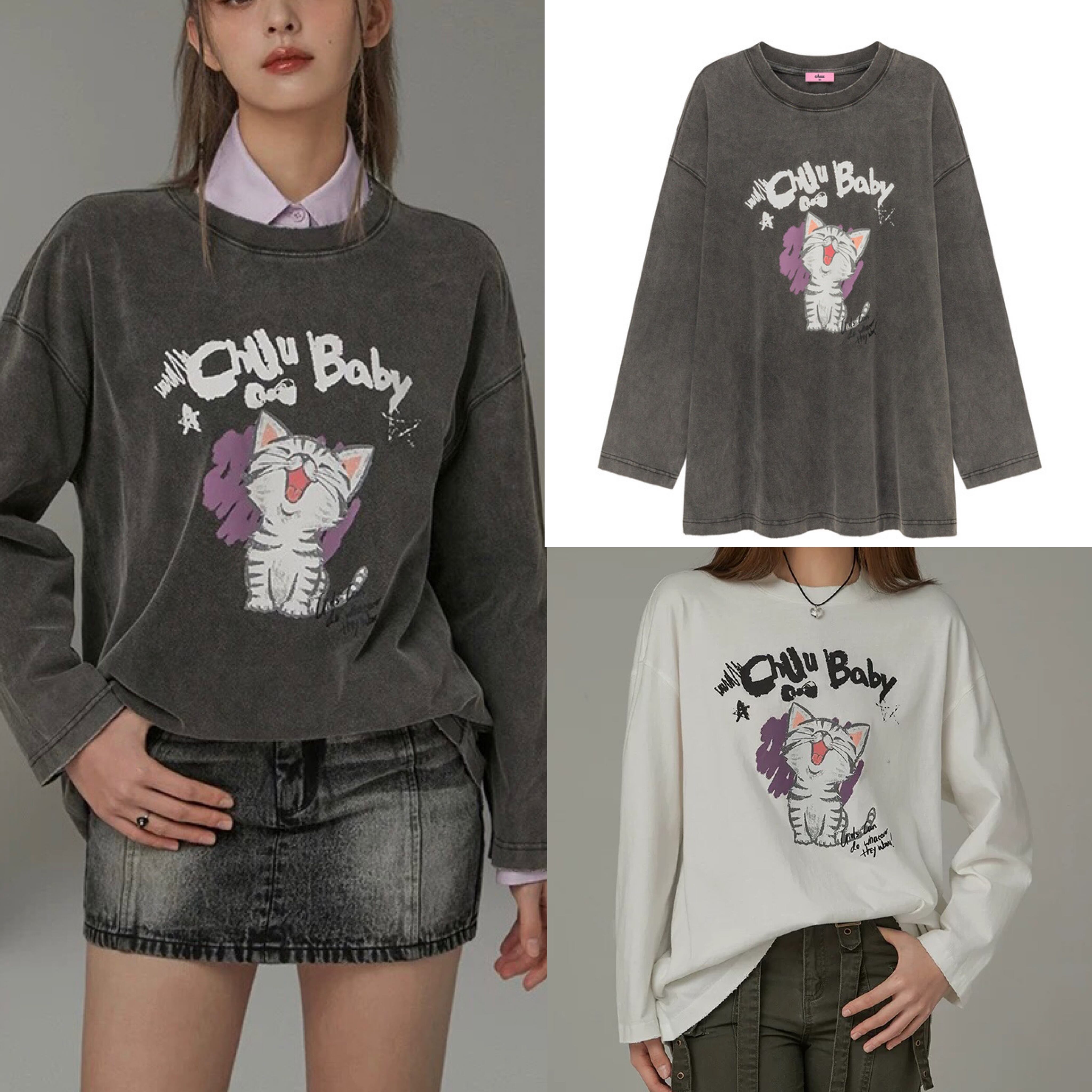 スウェット ねこ グレー トップス 白 可愛い ガーリー ブラウス Tシャツ ロンT