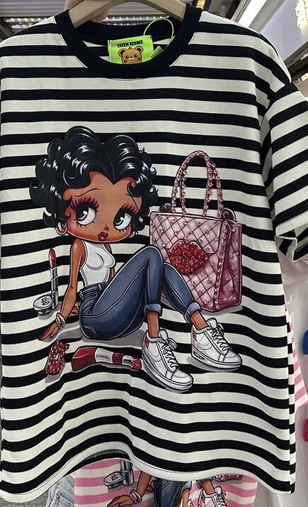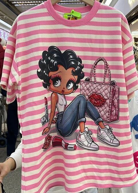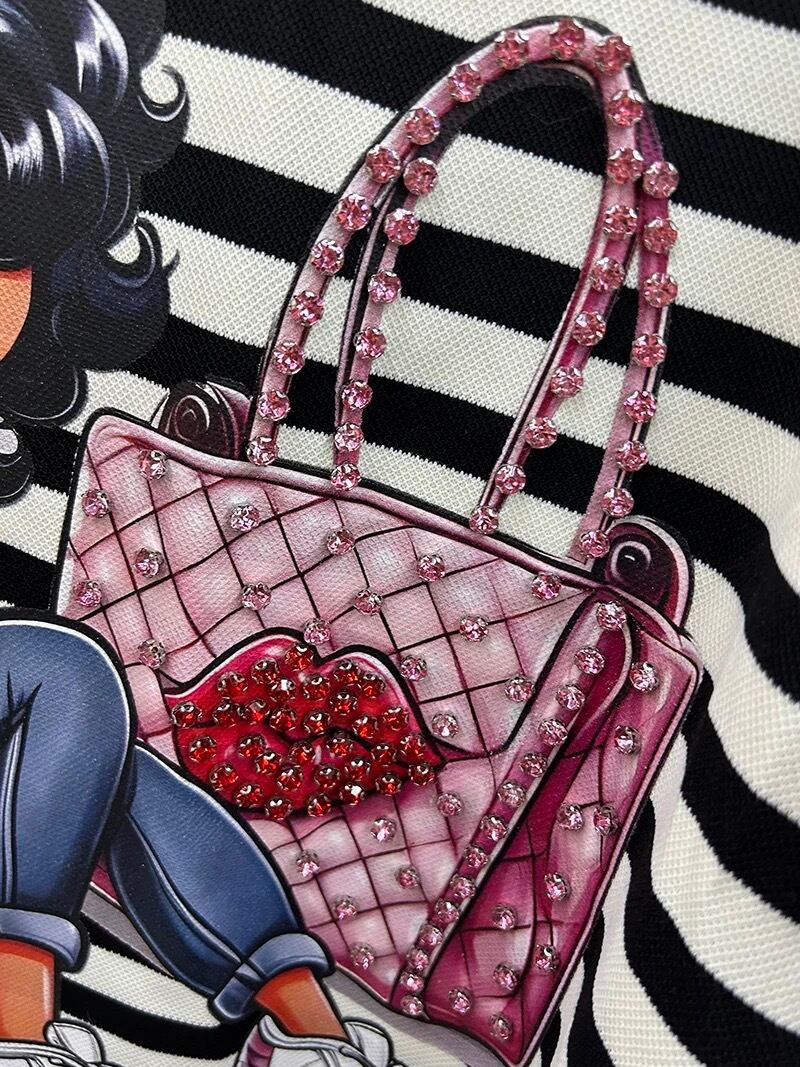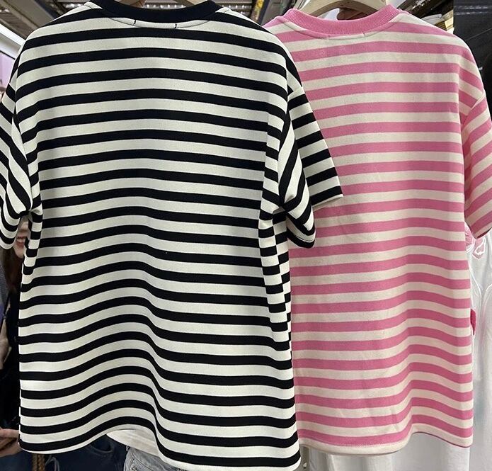 ボーダー トップス Tシャツ ピンク 黒 チェック ロンT ラインストーン パール キラキラ 可愛い ピンク デコレーション