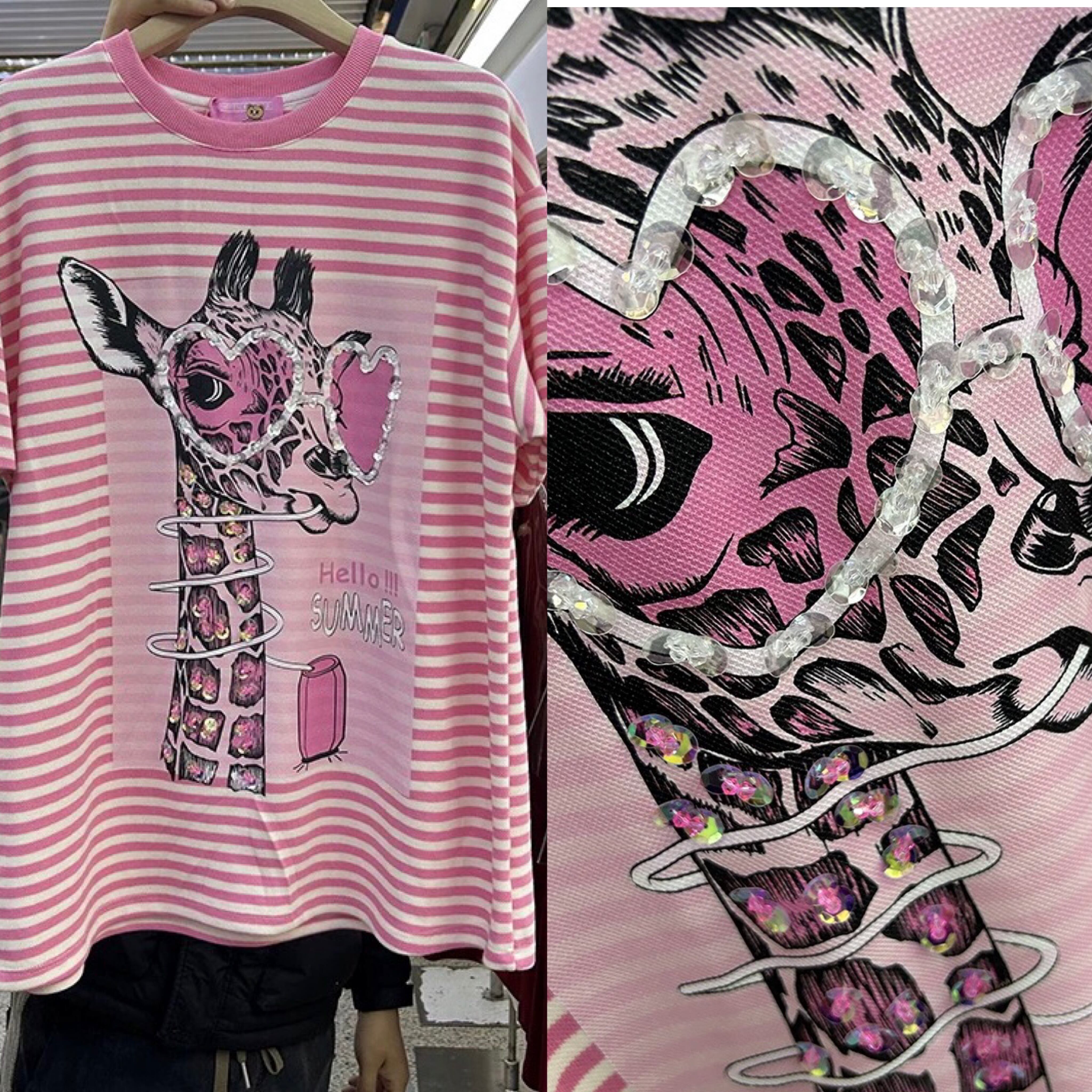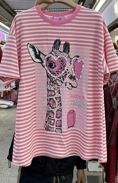 ハート きりん アニマル ボーダー トップス Tシャツ ピンク 黒 チェック ロンT ラインストーン パール キラキラ 可愛い ピンク デコレーション