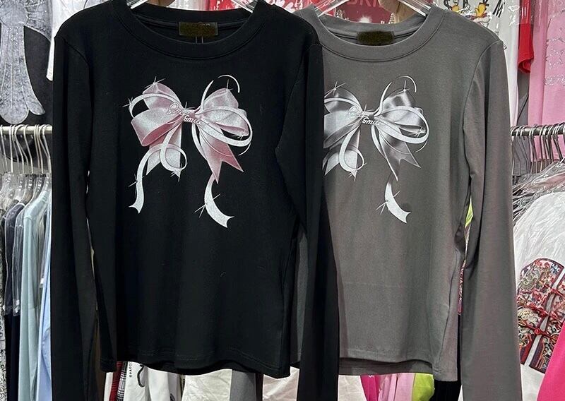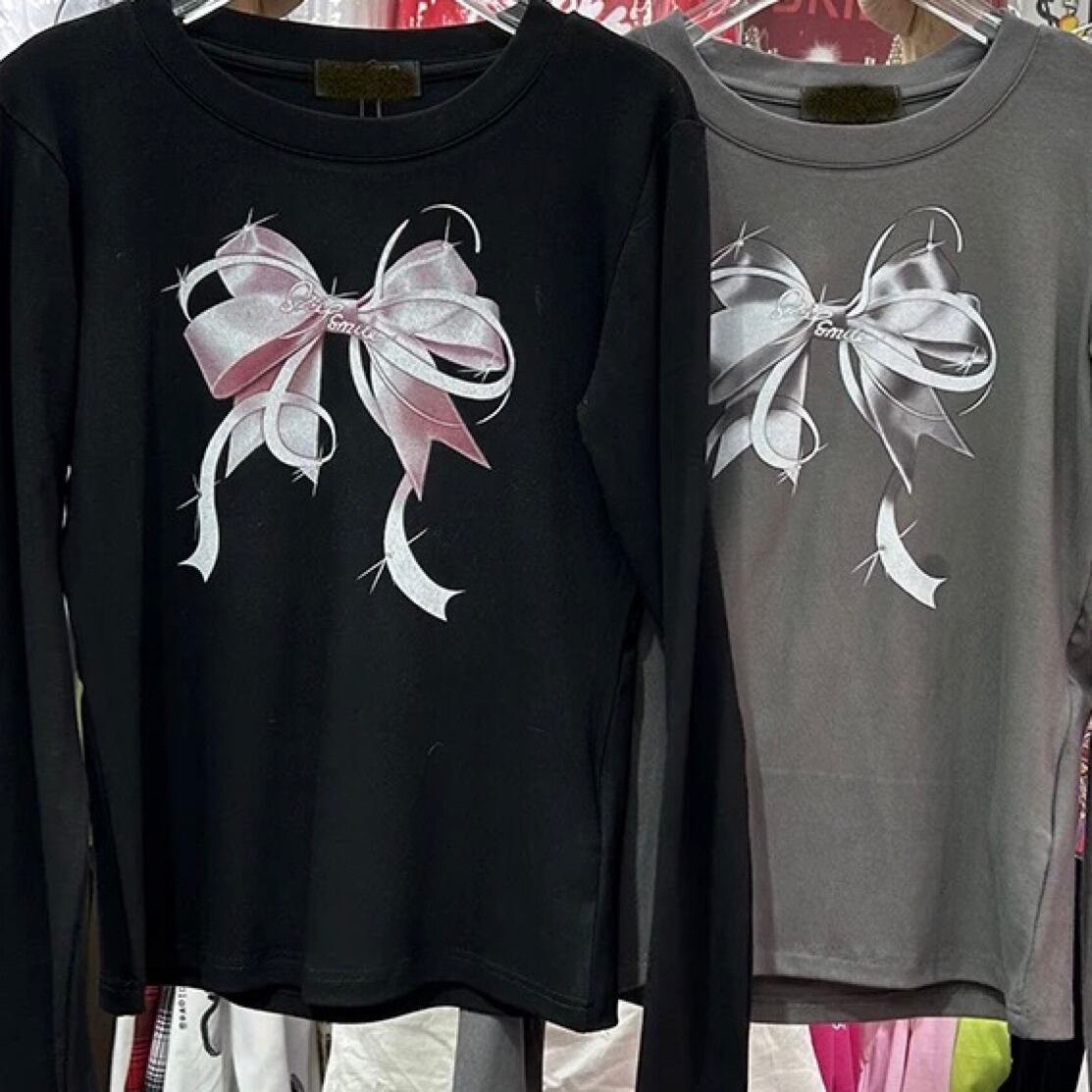 トップス 黒 グレー リボン ピンク カジュアル ブラウス ロンT