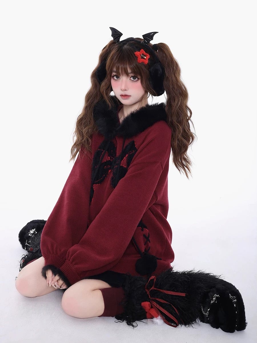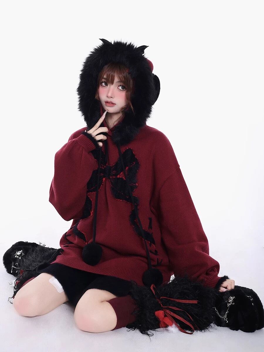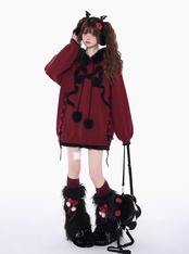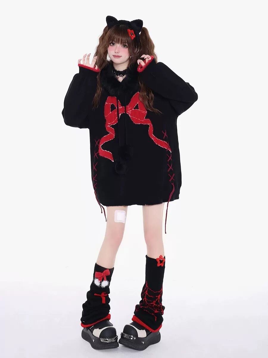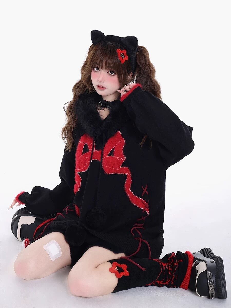 赤 黒 パーカー トレーナー セーター スウェット リボン ガーリー ゆったり