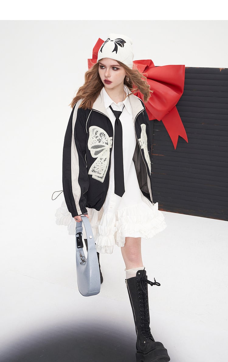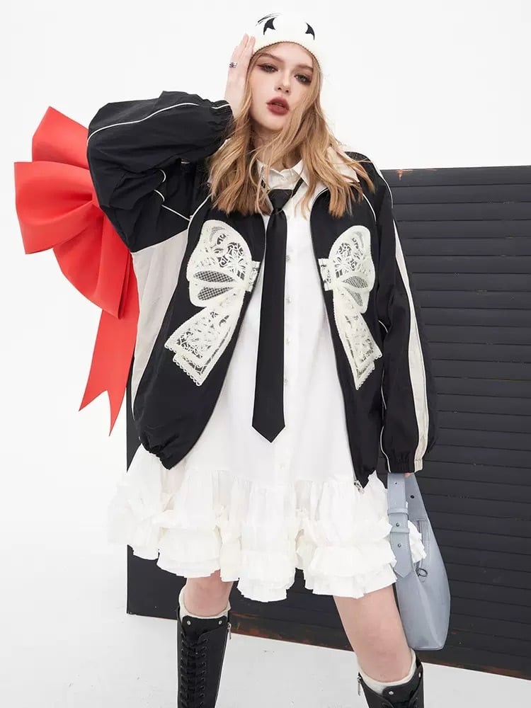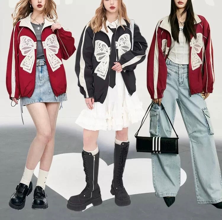 ジャケット ジャンパー カーディガン アウター コート 赤 リボン 黒 スウェット ジャージ リボン 可愛い ストリート