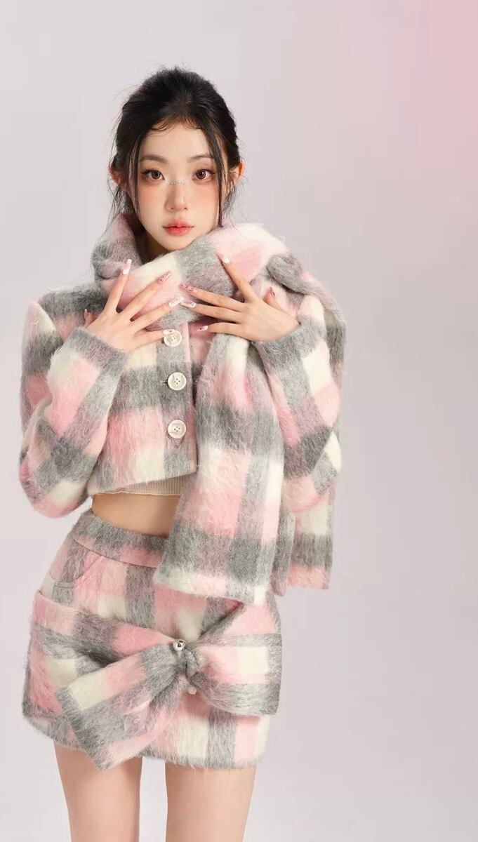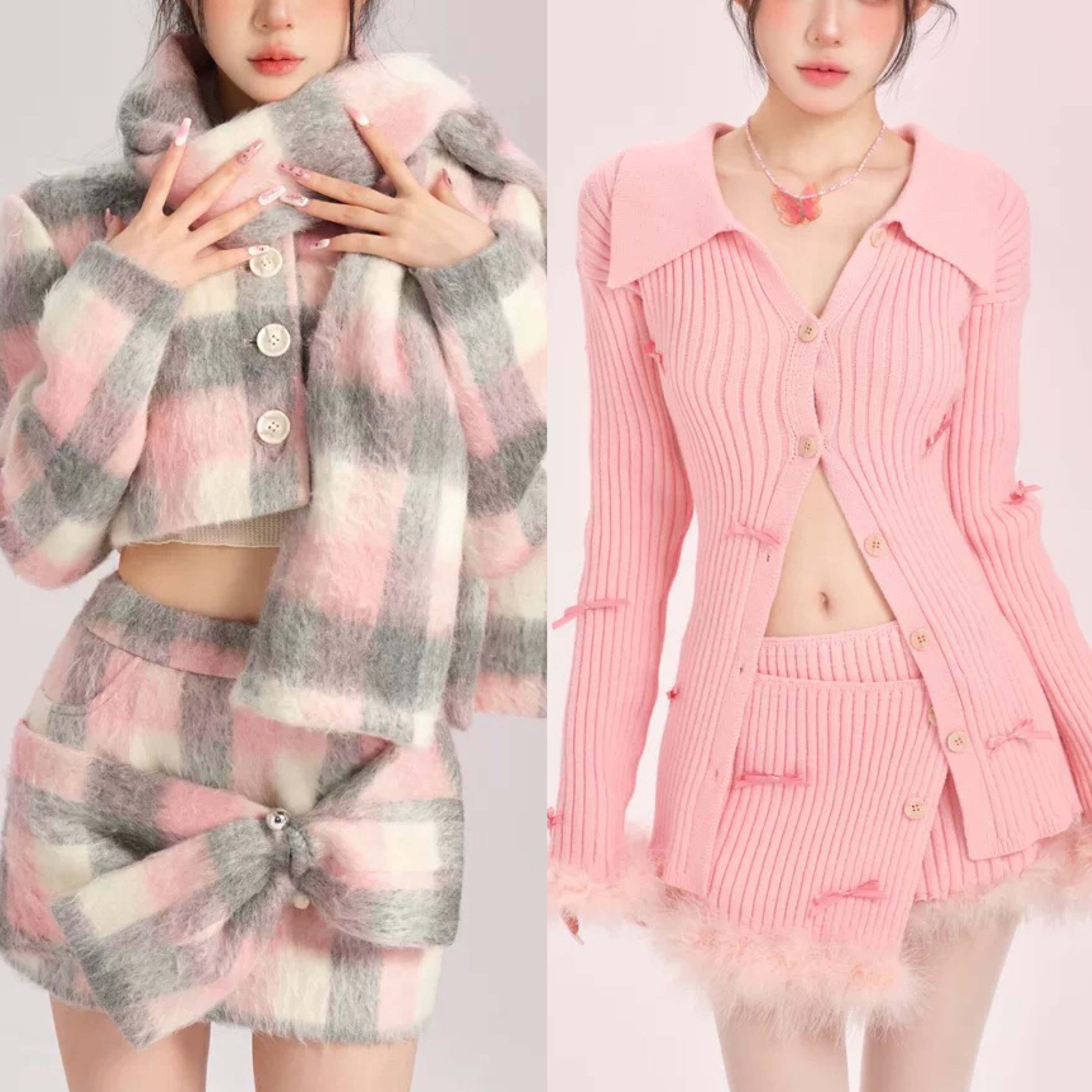 【セットアップ】カーディガン スカート スーツ チェック リボン 姫 ガーリー ピンク 可愛い