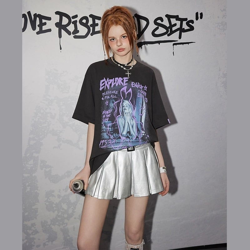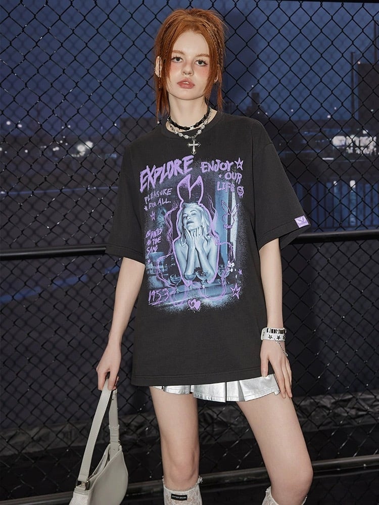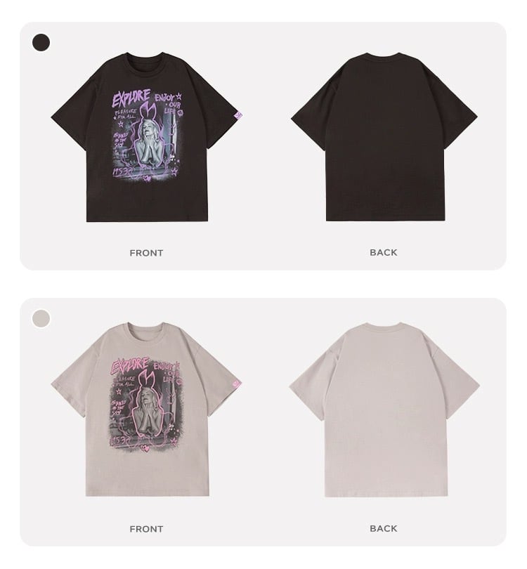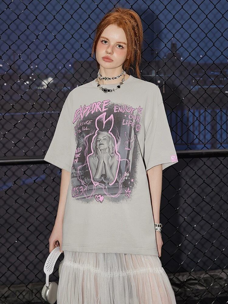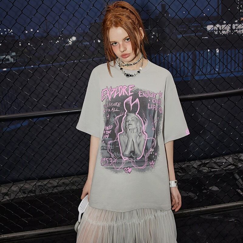 黒 グレー 紫 ピンク 落書き Tシャツ トップス 黒 ピンク ストリート カジュアル ブラウス スウェット