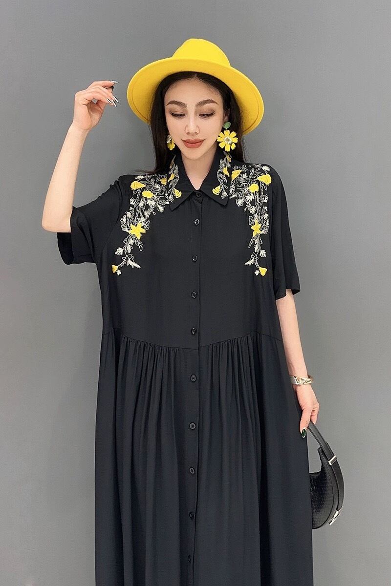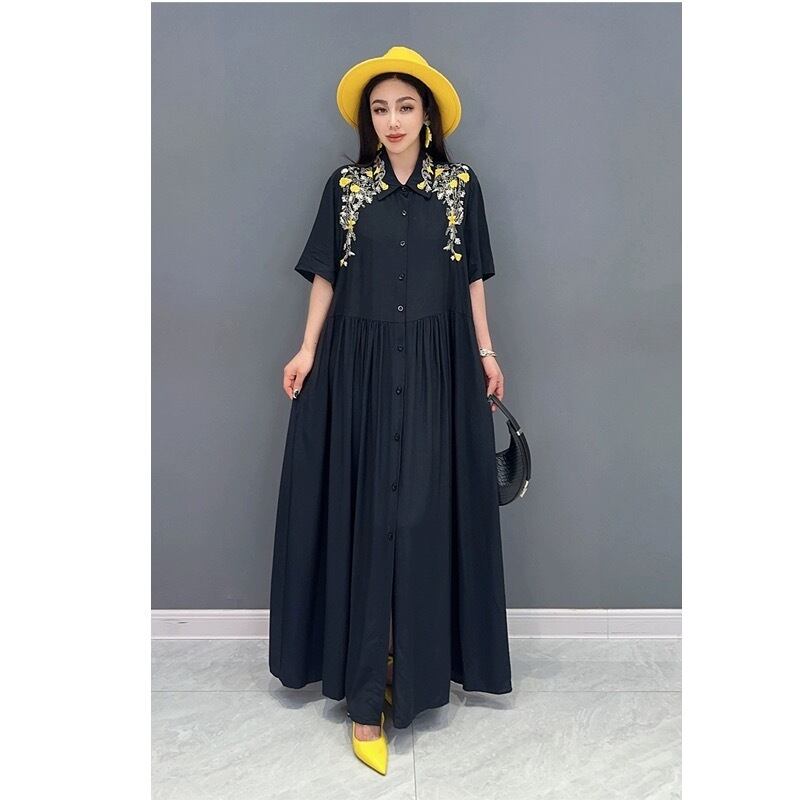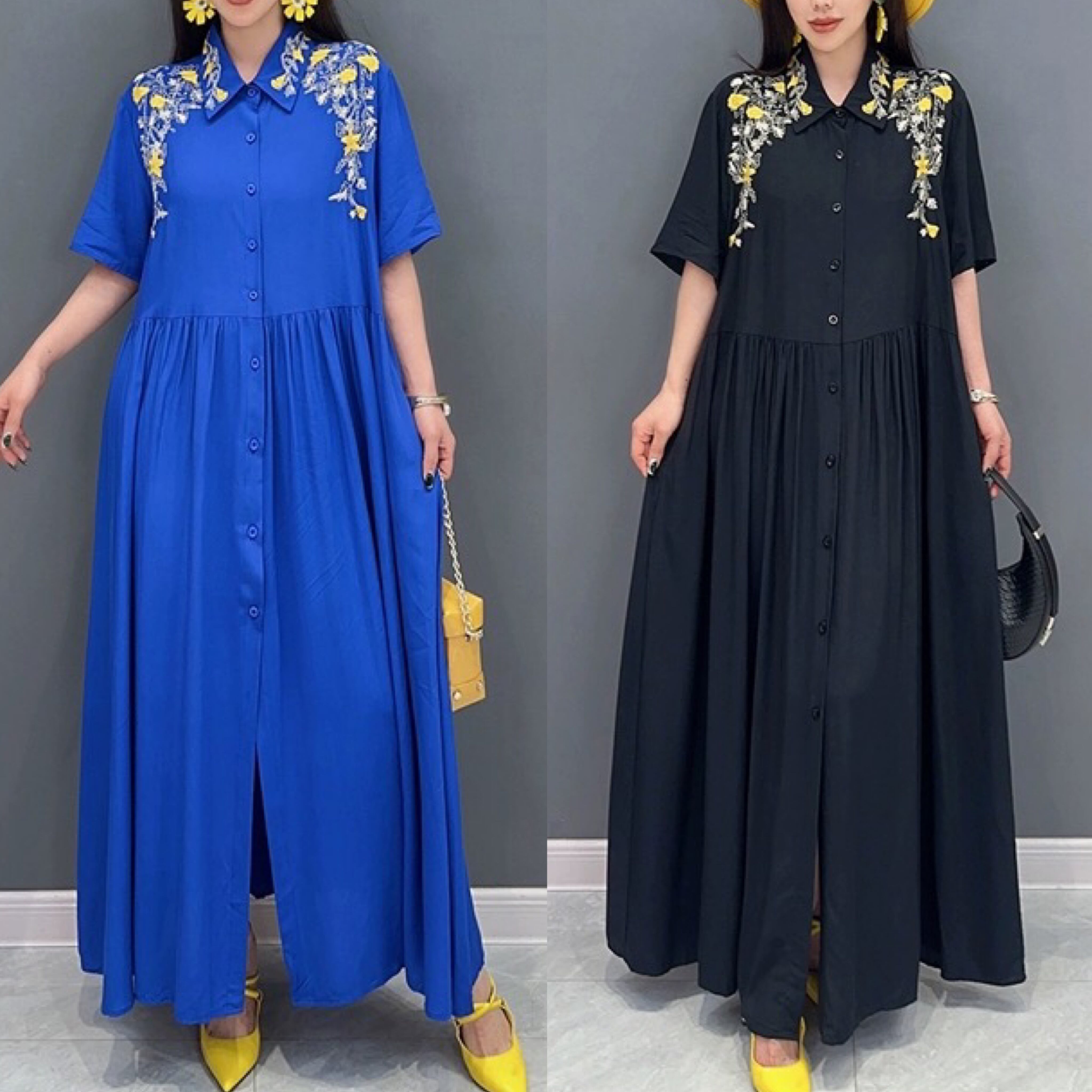 黒 青 ブラウス ワンピース マキシ ゆったり XL カジュアル フラワー 黄色