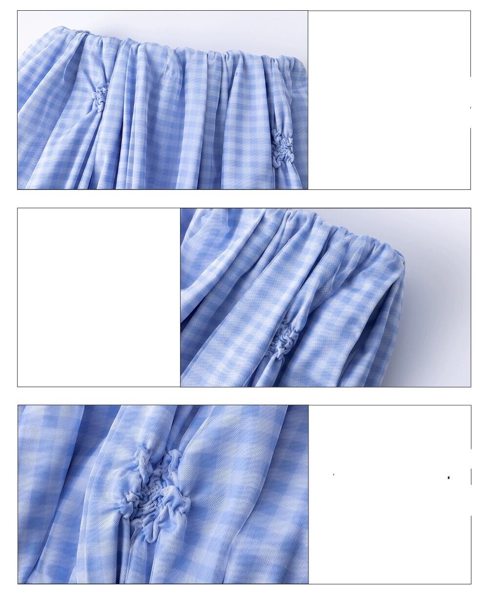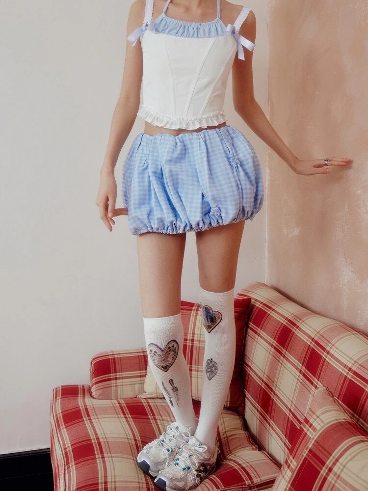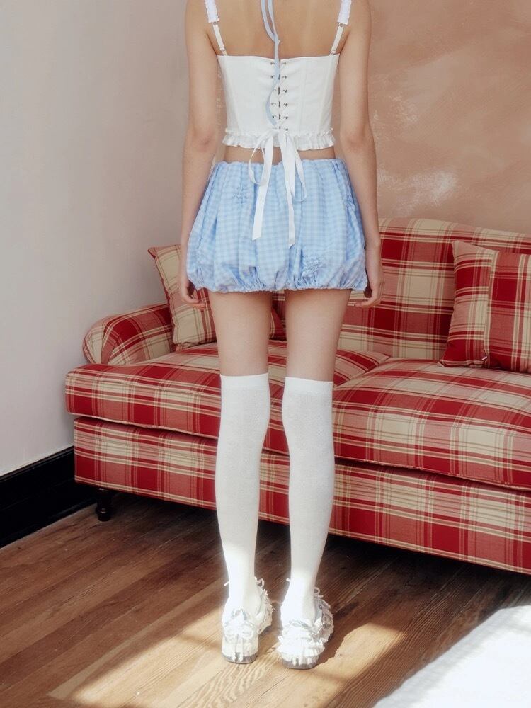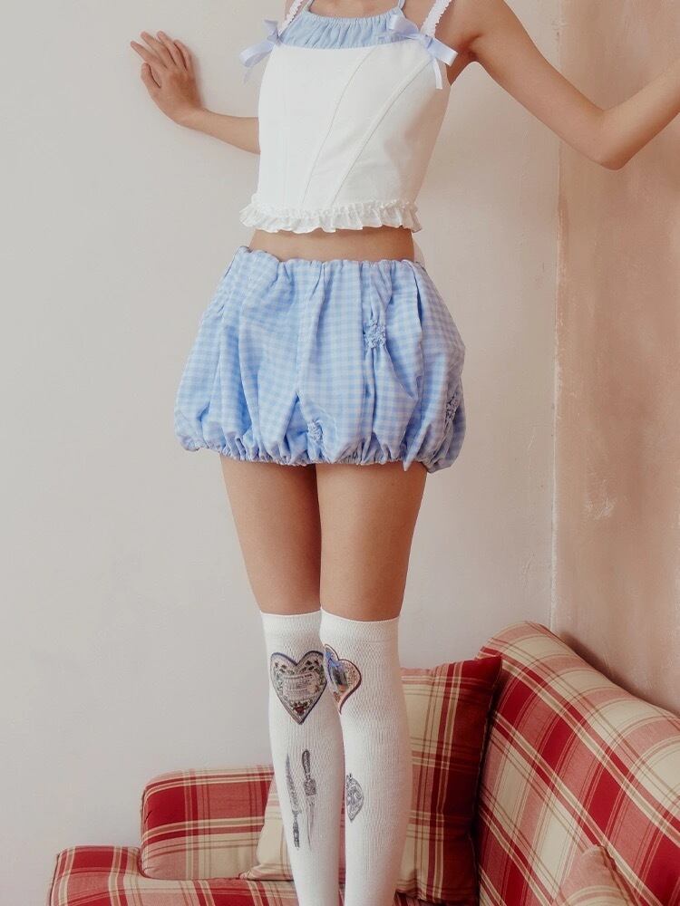 スカート チェック 水色 ボトムス ミニスカート ガーリー カジュアル 可愛い バルーン