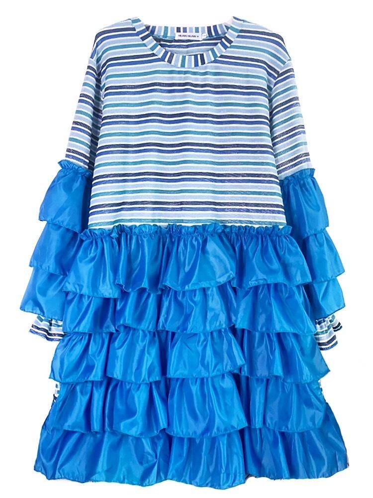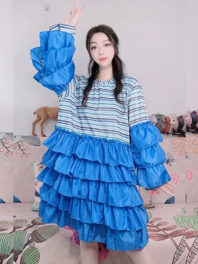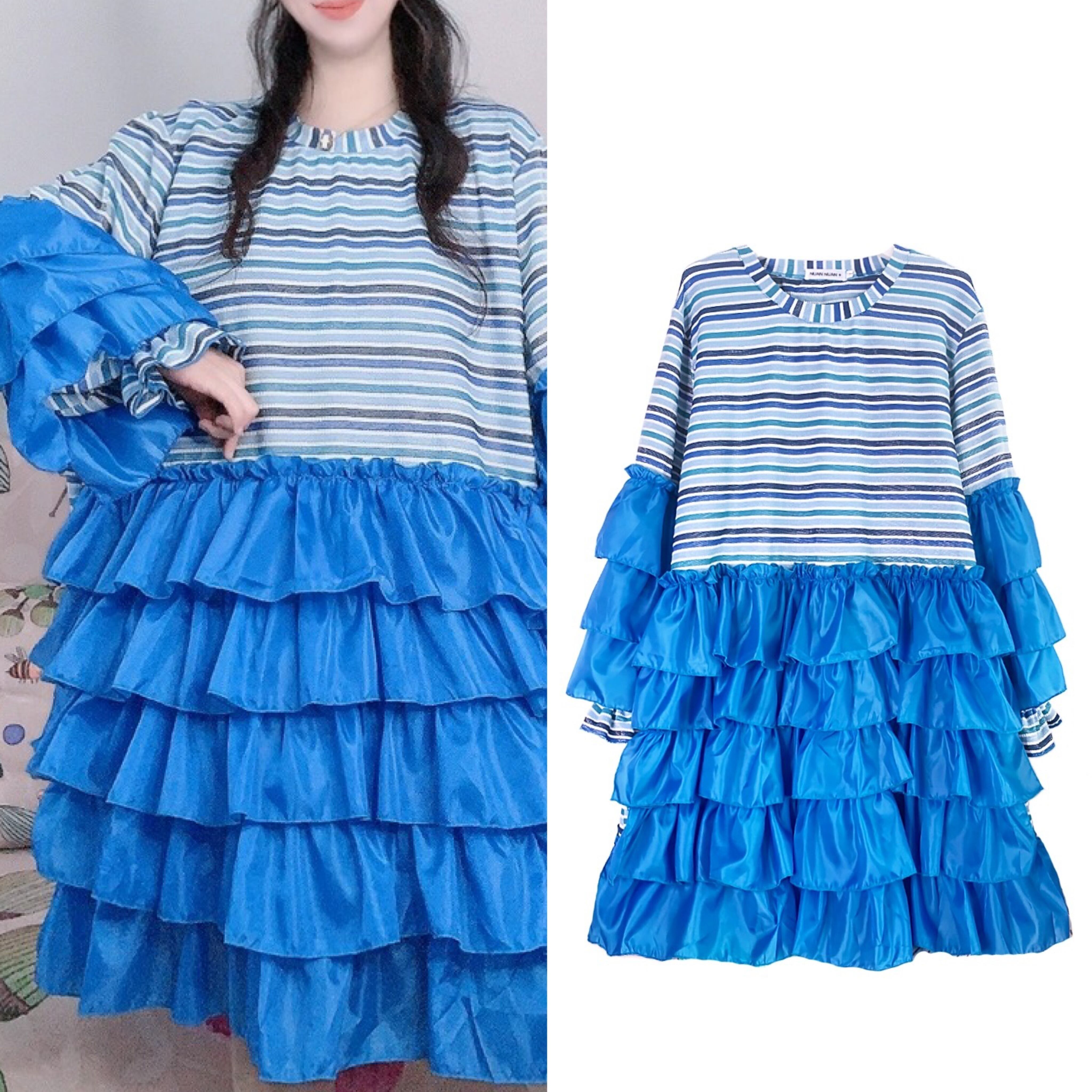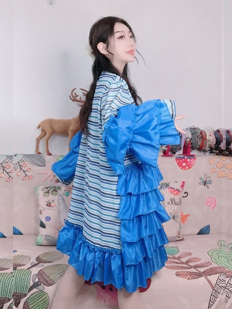 水色 ゆったり カジュアル スウェット フリル チェック デコレーション ワンピース トップス ボーダー XL