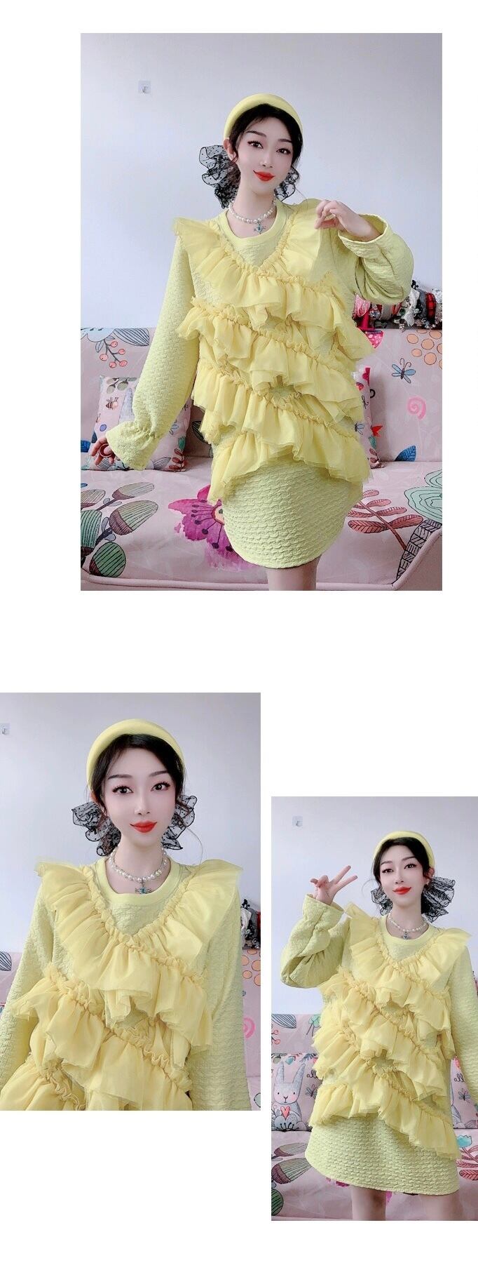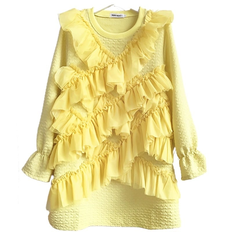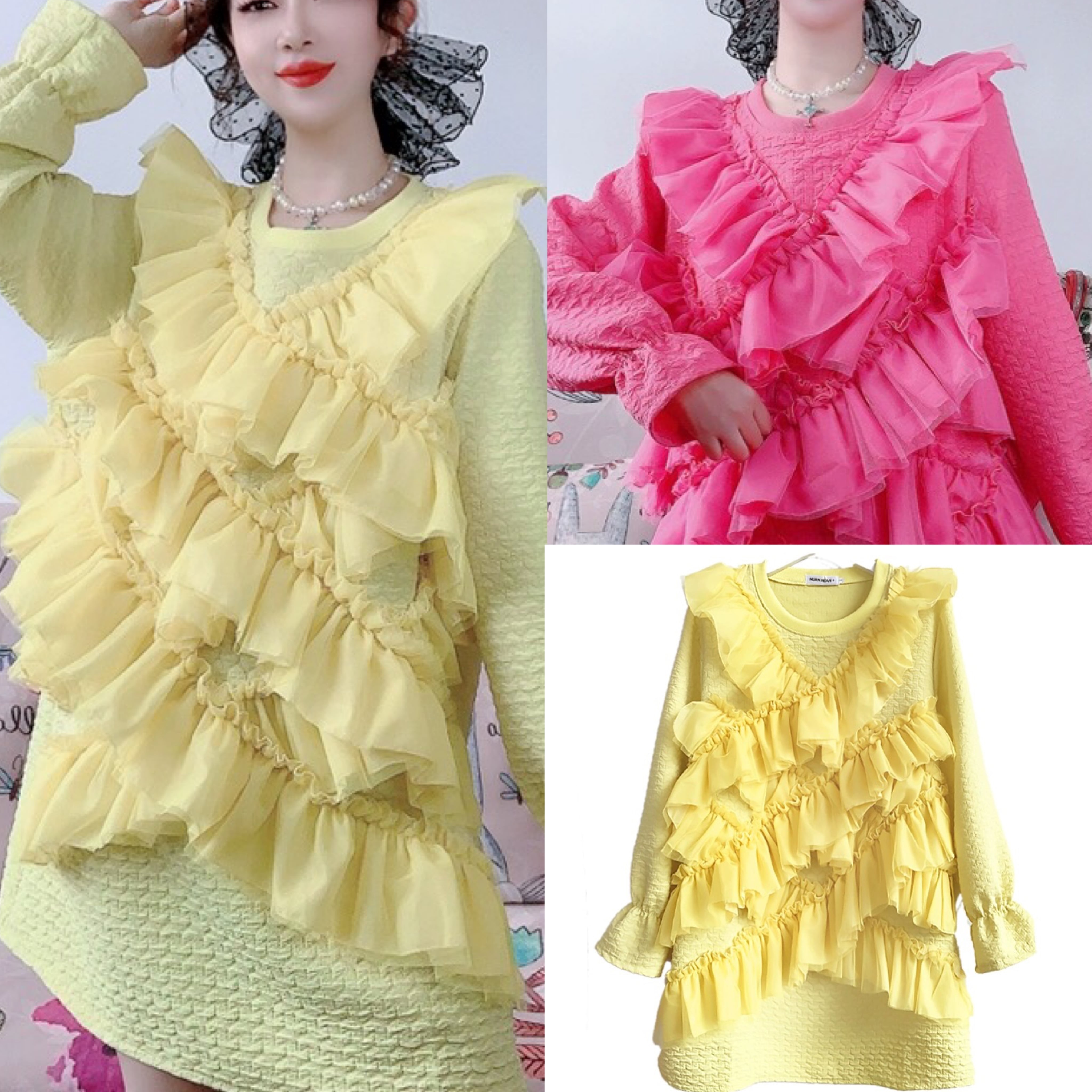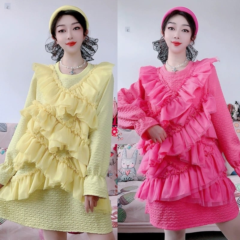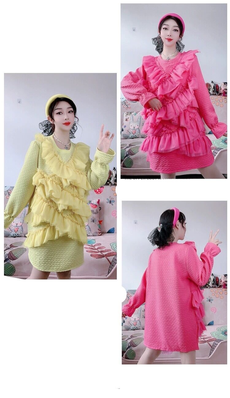 ワンピース ピンク 黄色 スウェット トレーナー フリル カジュアル リボン デコレーション