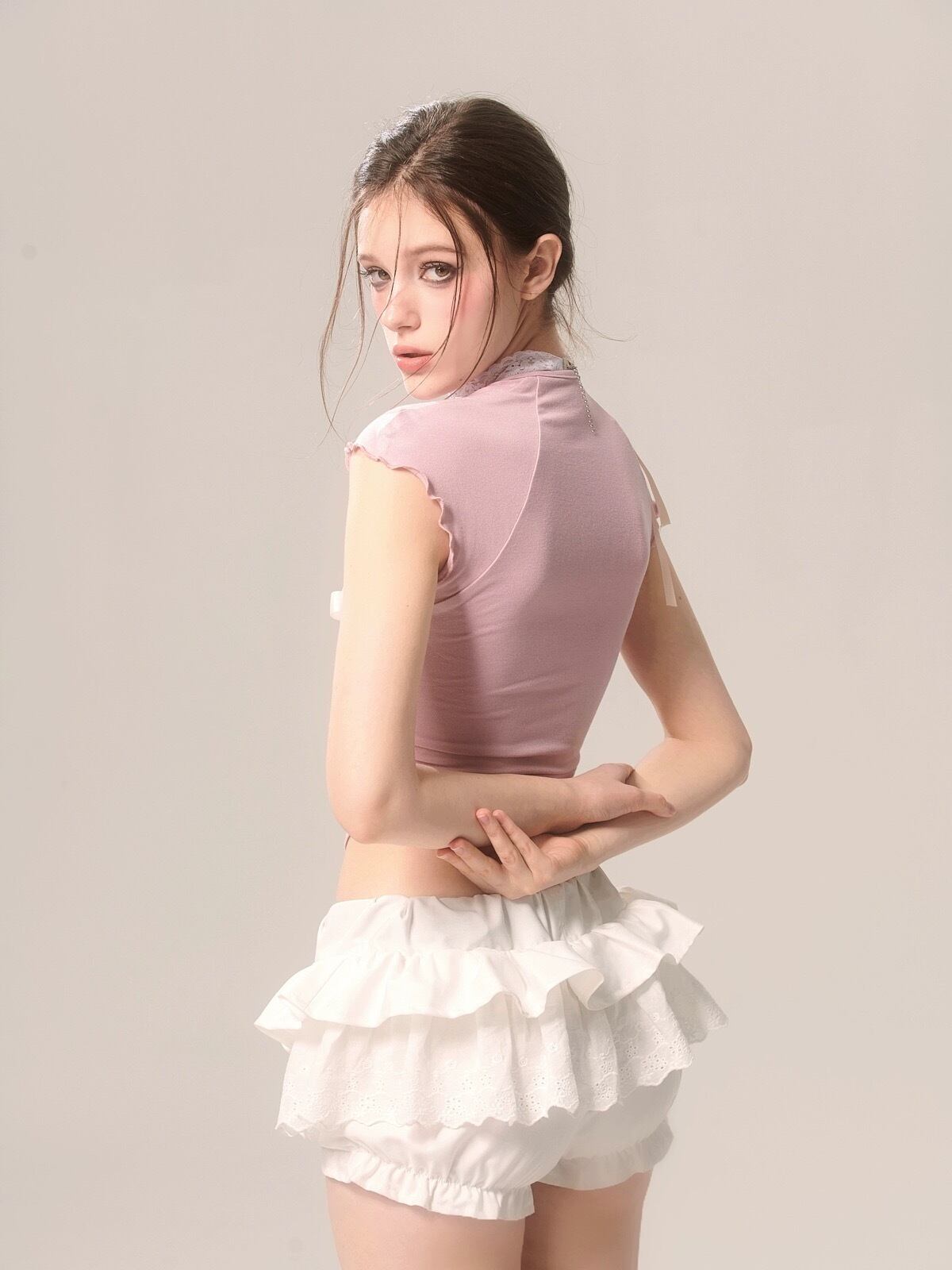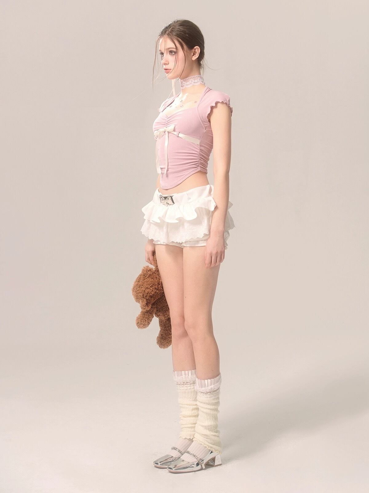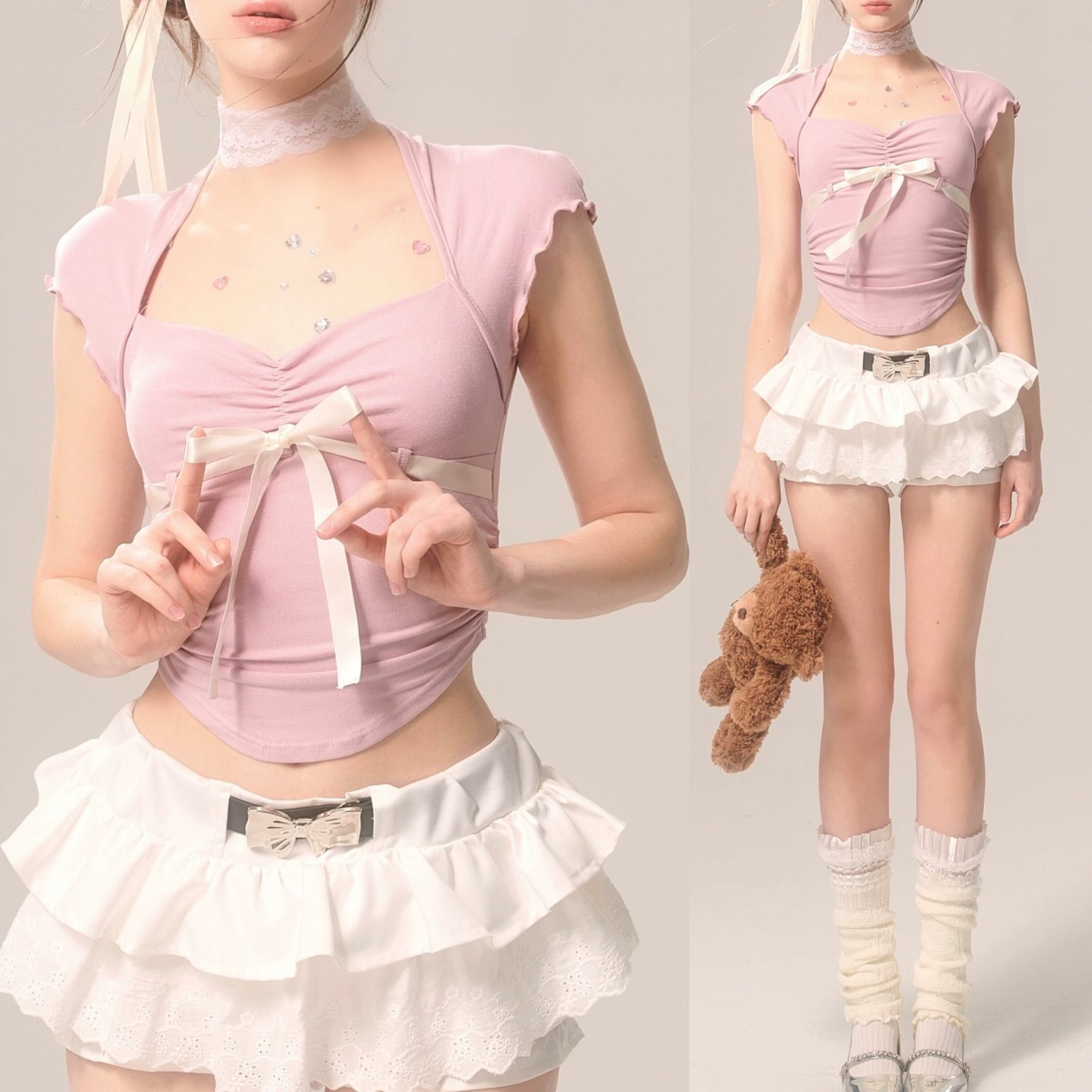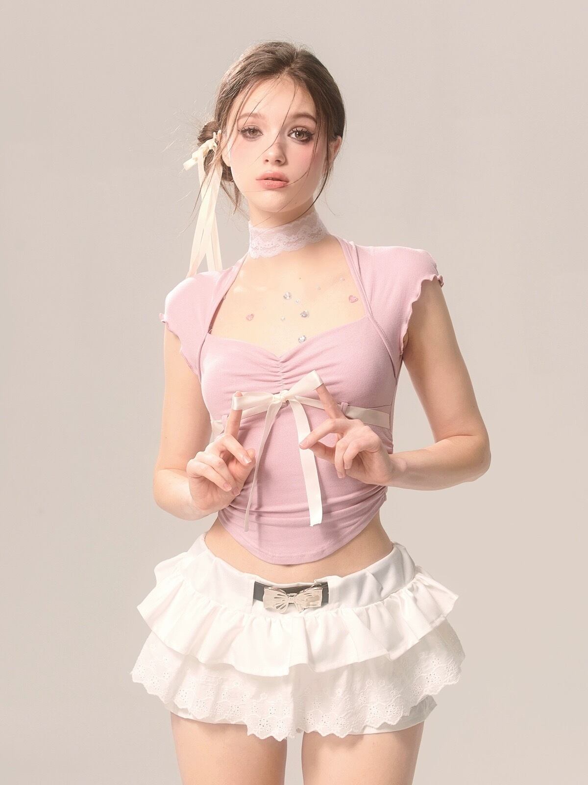 【トップス】ピンク カジュアル リボン ブラウス Tシャツ