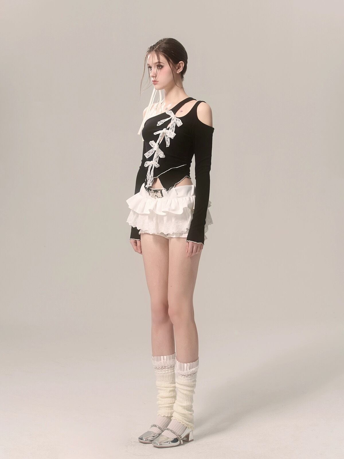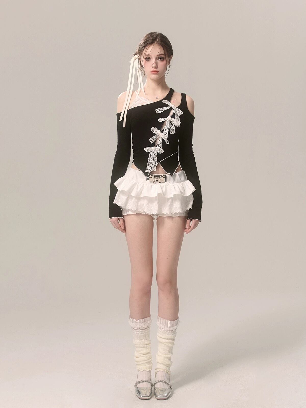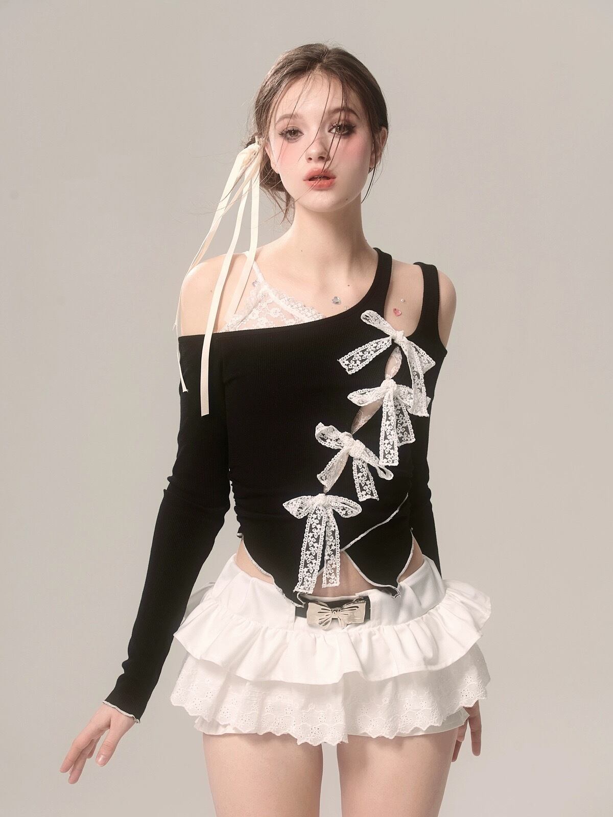 トップス 黒 ピンク リボン オフショルダー リボン ガーリー