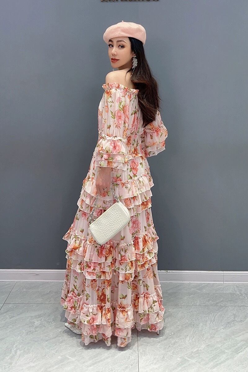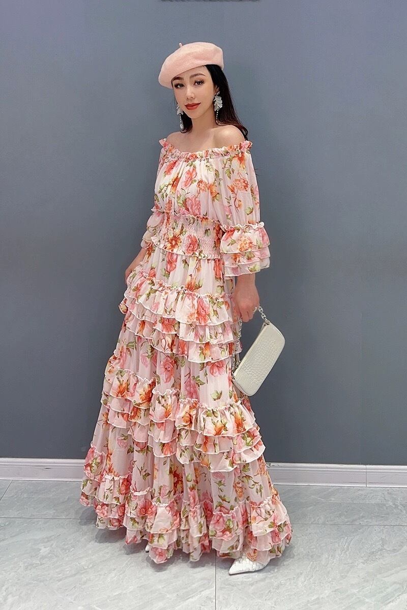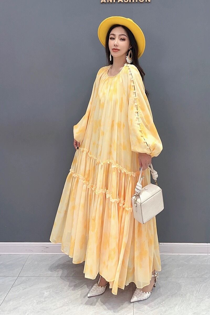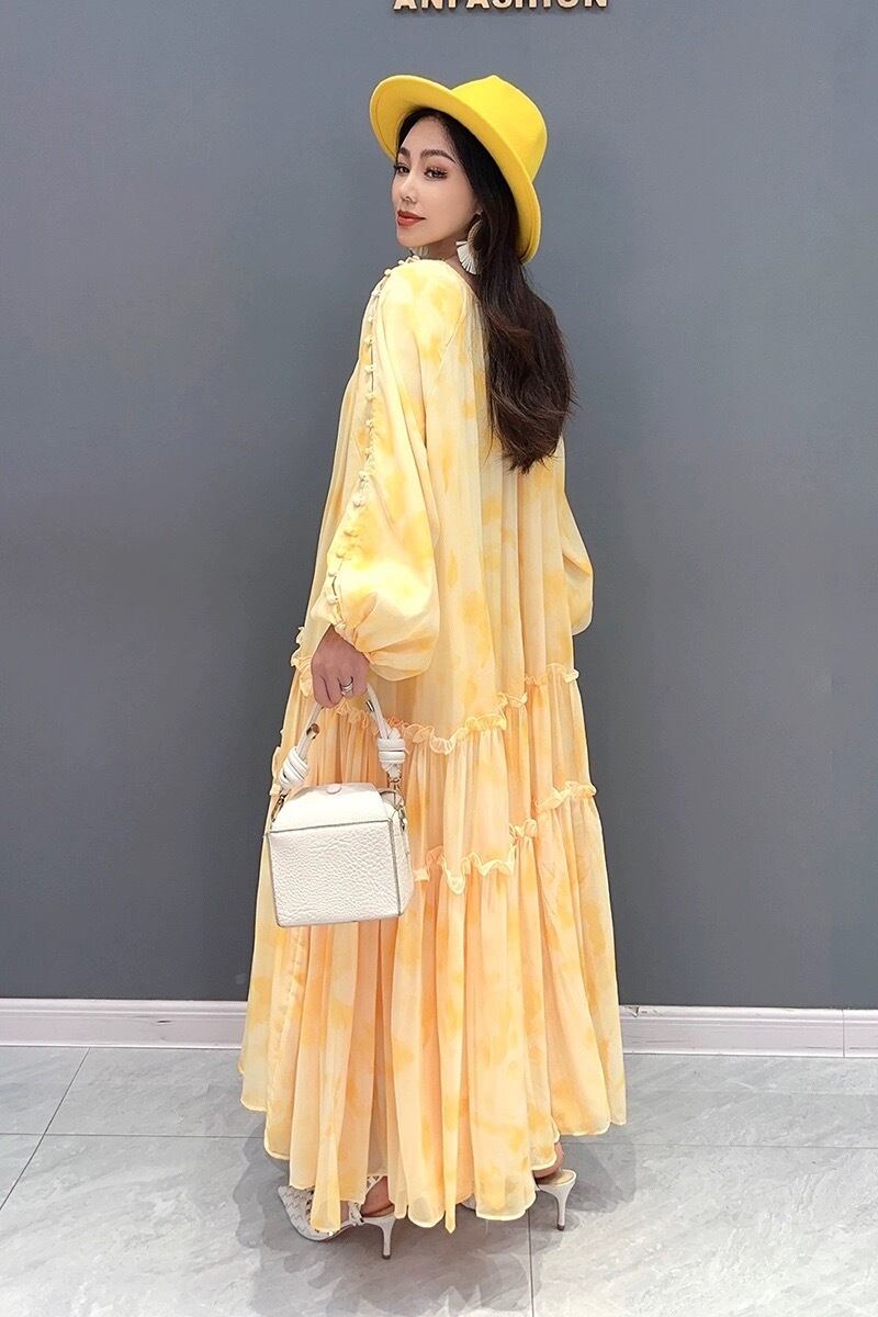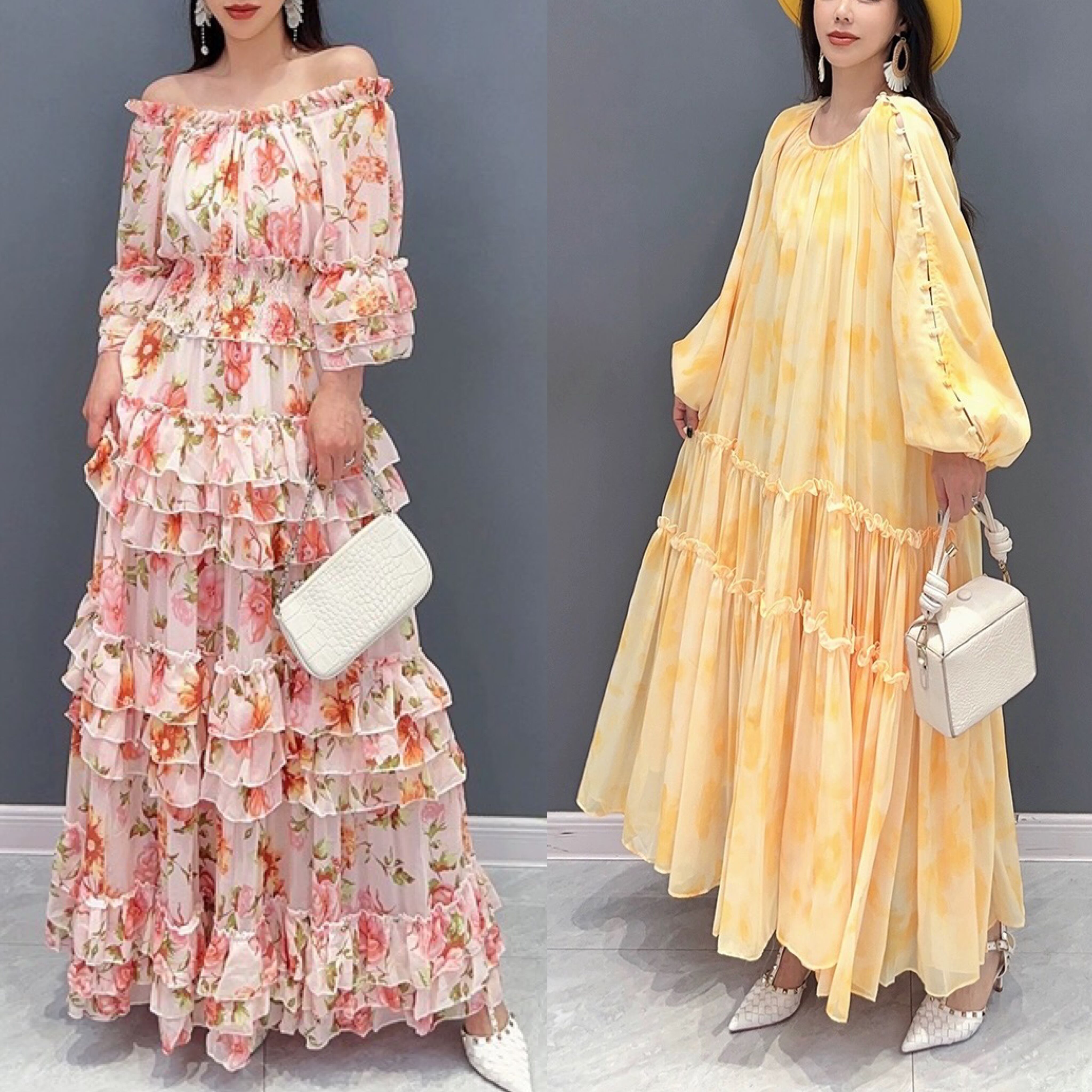 黄色 花柄 フラワー オレンジ 赤 マキシ ワンピース