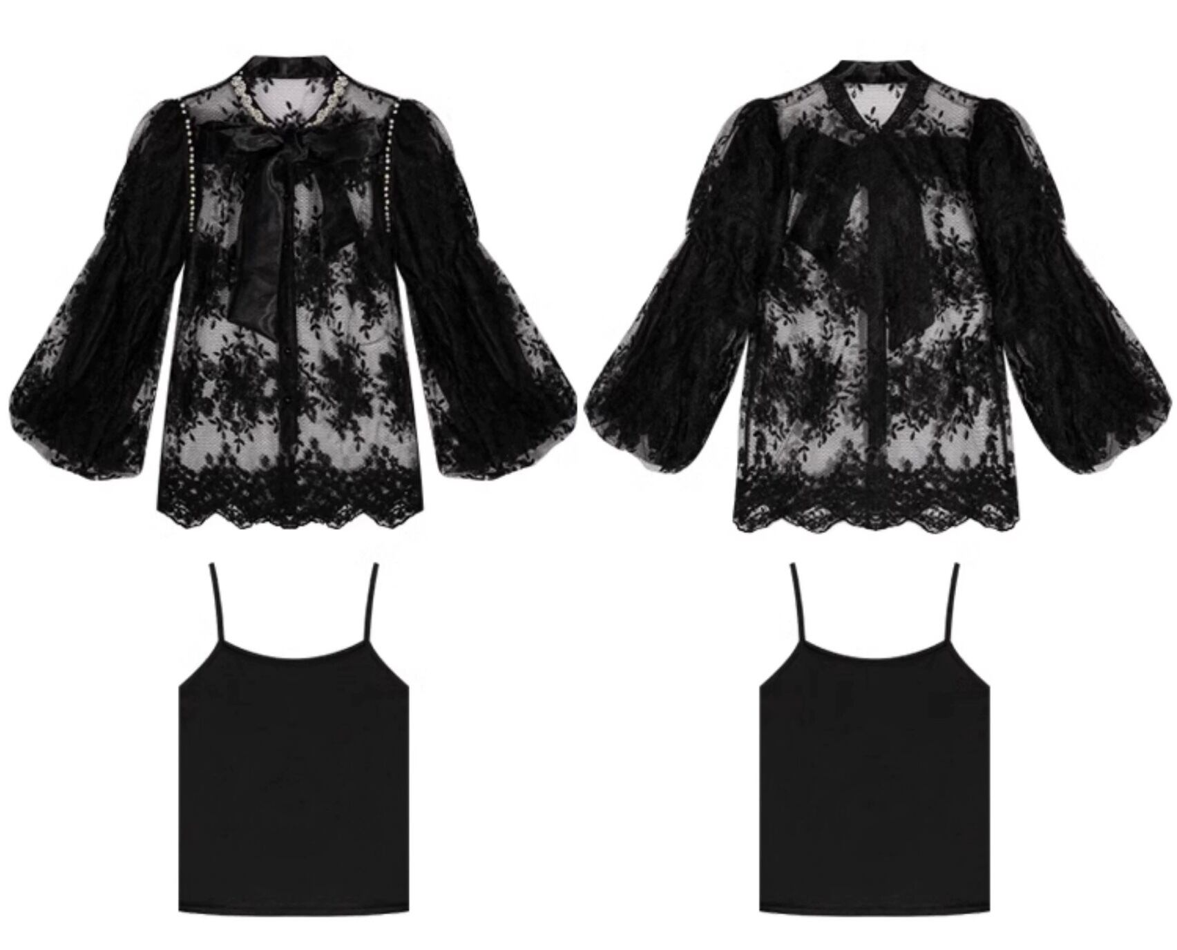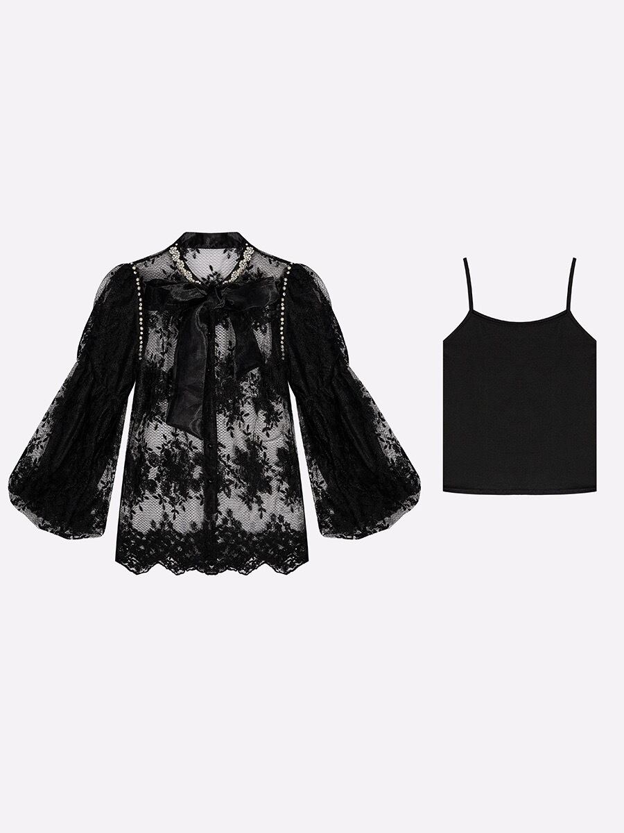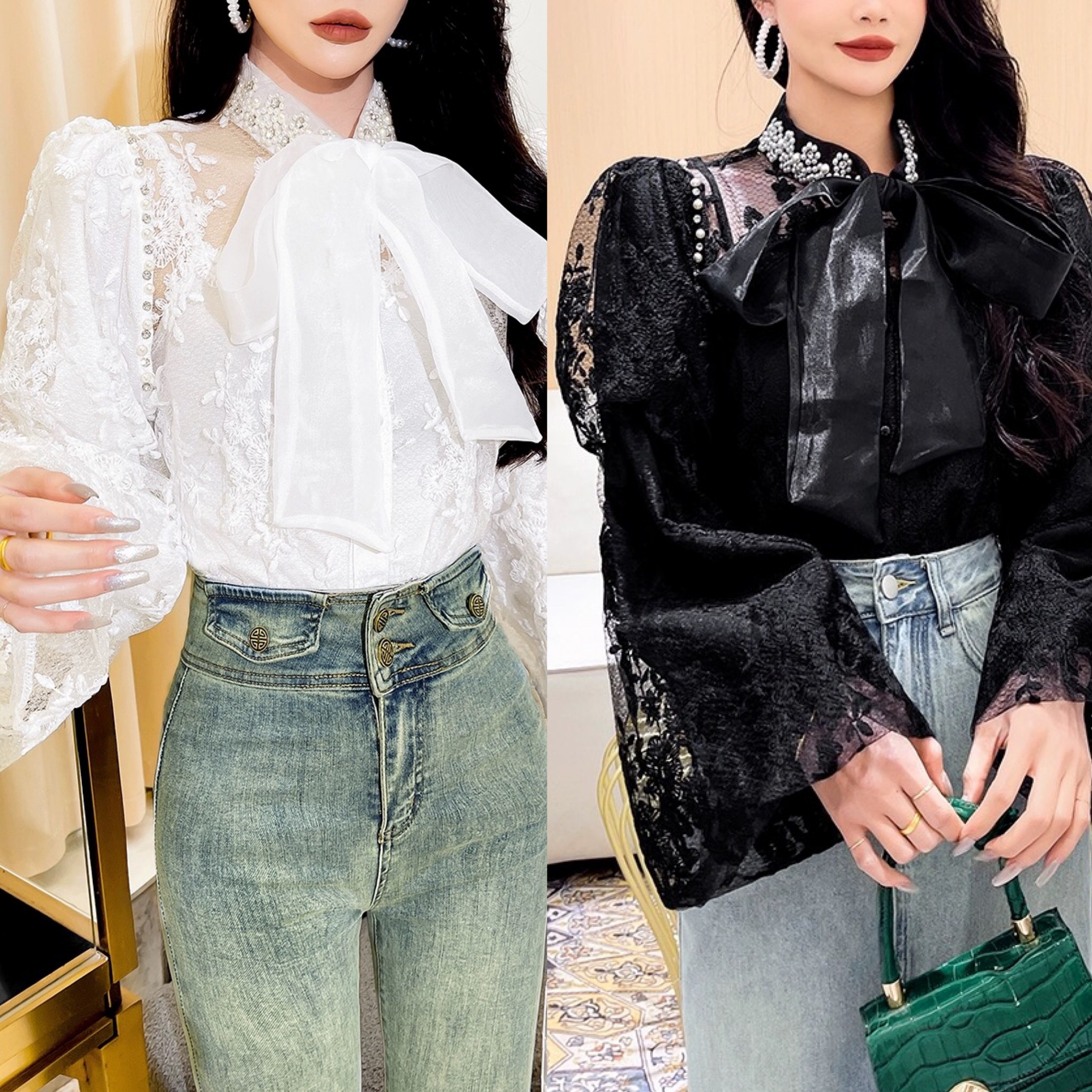 ブラウス レース 黒 白 花柄 フラワー エレガント リボン トップス