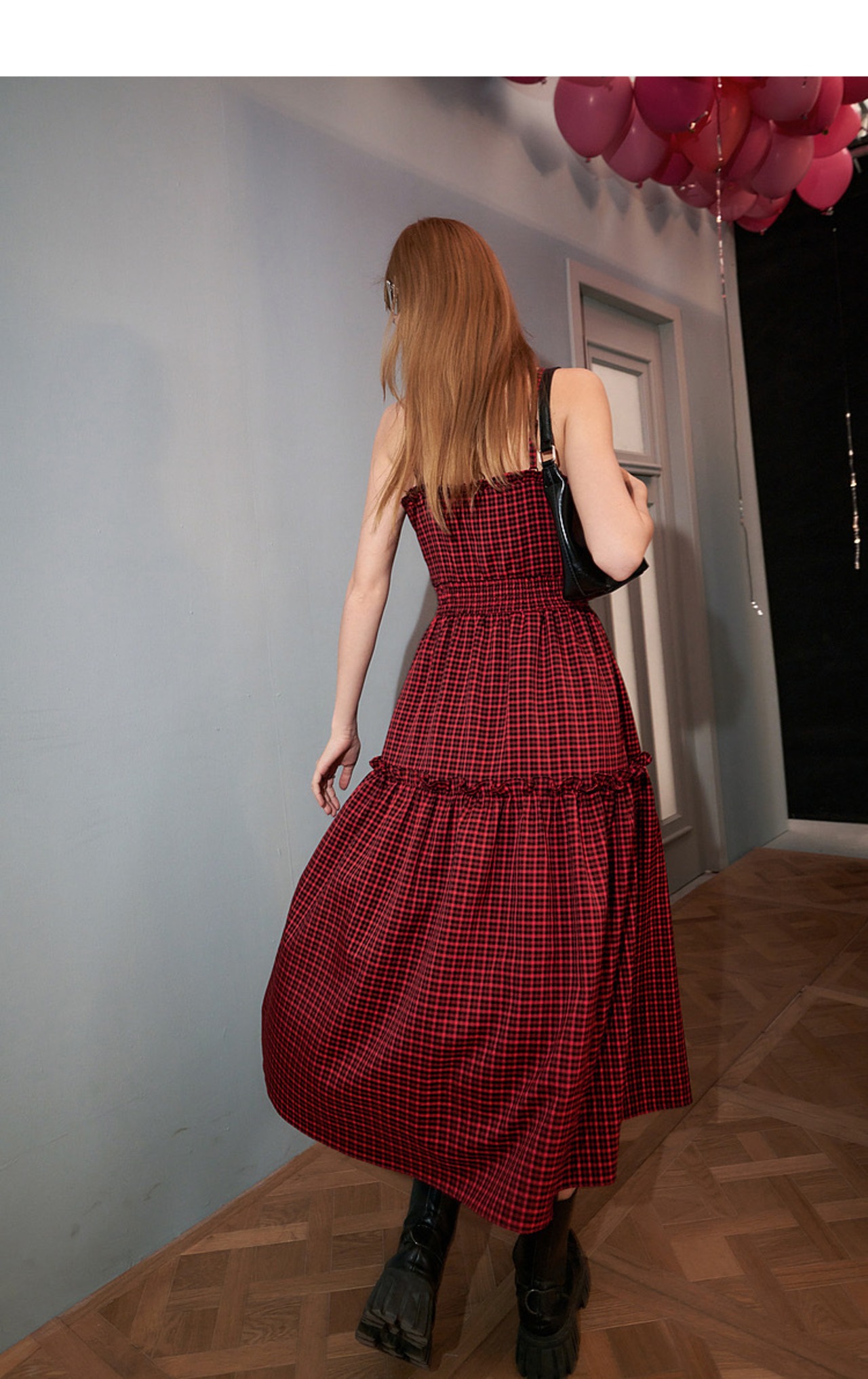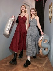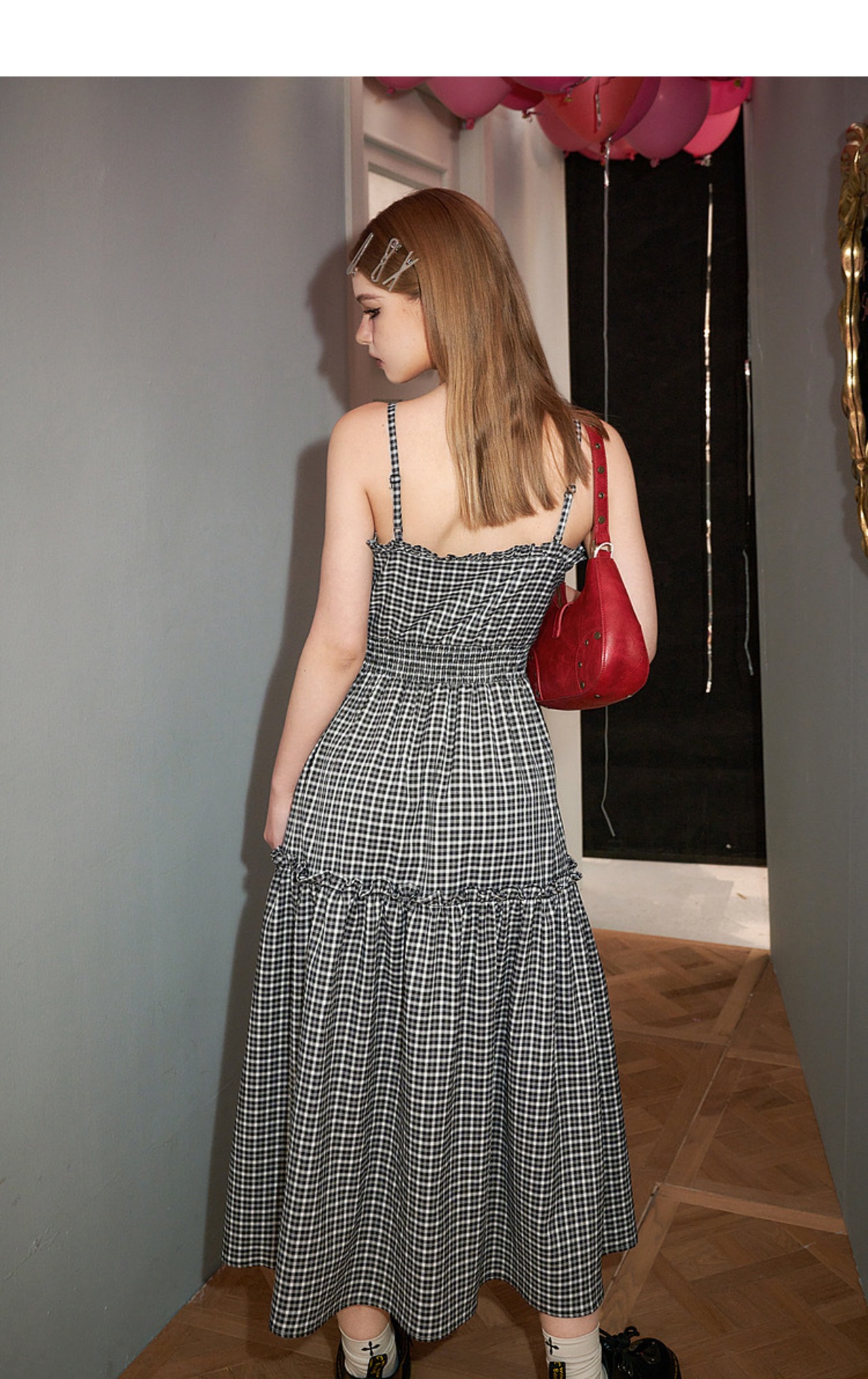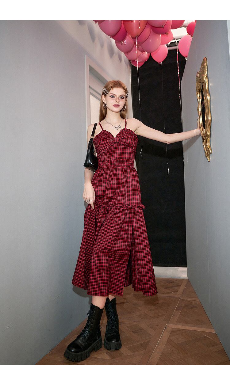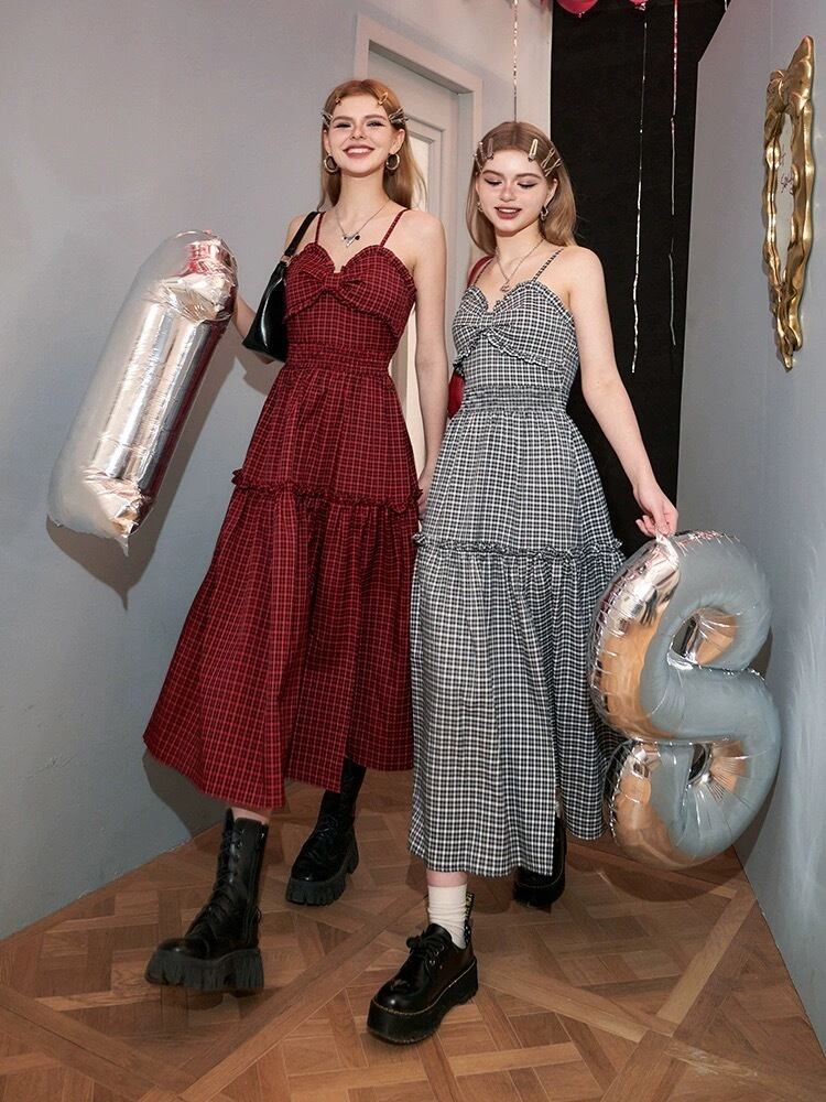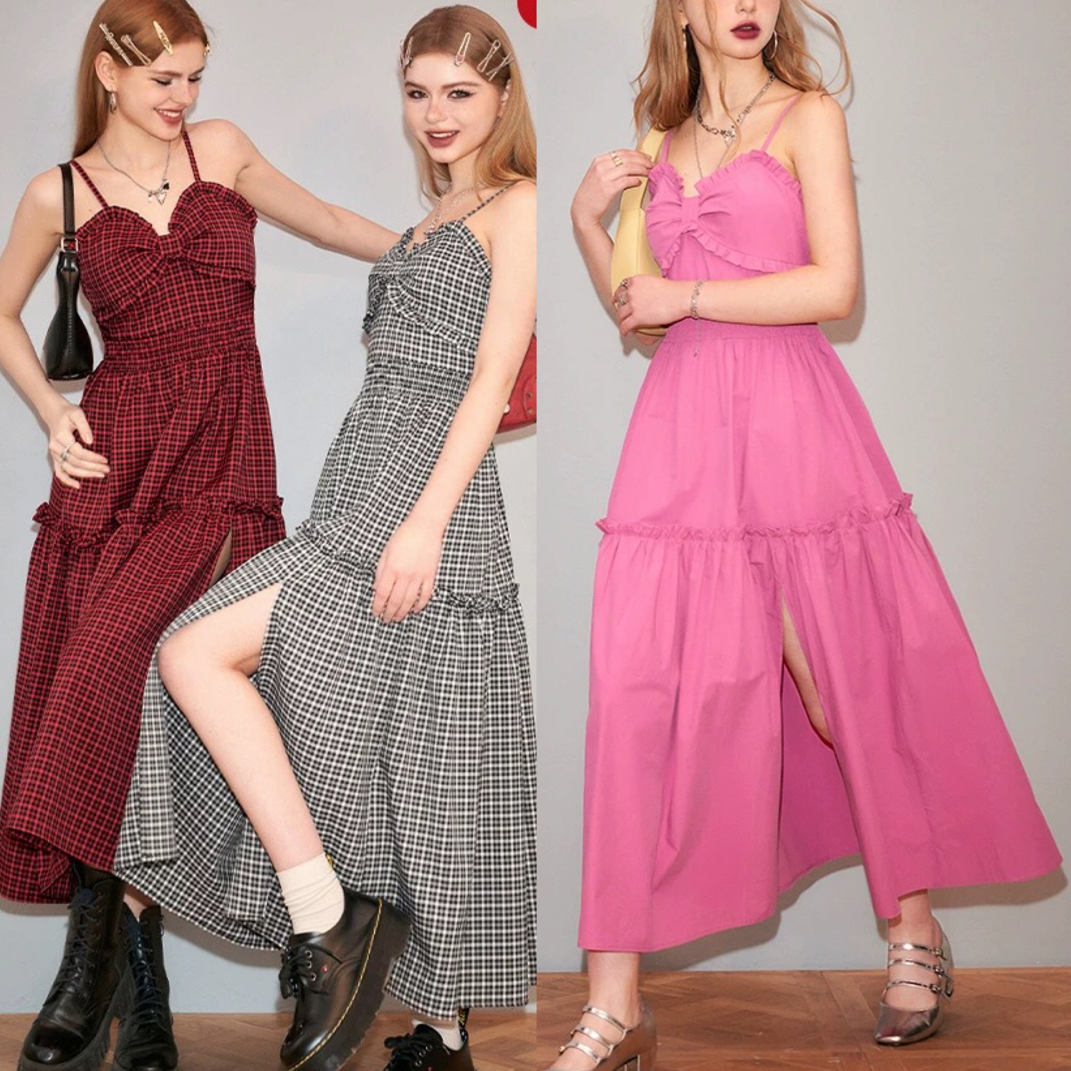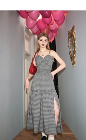 ワンピース キャミソール ピンク 赤 白 チェック 黒 スリット