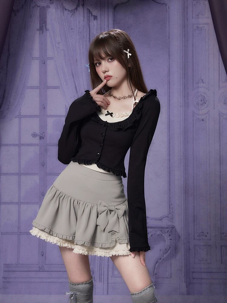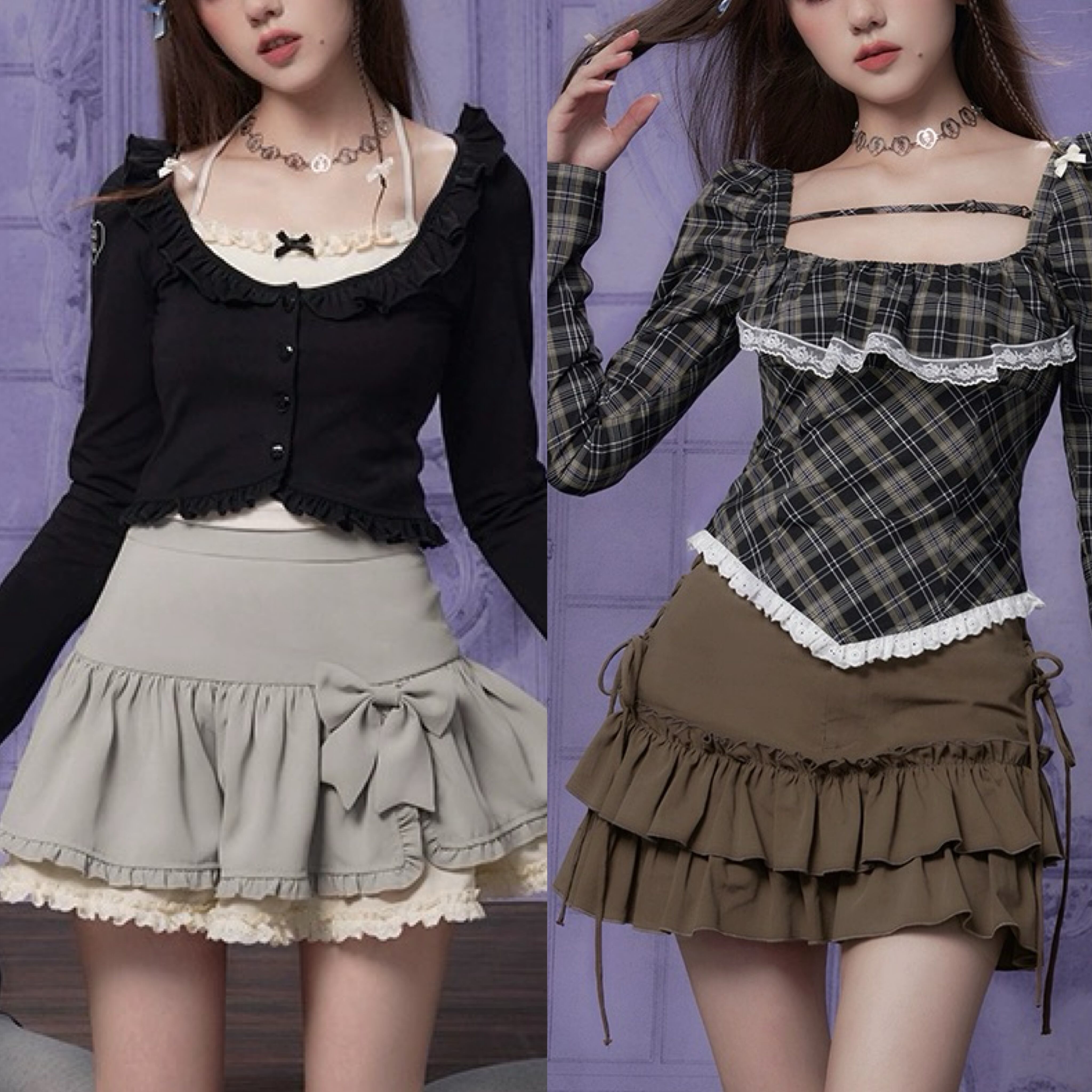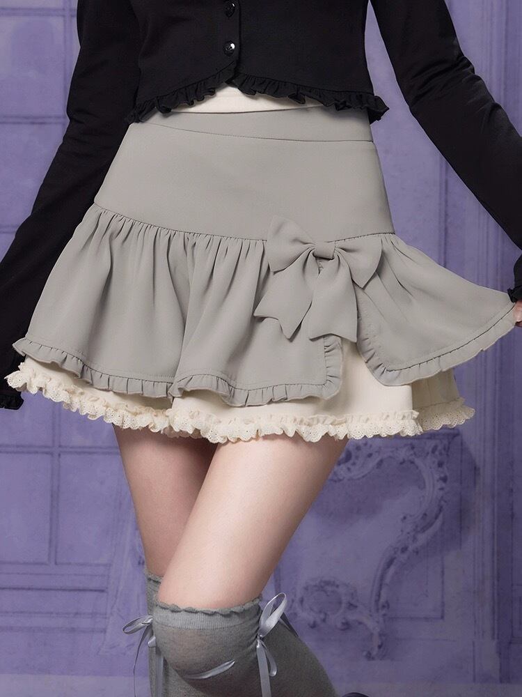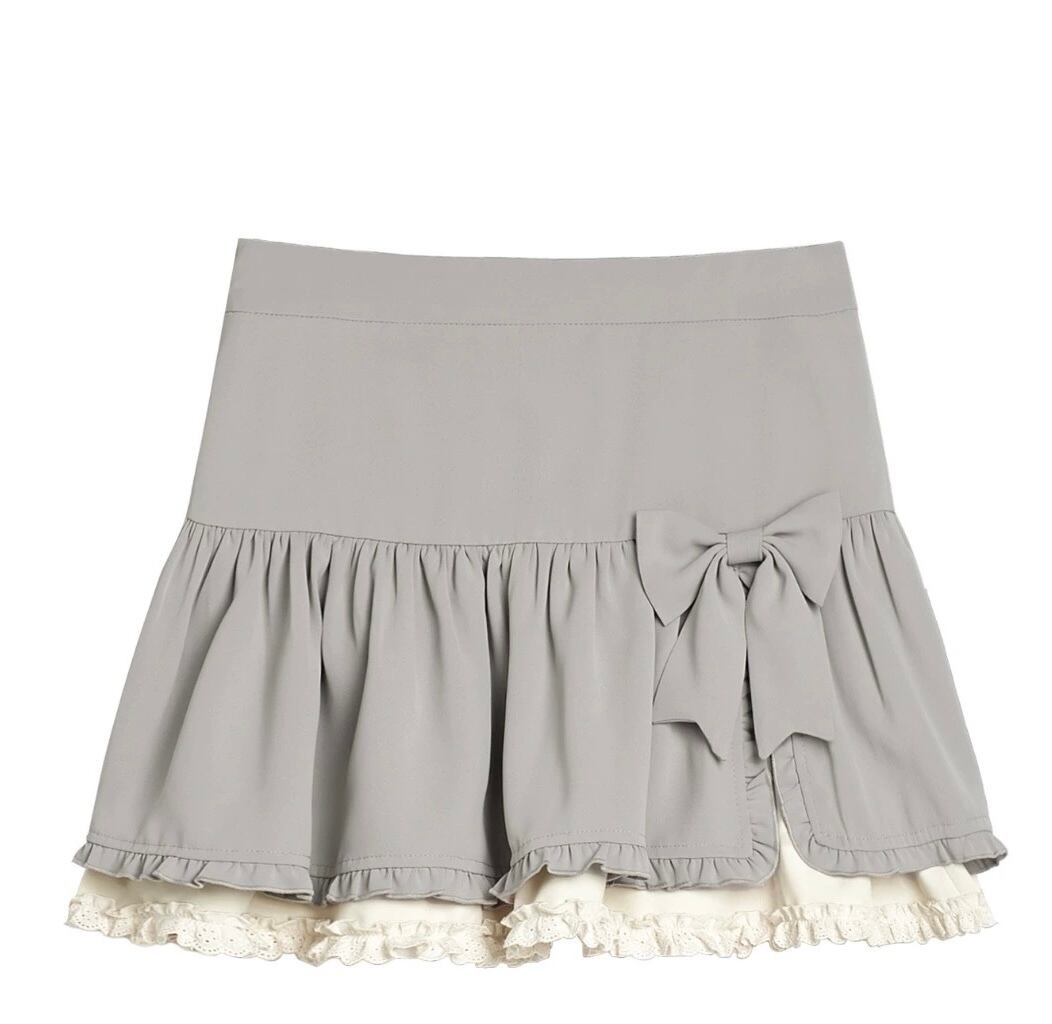 スカート 茶色 グレー リボン ボトムス ガーリー ミニスカート 可愛い