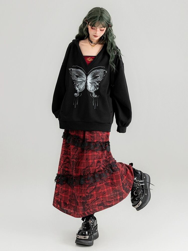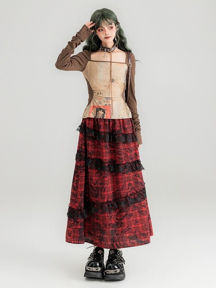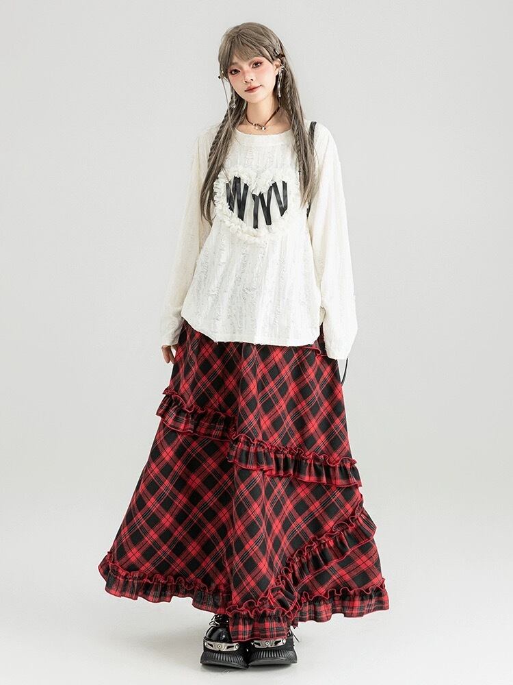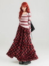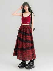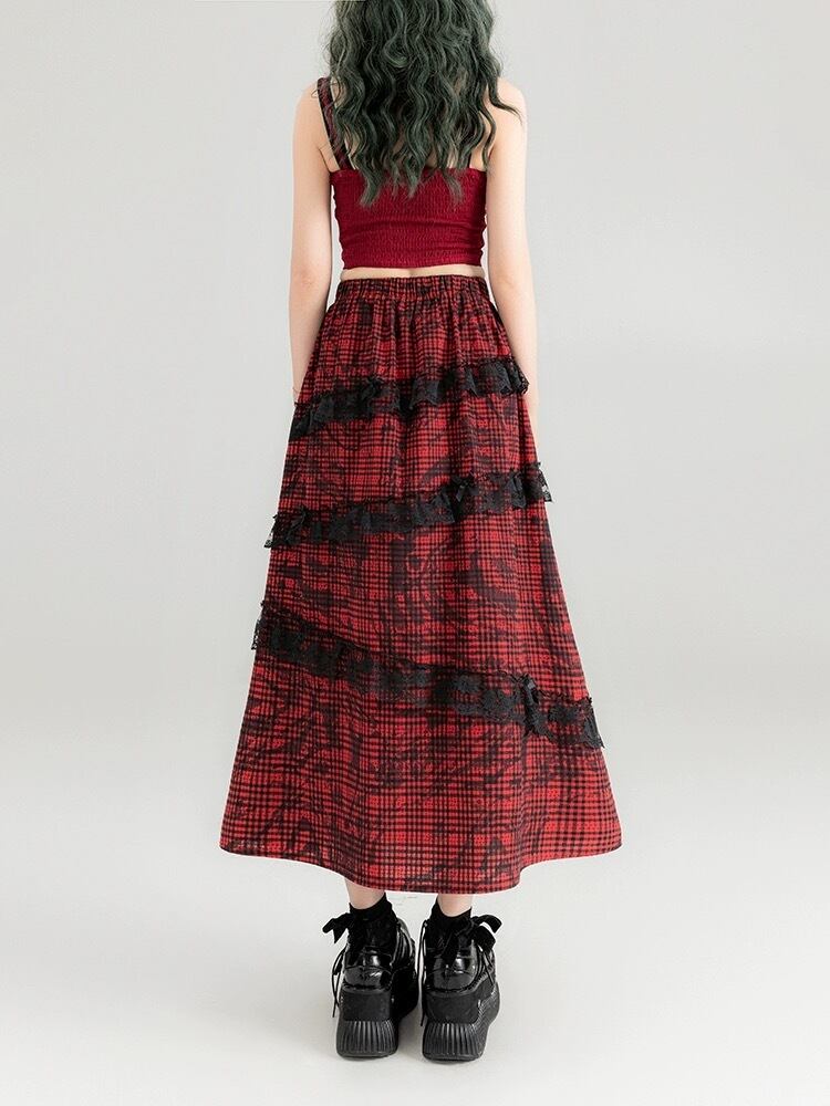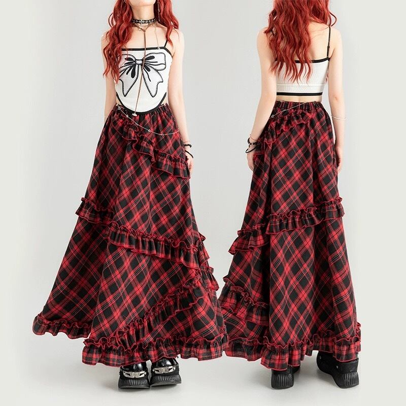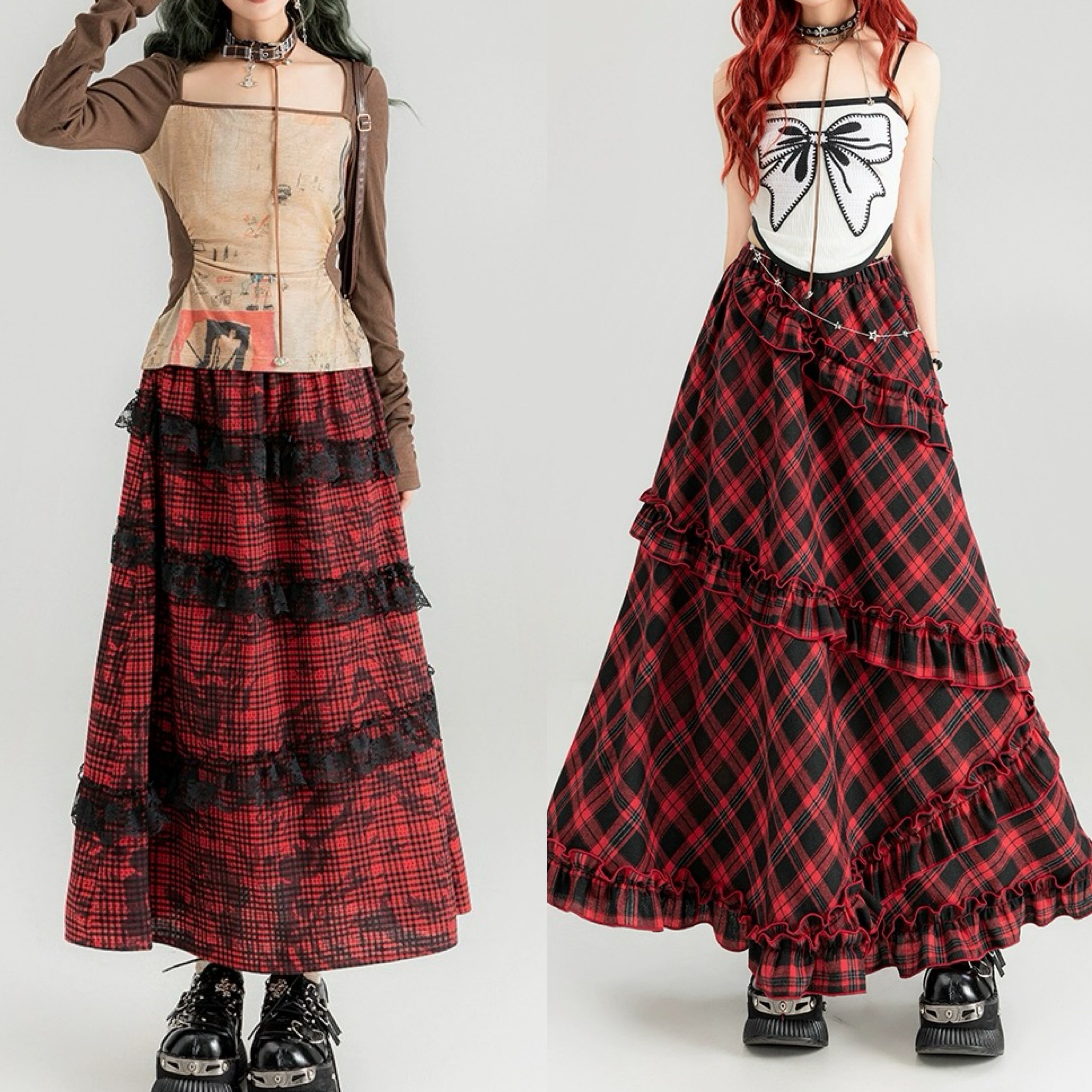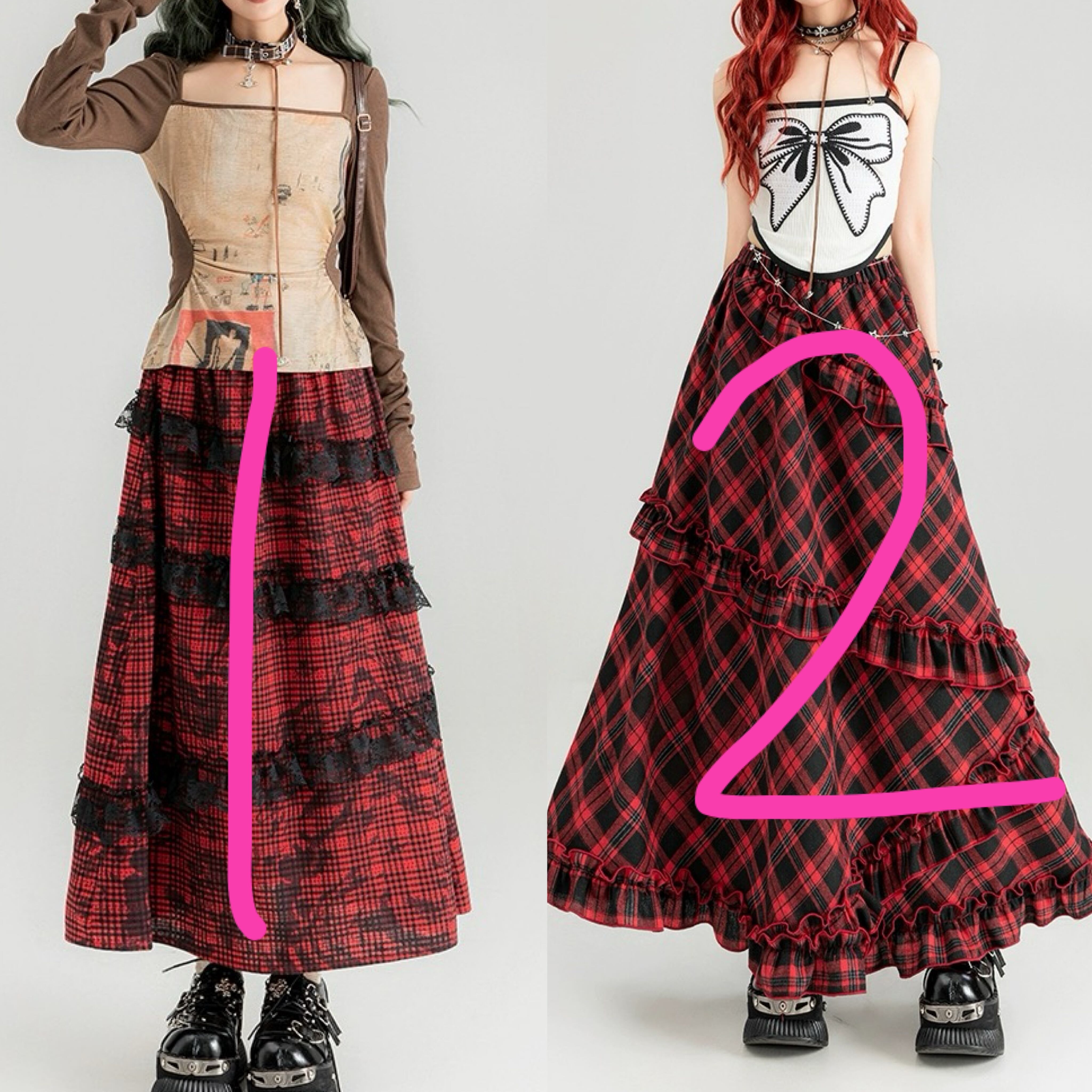 赤 チェック XL スカート ボトムス ガーリー ロング カジュアル 原宿