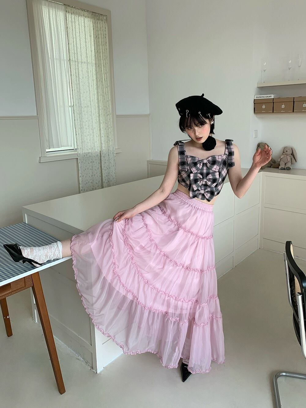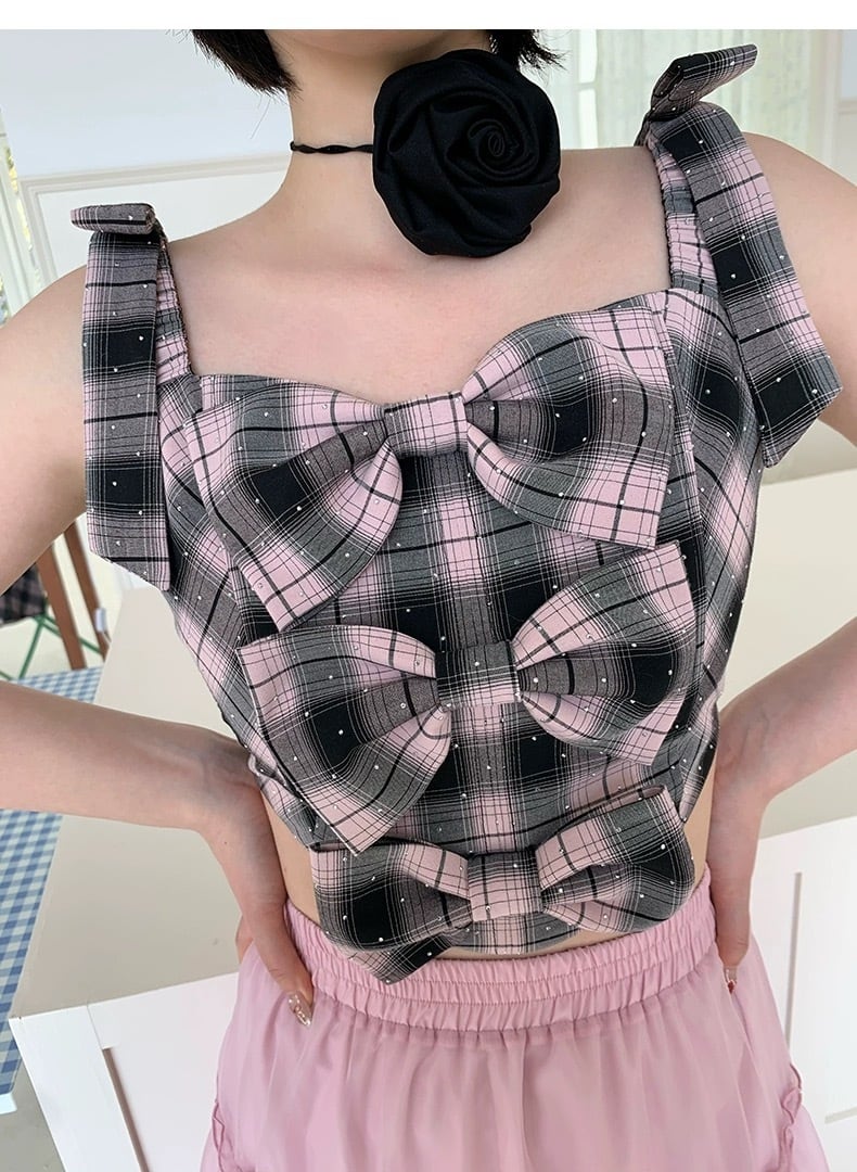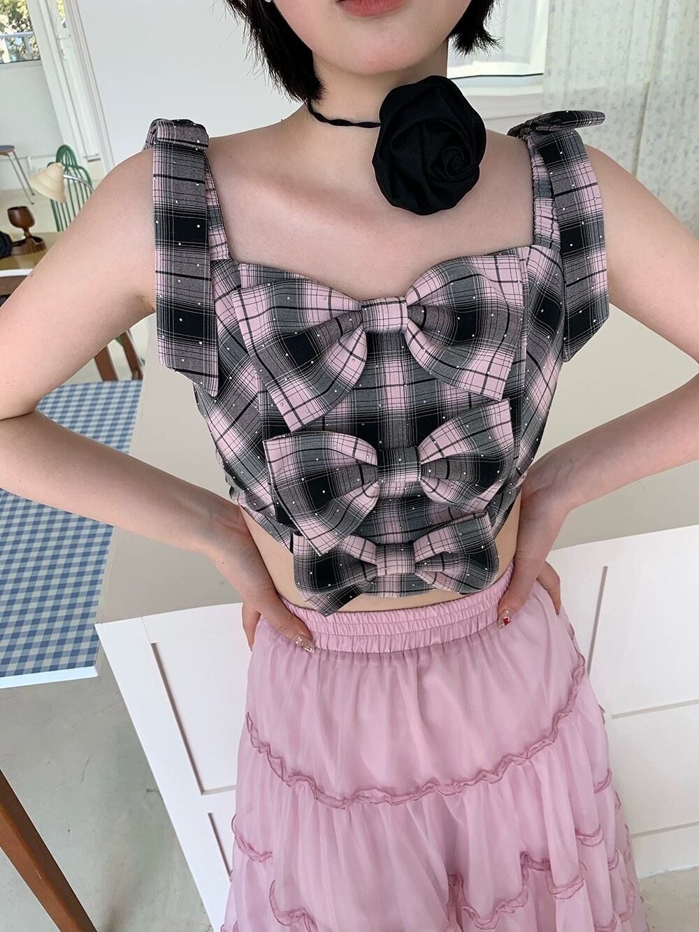 【トップス】ピンク グレー リボン ガーリー トップス キャミソール
