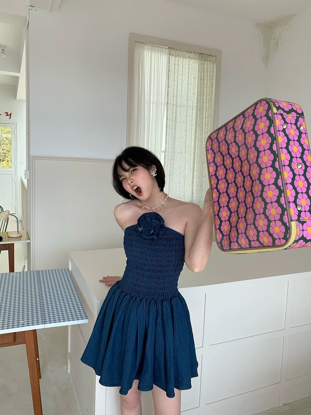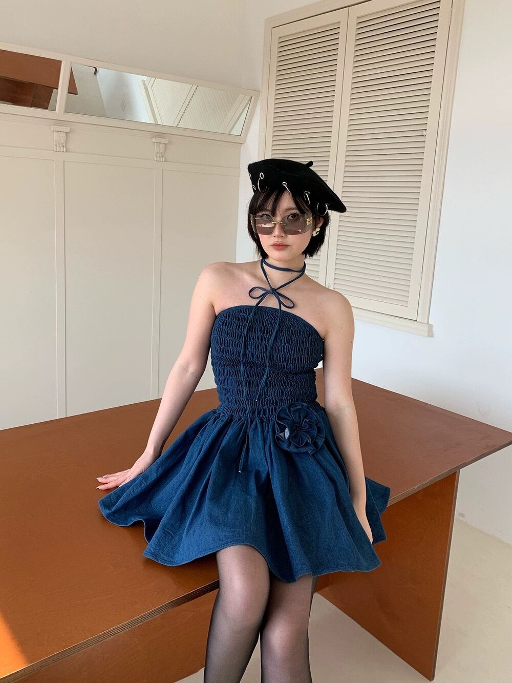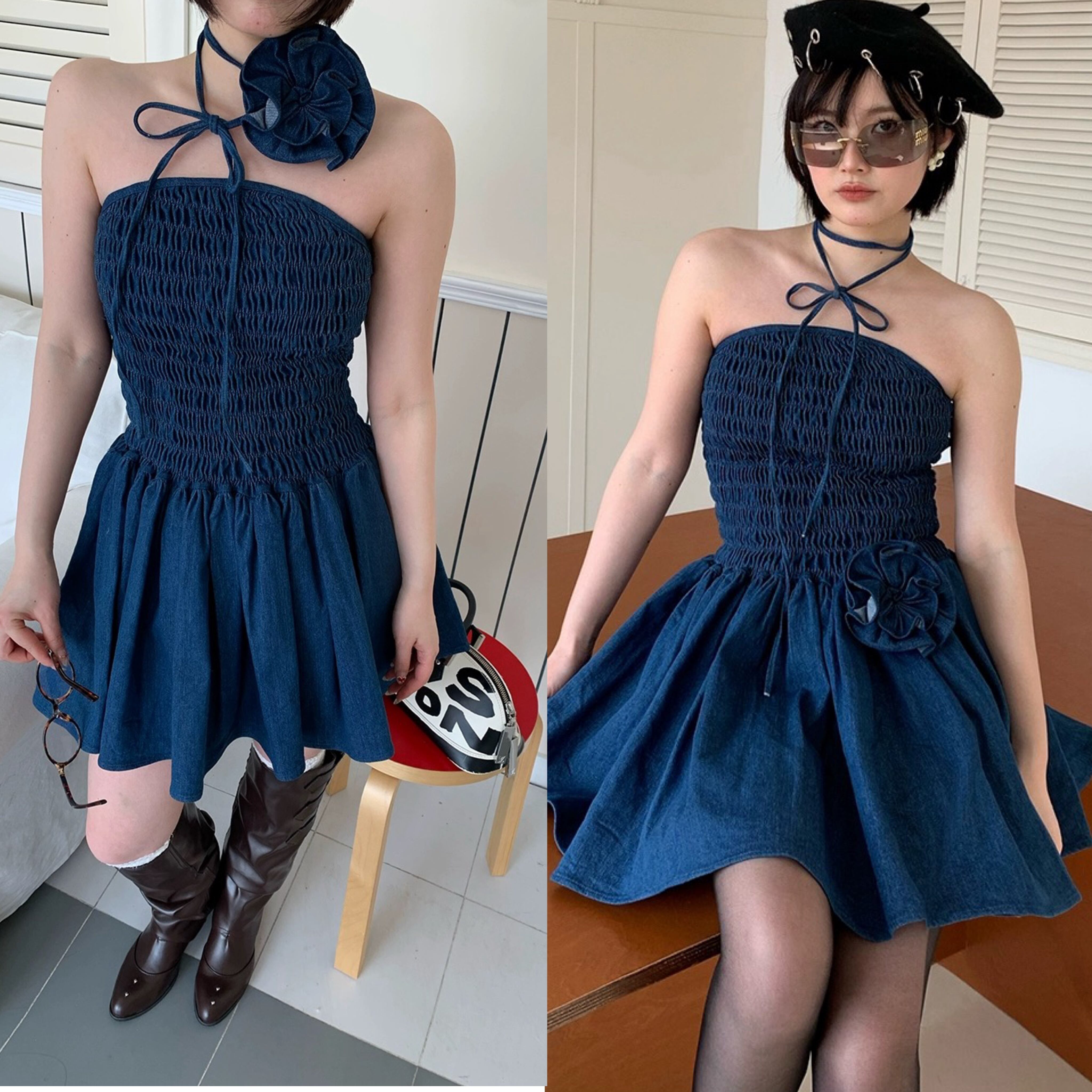 ワンピース ネイビー デニム カジュアル ミニスカート ベアトップ チューブトップ