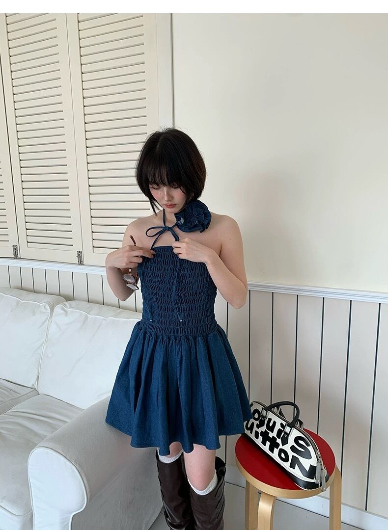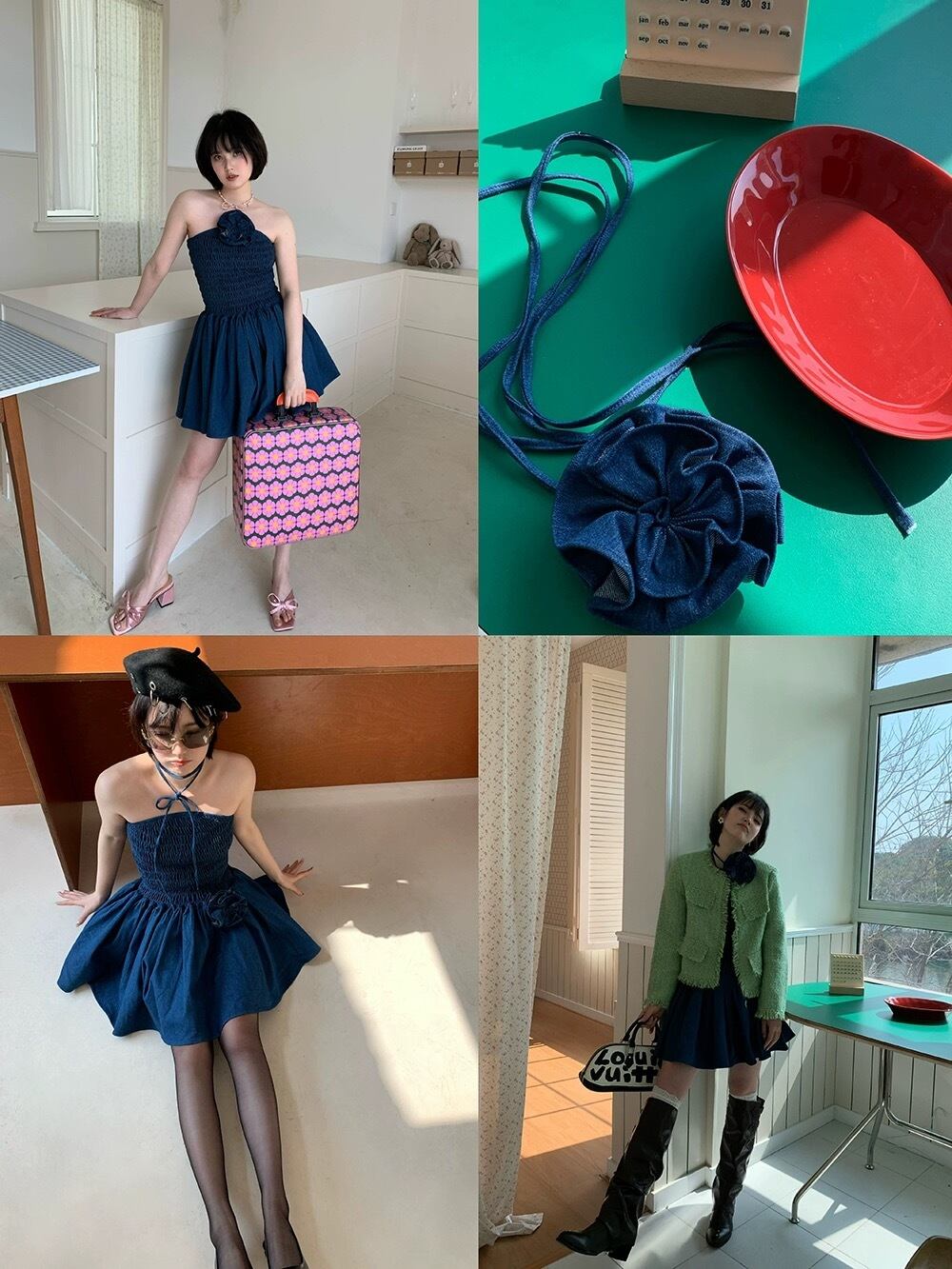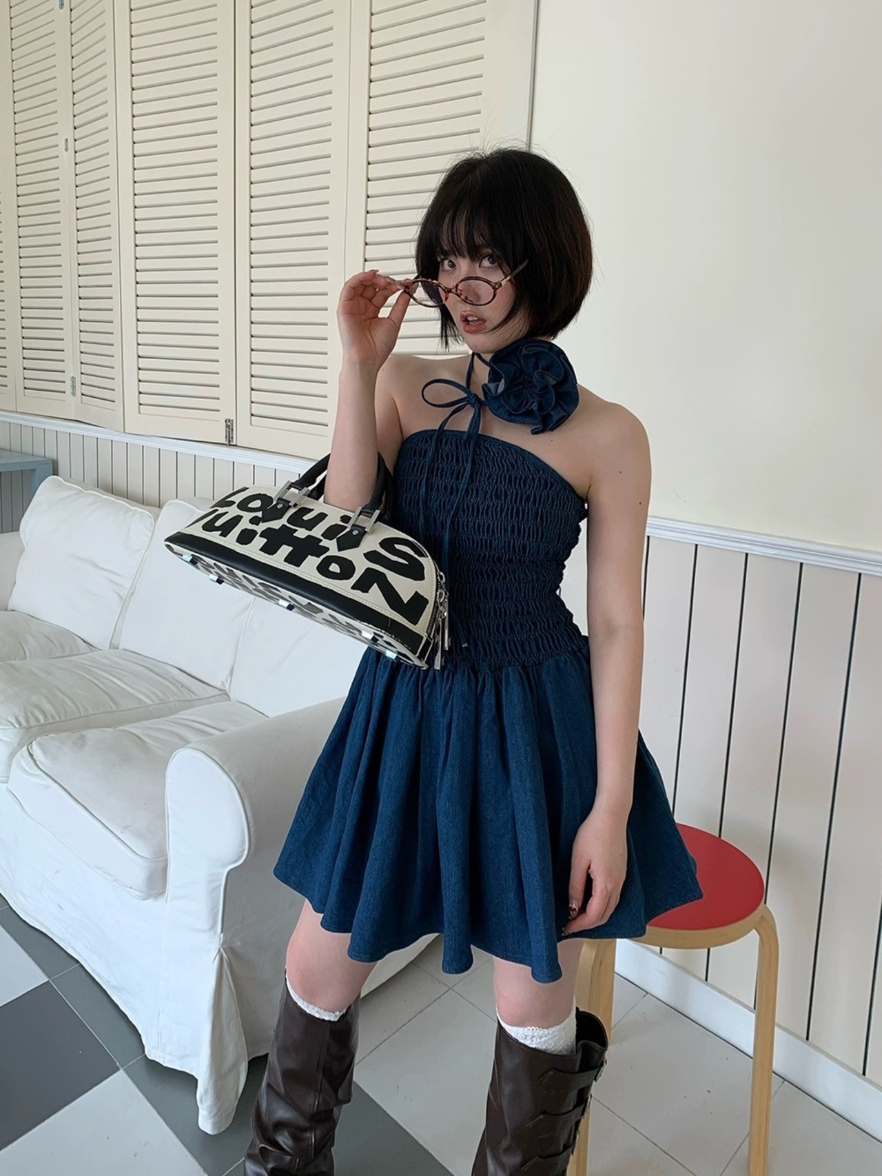 ワンピース ネイビー デニム カジュアル ミニスカート ベアトップ チューブトップ