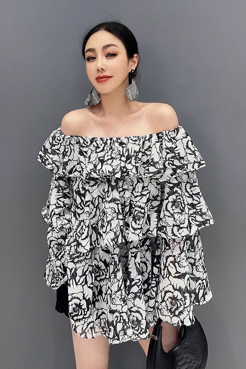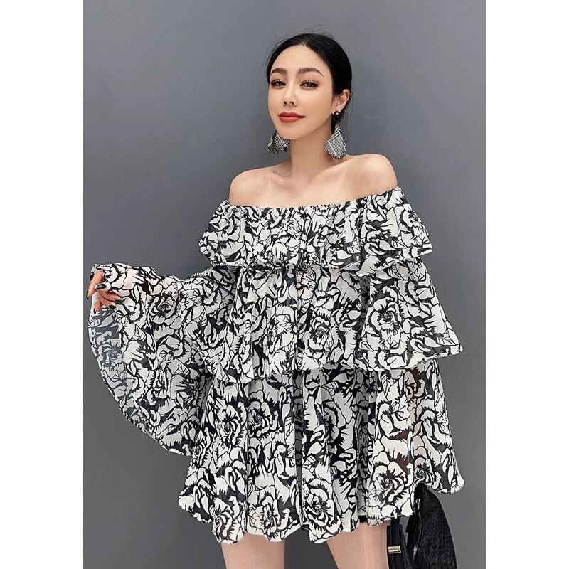 モノトーン 黒 白 バラ フラワー 花柄 オフショルダー ブラウス デコルテ ワンピース