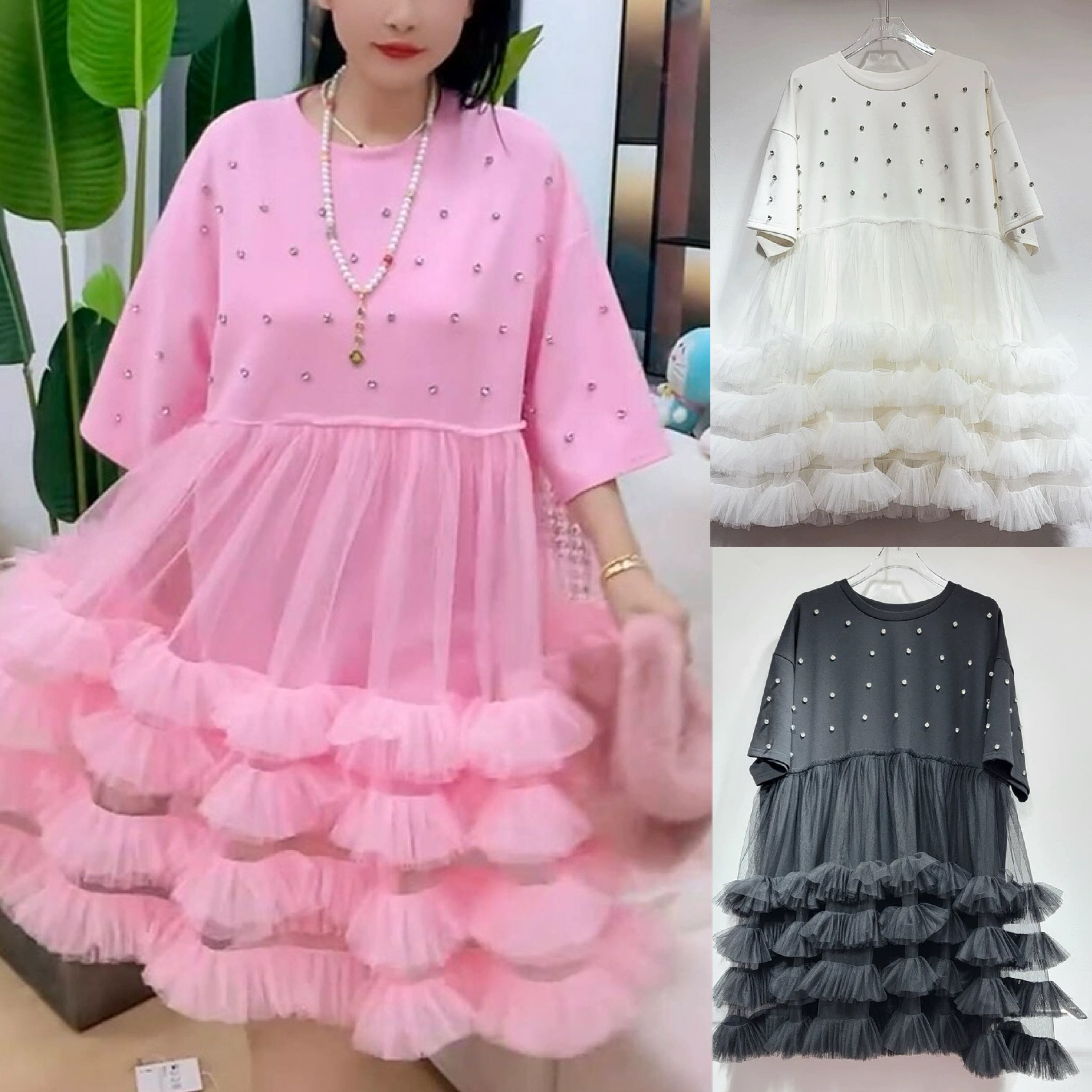 ピンク ワンピース カジュアル ラインストーン キラキラ 黒 スウェット 白 カジュアル ワンピース