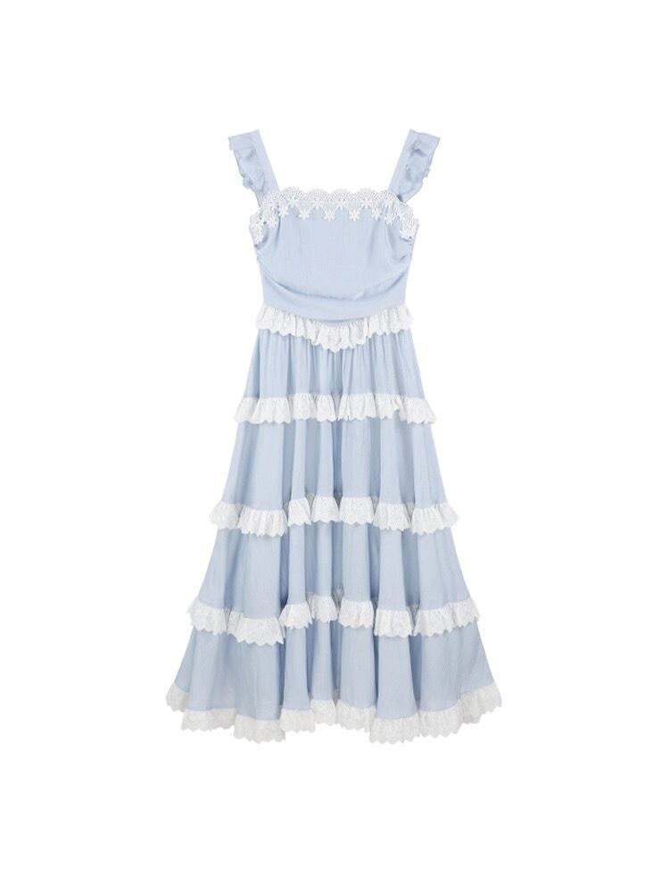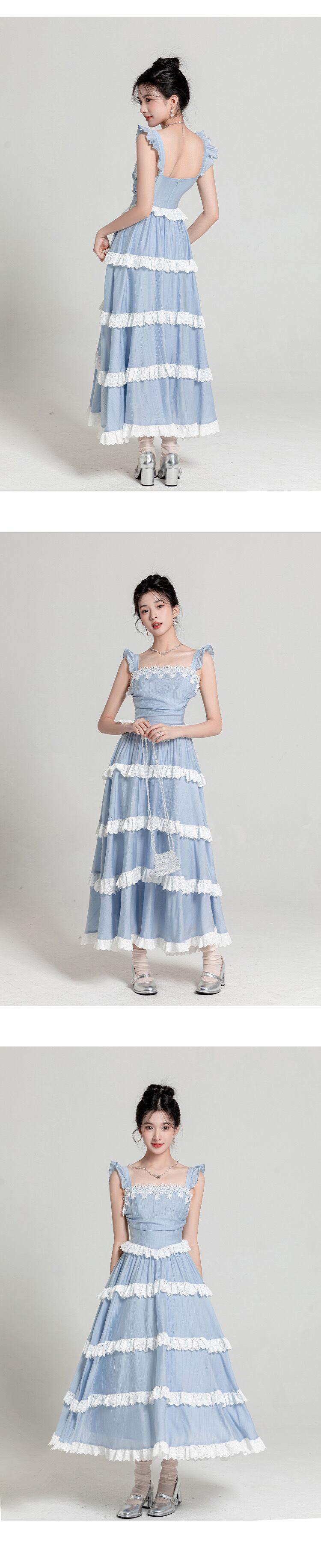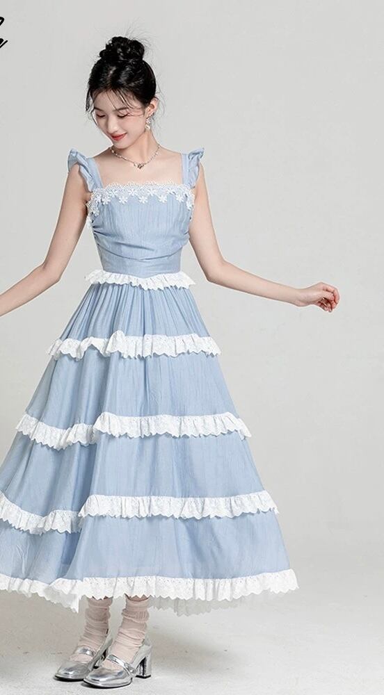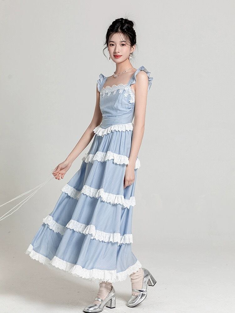水色 ワンピース リボン 爽やか マキシ ロング お嬢
