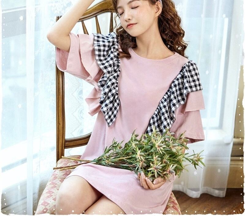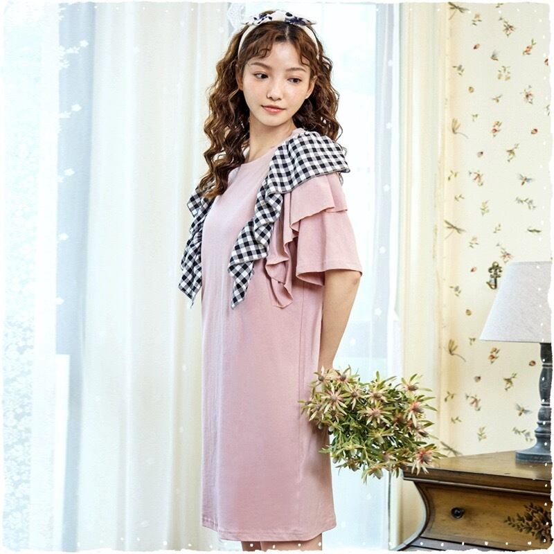 カジュアル トップス ガーリー ピンク チェック ワンピース ルームウェア