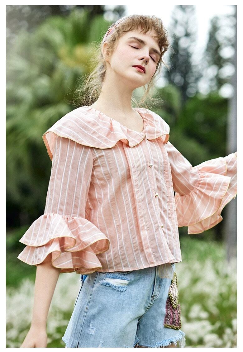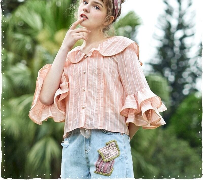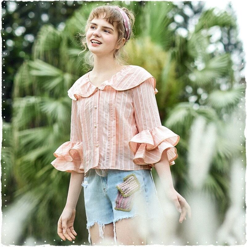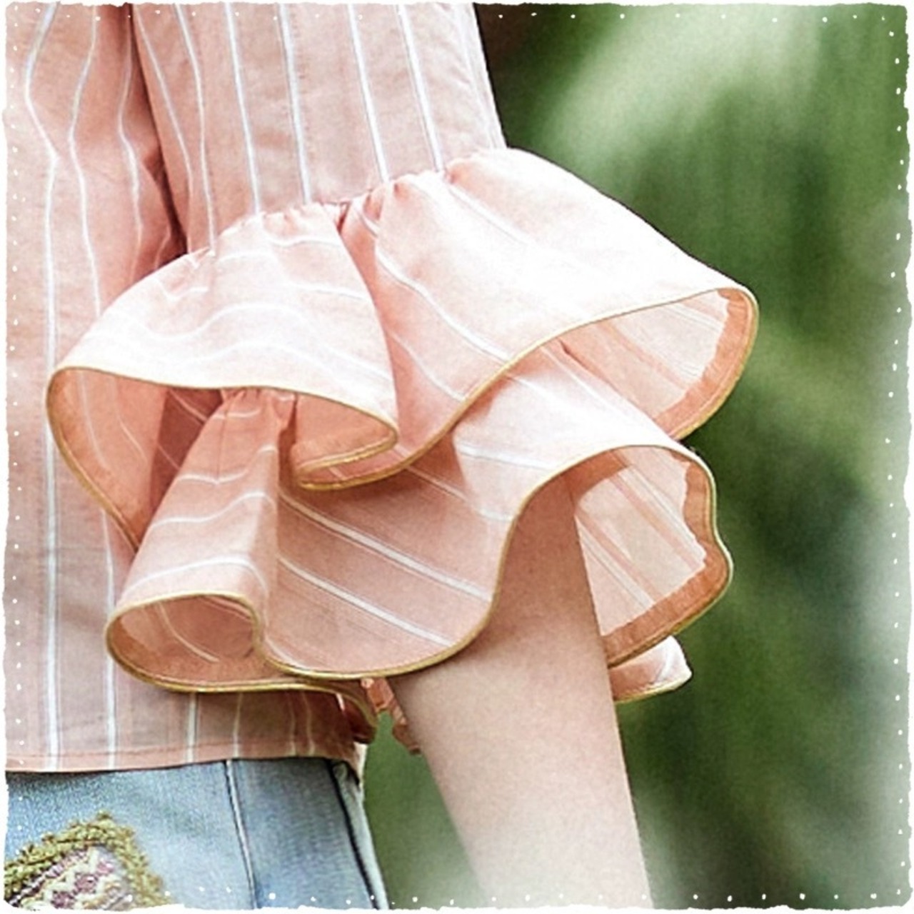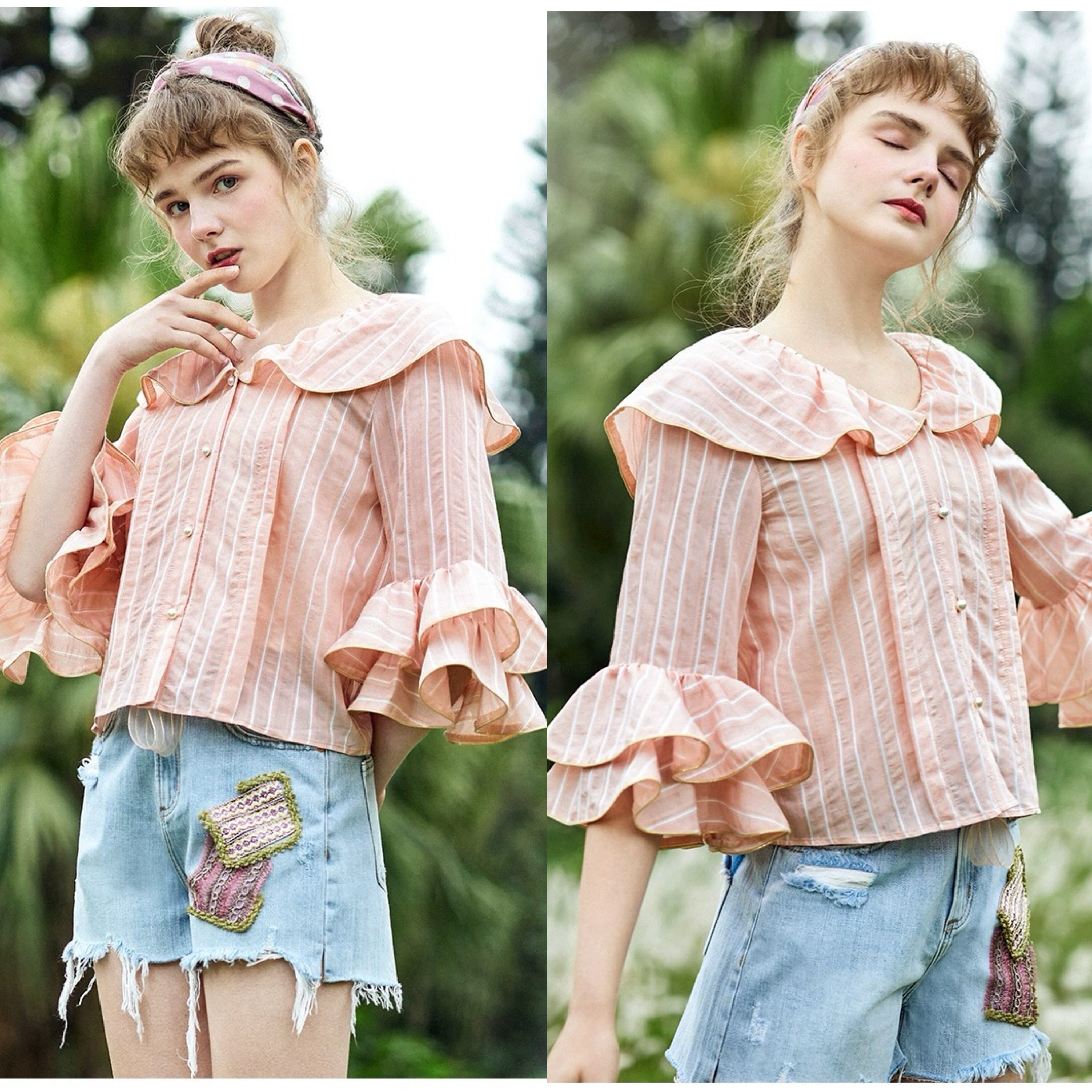 オレンジ ピンク チェック ボーダー ストライプ ガーリー ブラウス