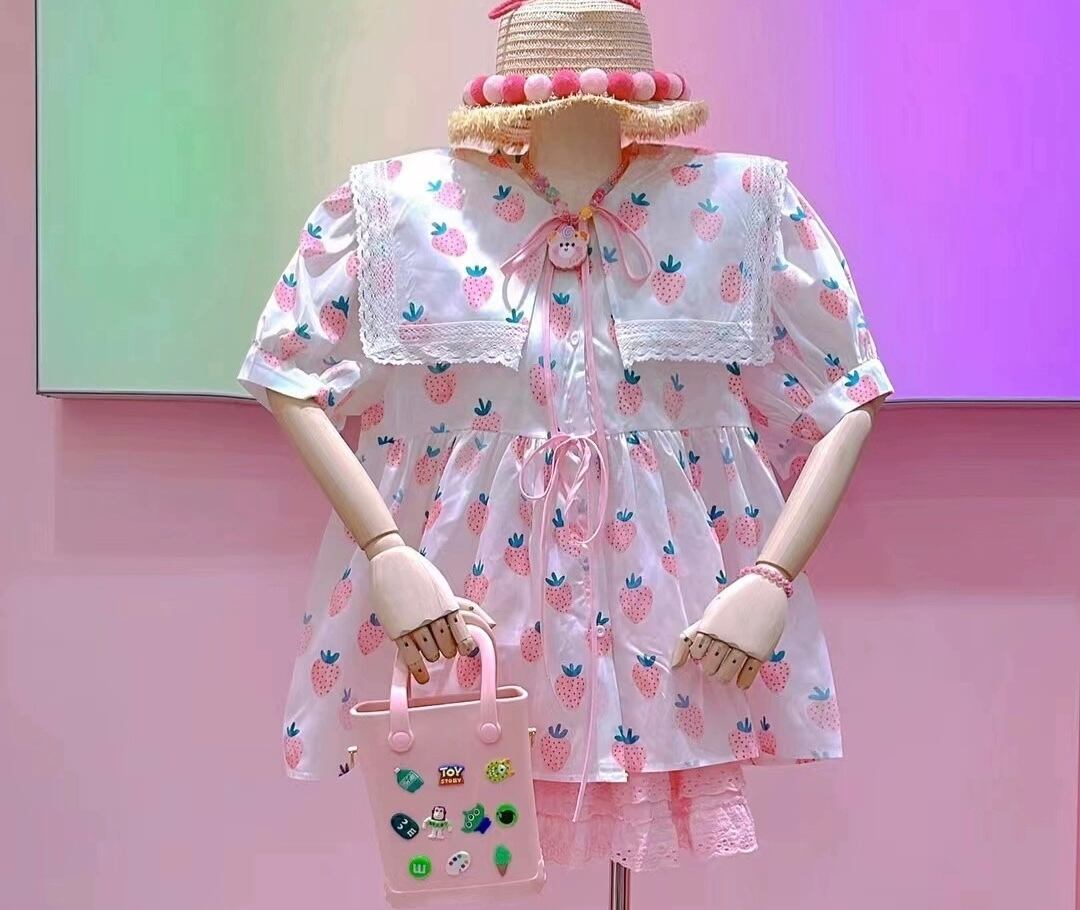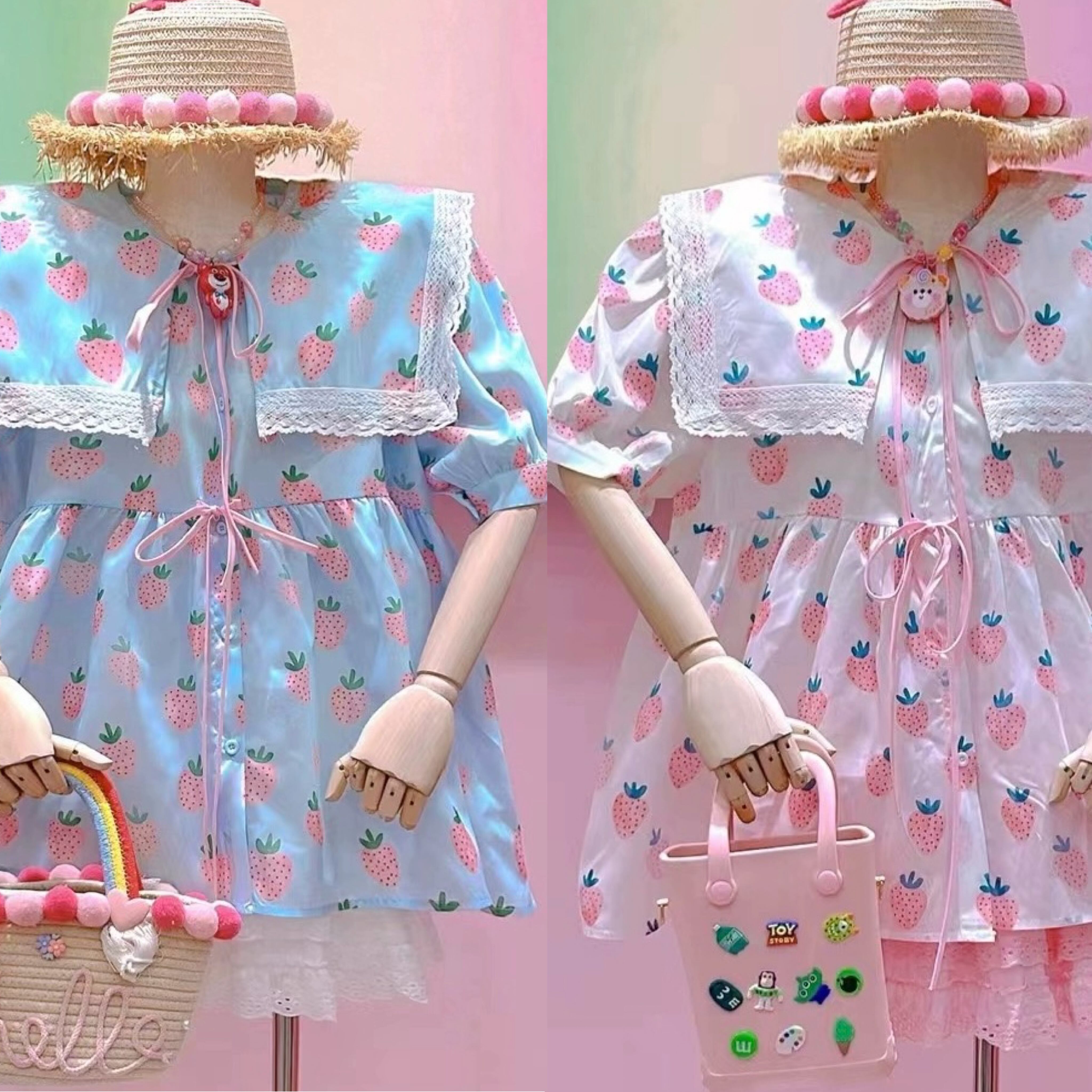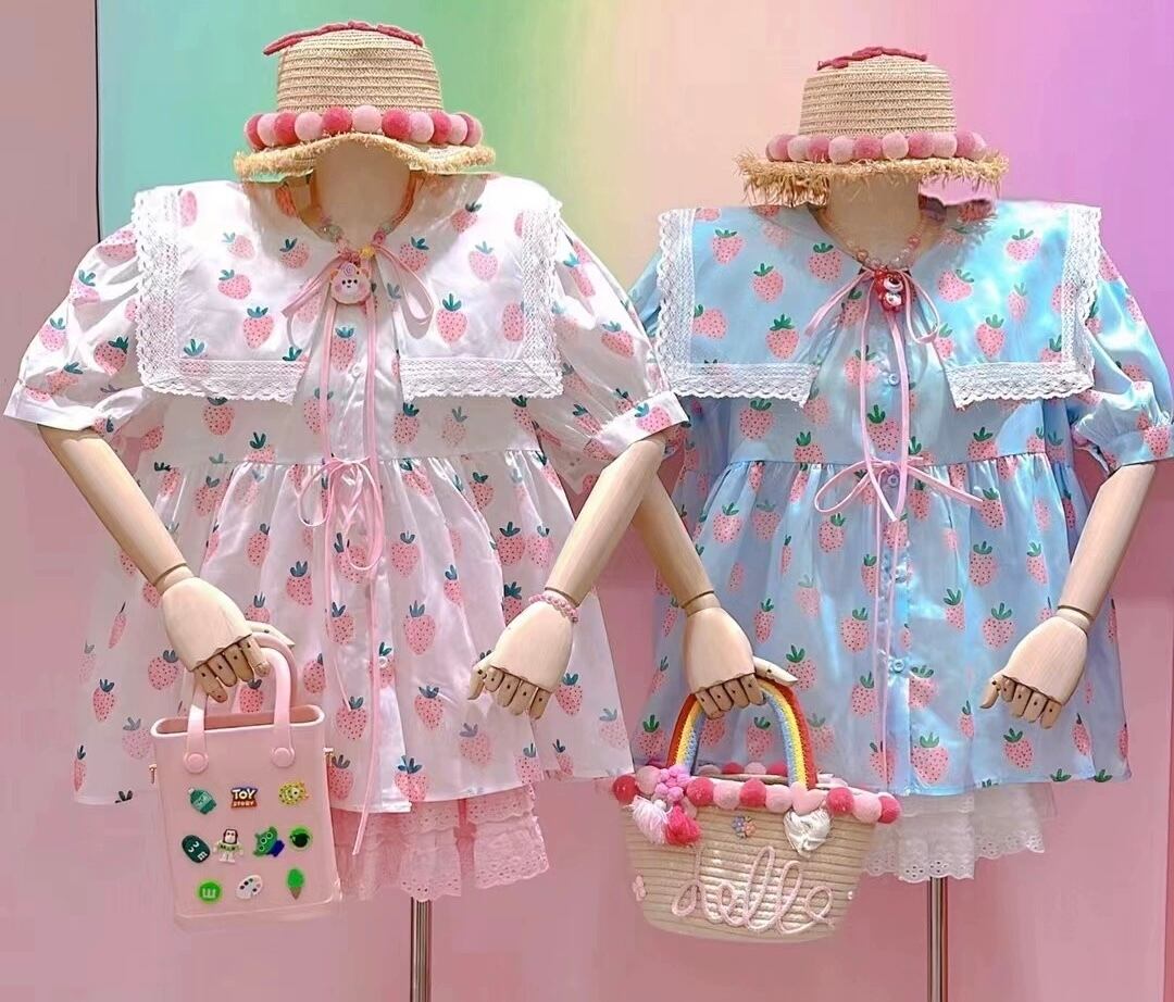 ブラウス 水色 白 ピンク いちご リボン 可愛い