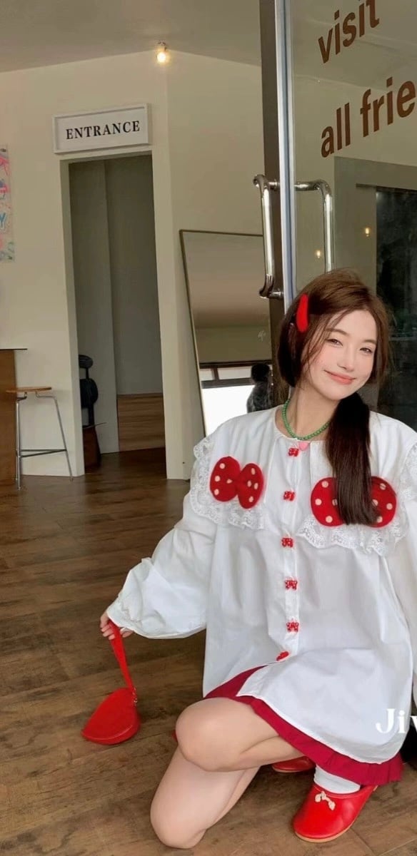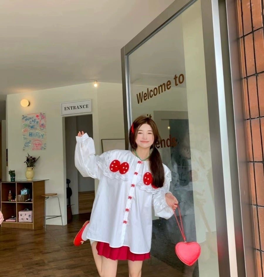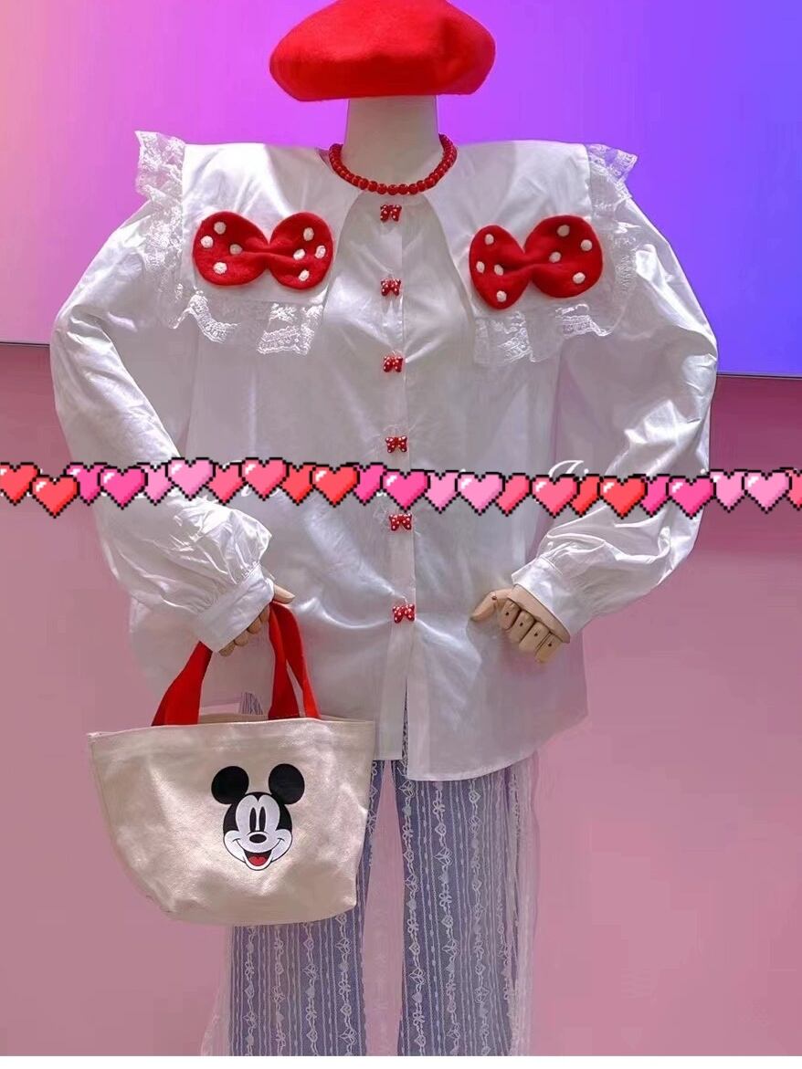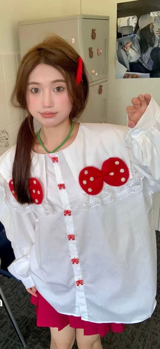 赤 リボン 白 でか襟 ブラウス カジュアル 可愛い