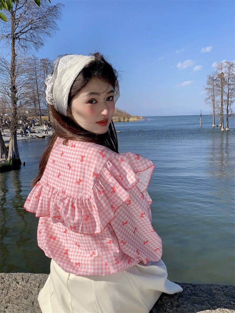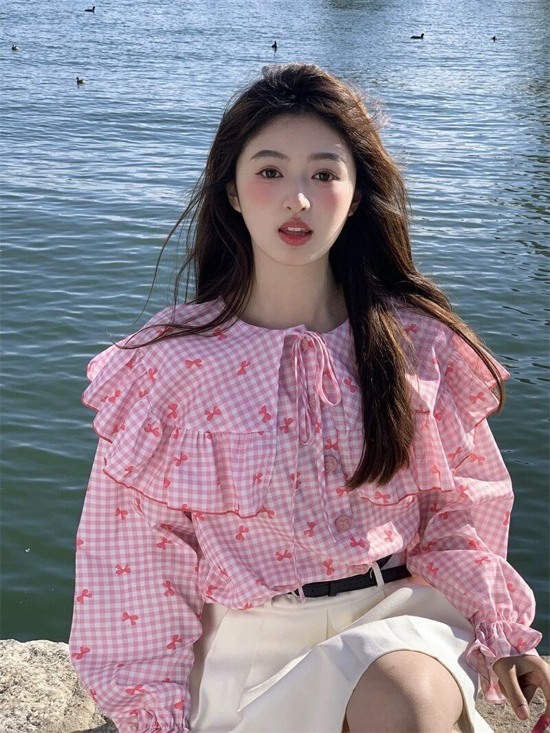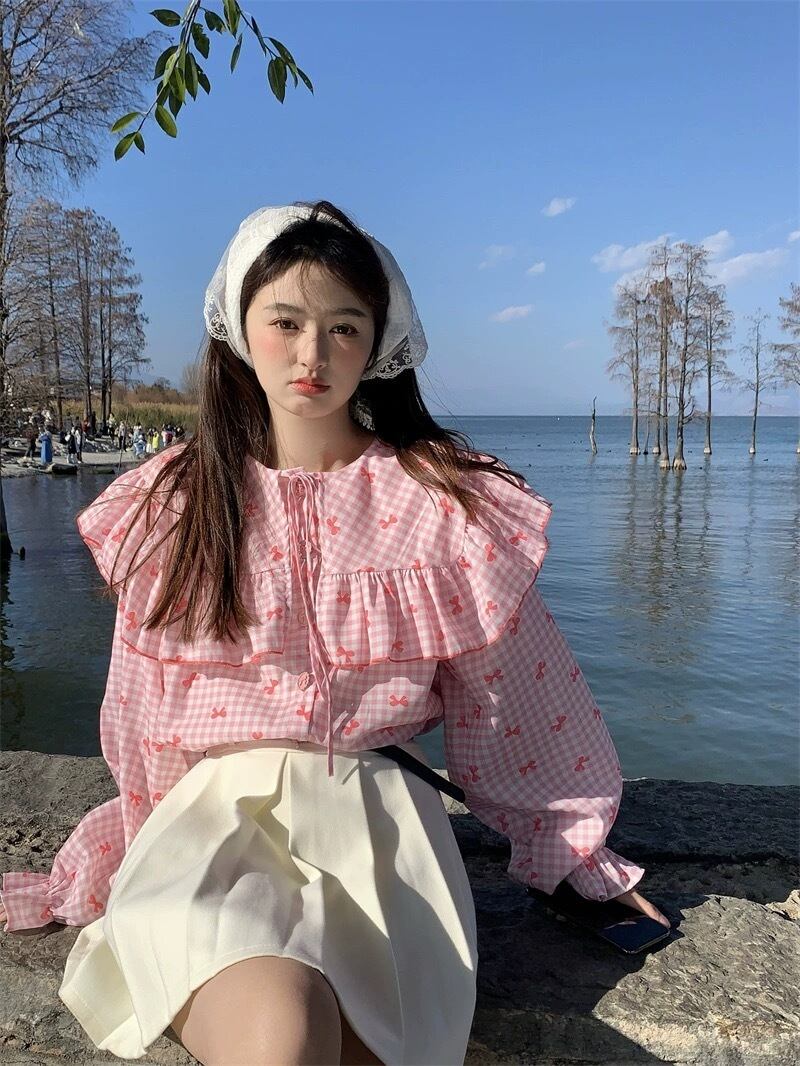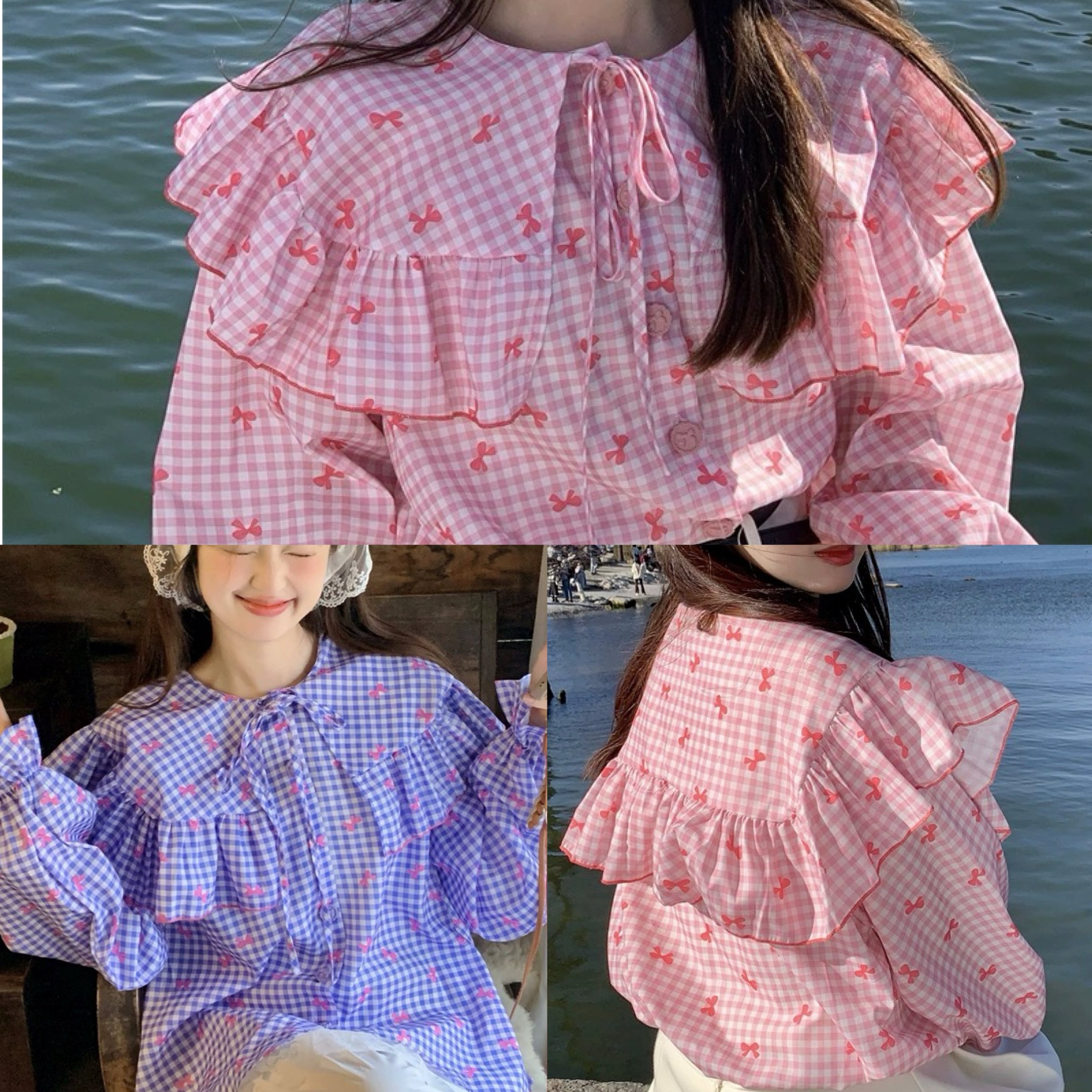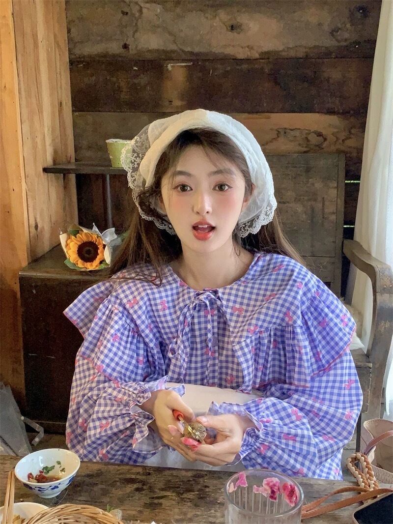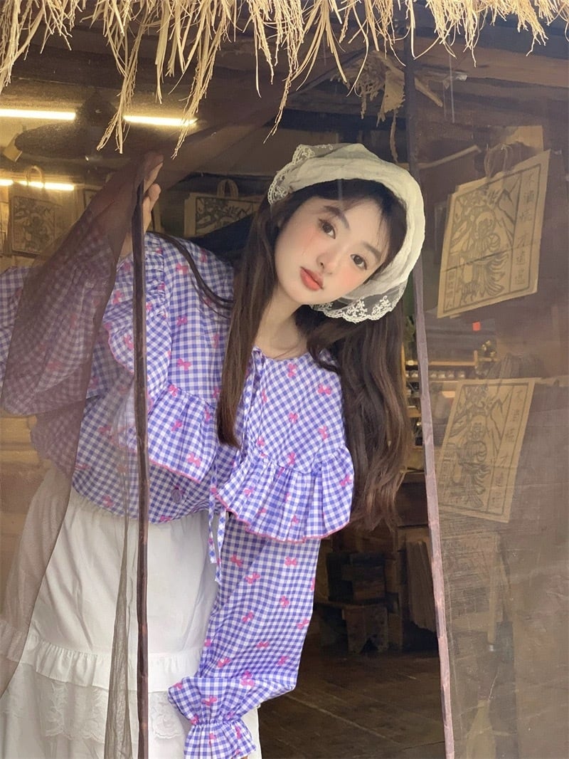紫 ピンク チェック 可愛い ガーリー ブラウス トップス