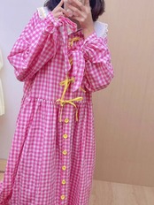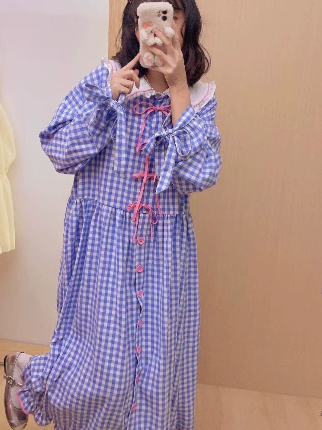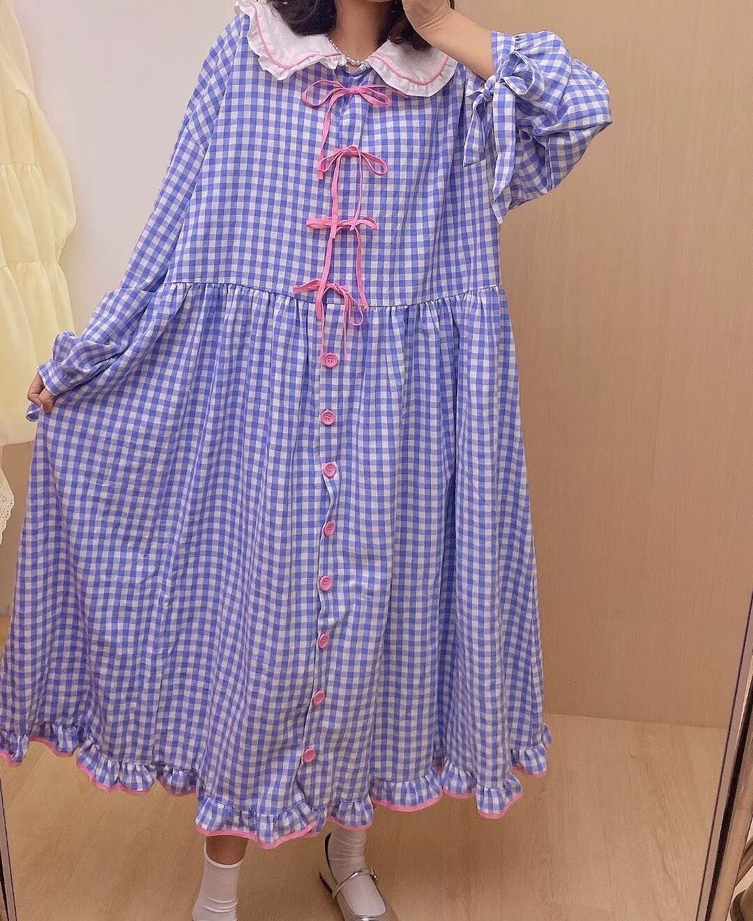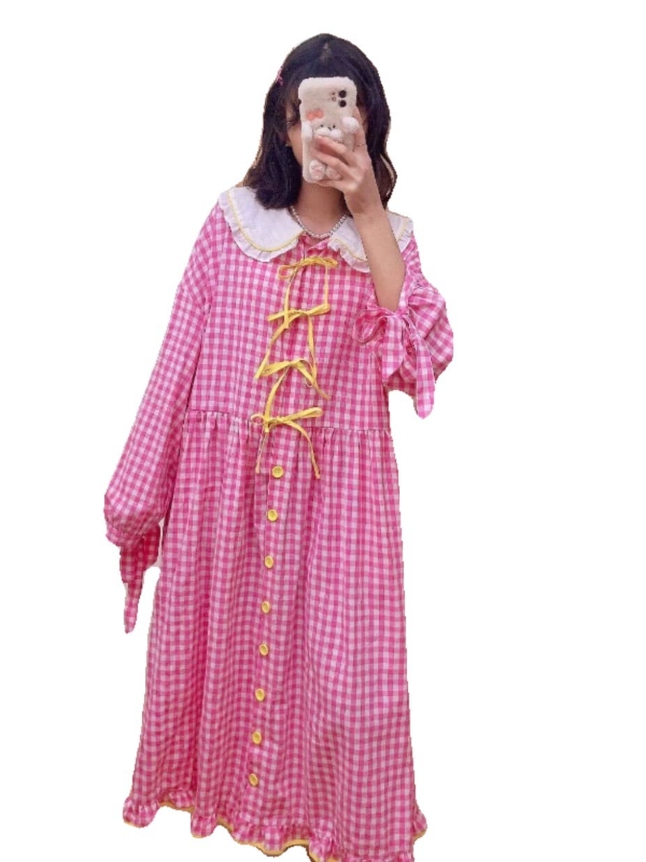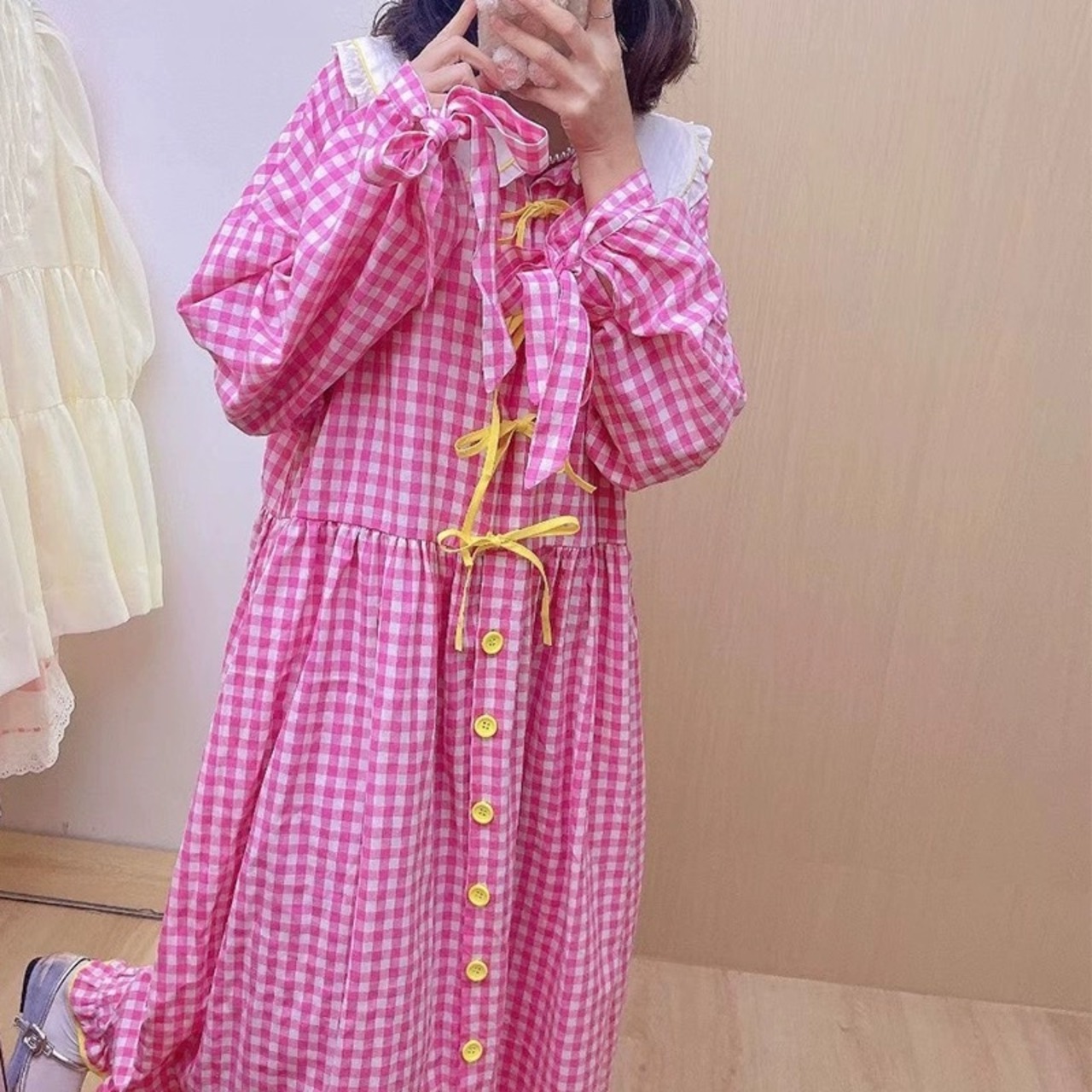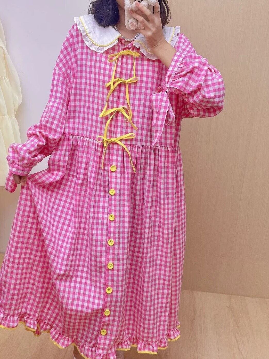 水色 ピンク 丸襟 チェック ワンピース ブラウス リボン 黄色