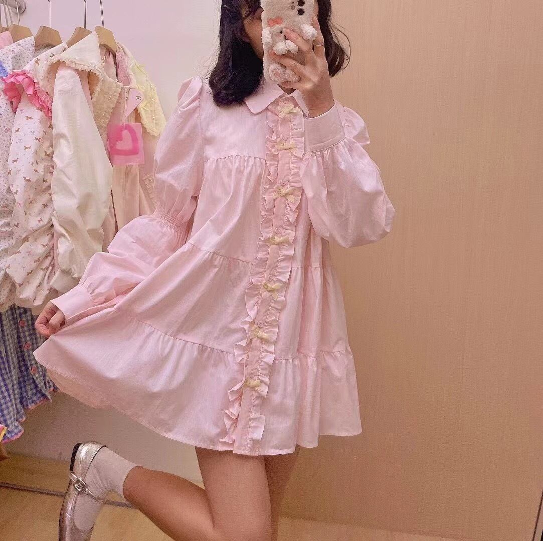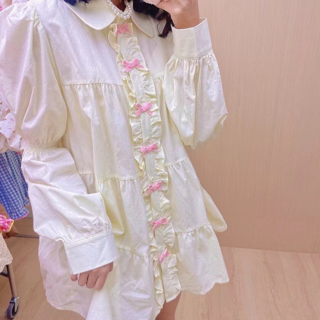 黄色 ピンク リボン ガーリー ワンピース ブラウス