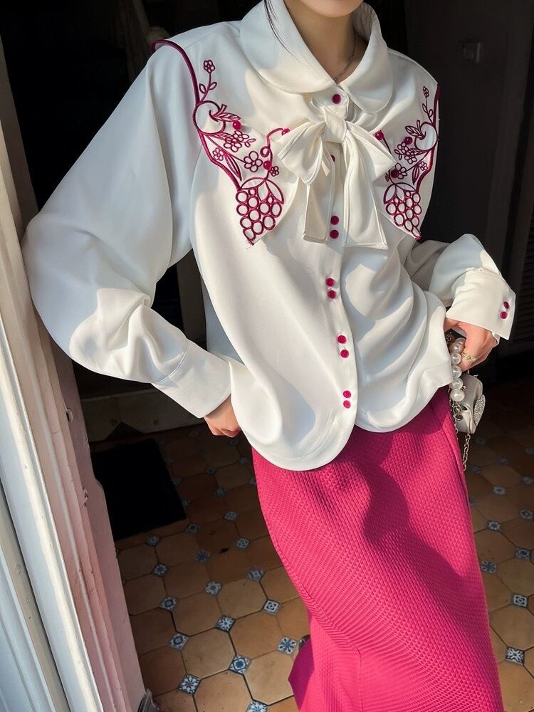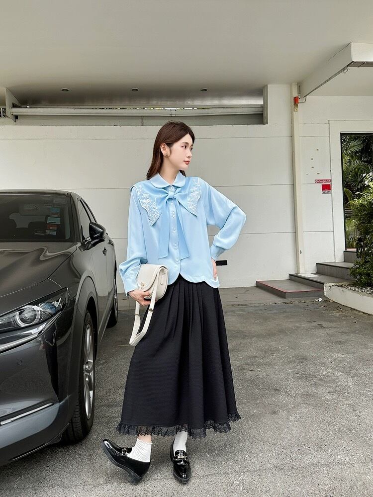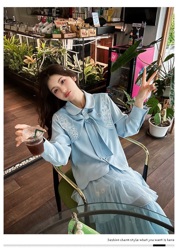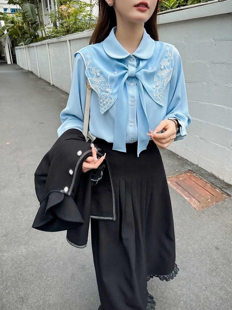 水色 白 リボン 赤 ブラウス シャツ XL シンプル 爽やか XL