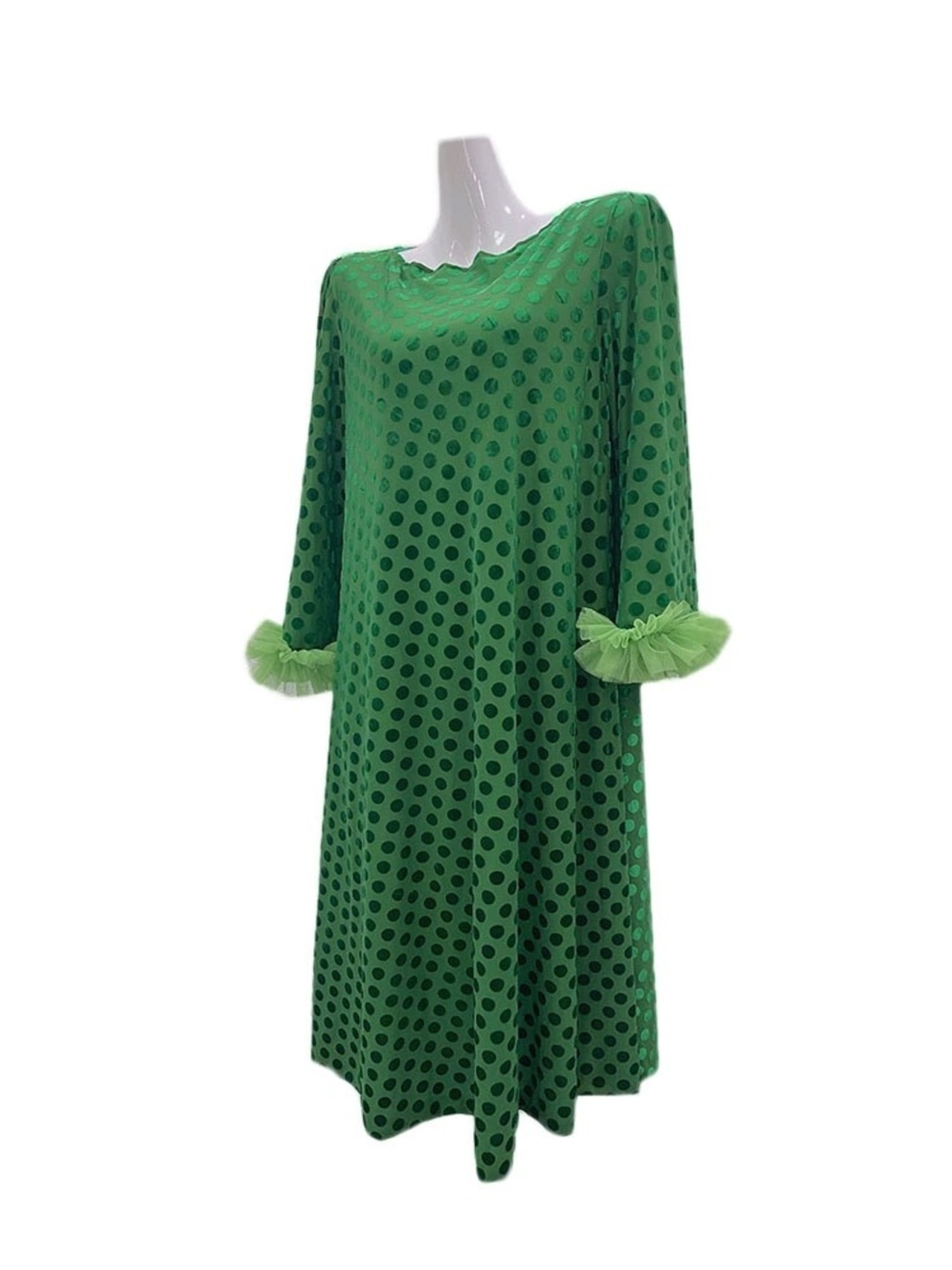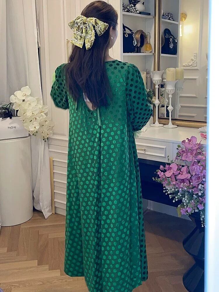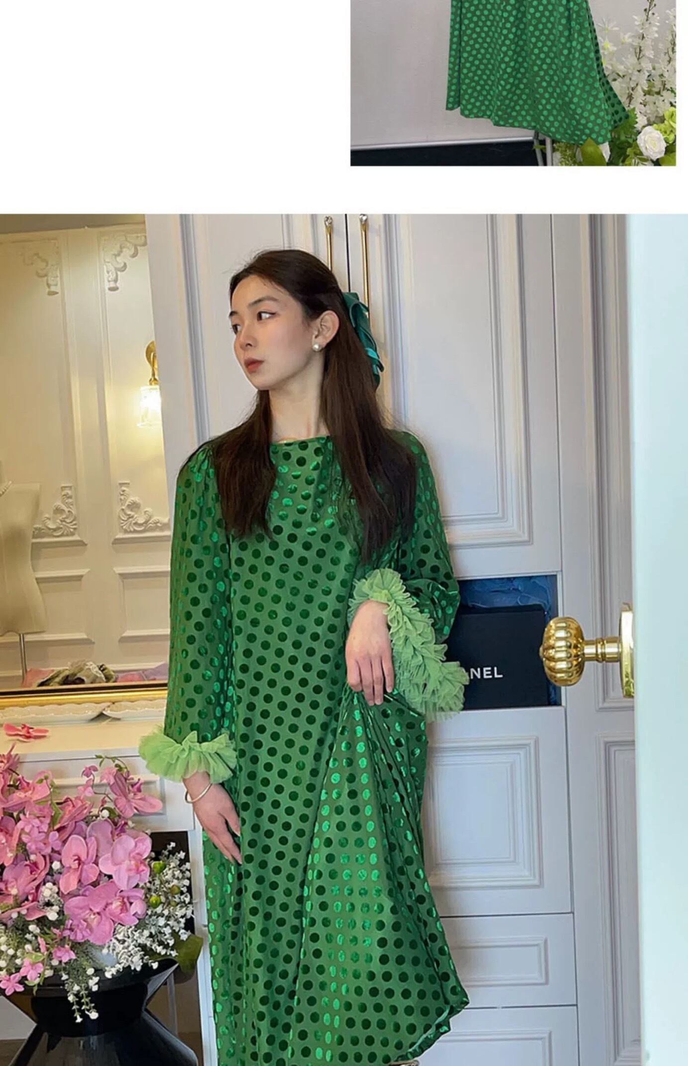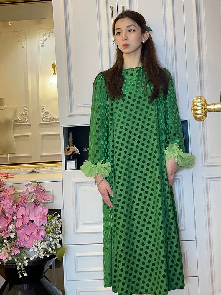 緑 ドット 水玉 ワンピース リボン ブラウス マキシ ドレス