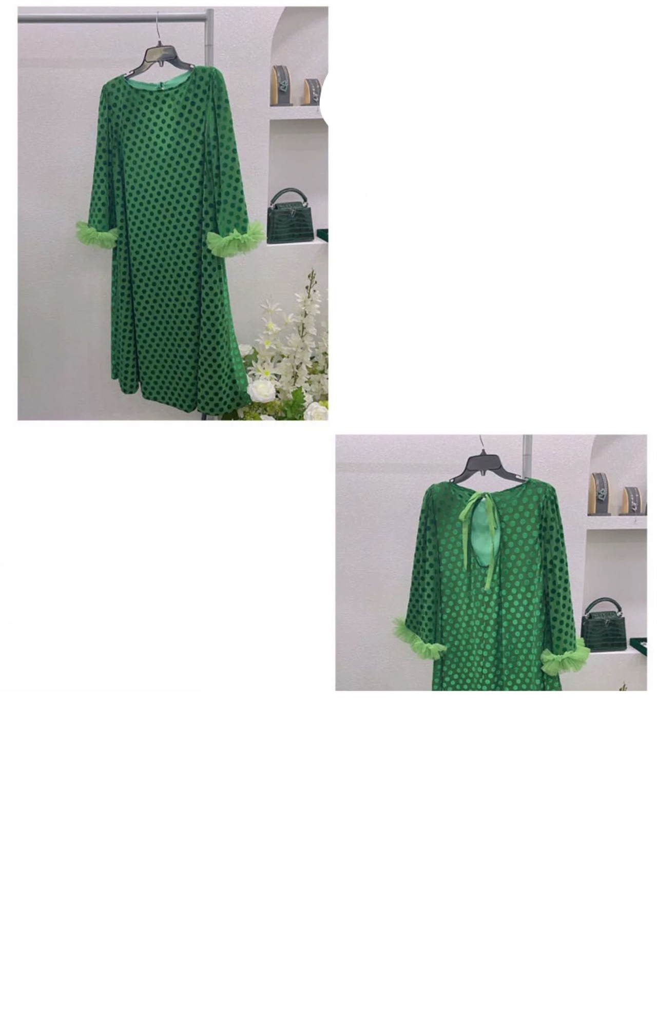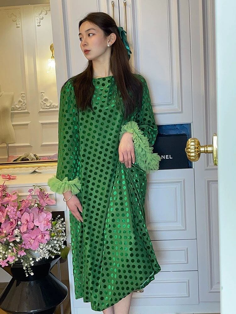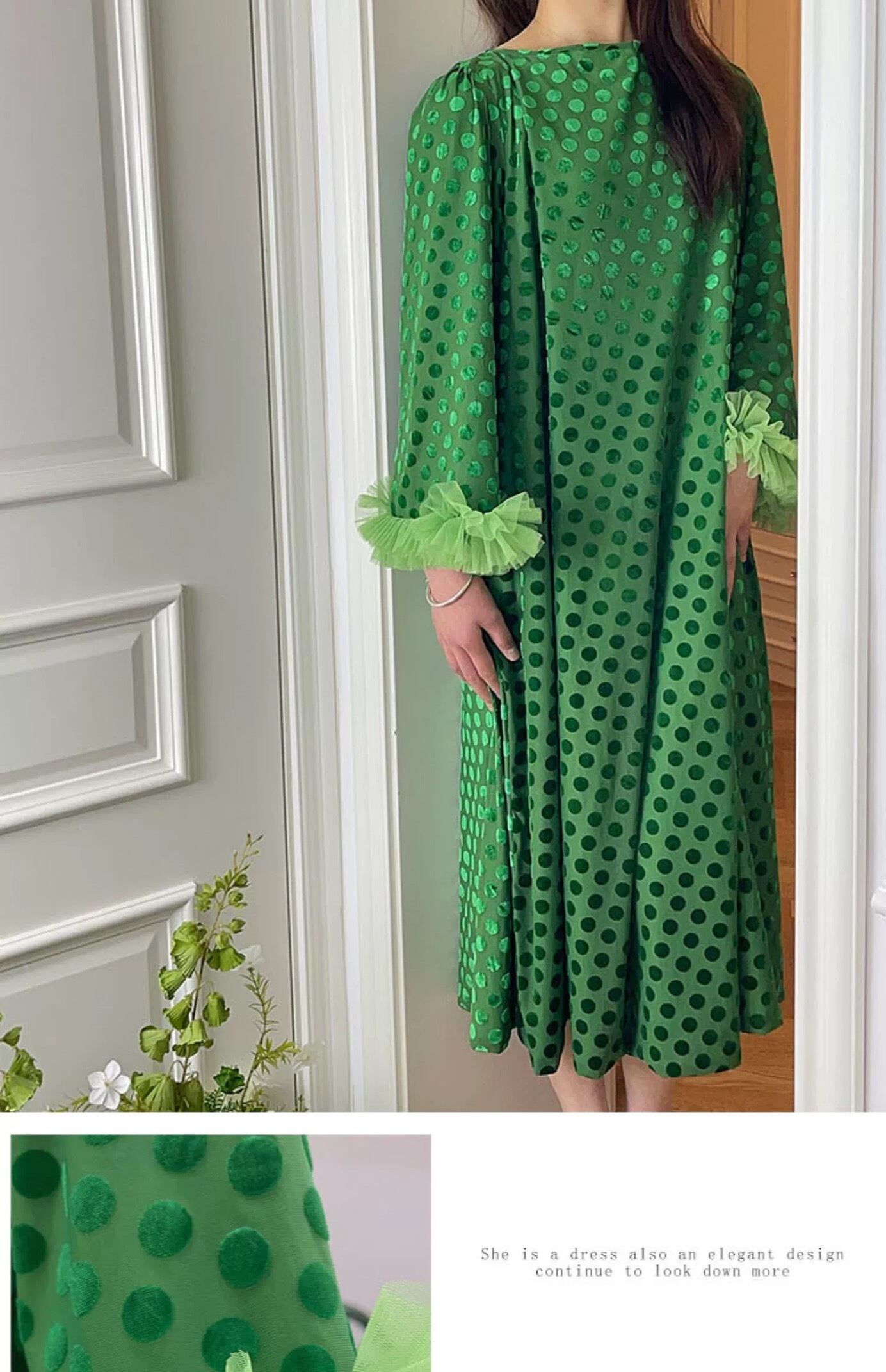 緑 ドット 水玉 ワンピース リボン ブラウス マキシ ドレス