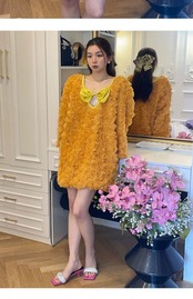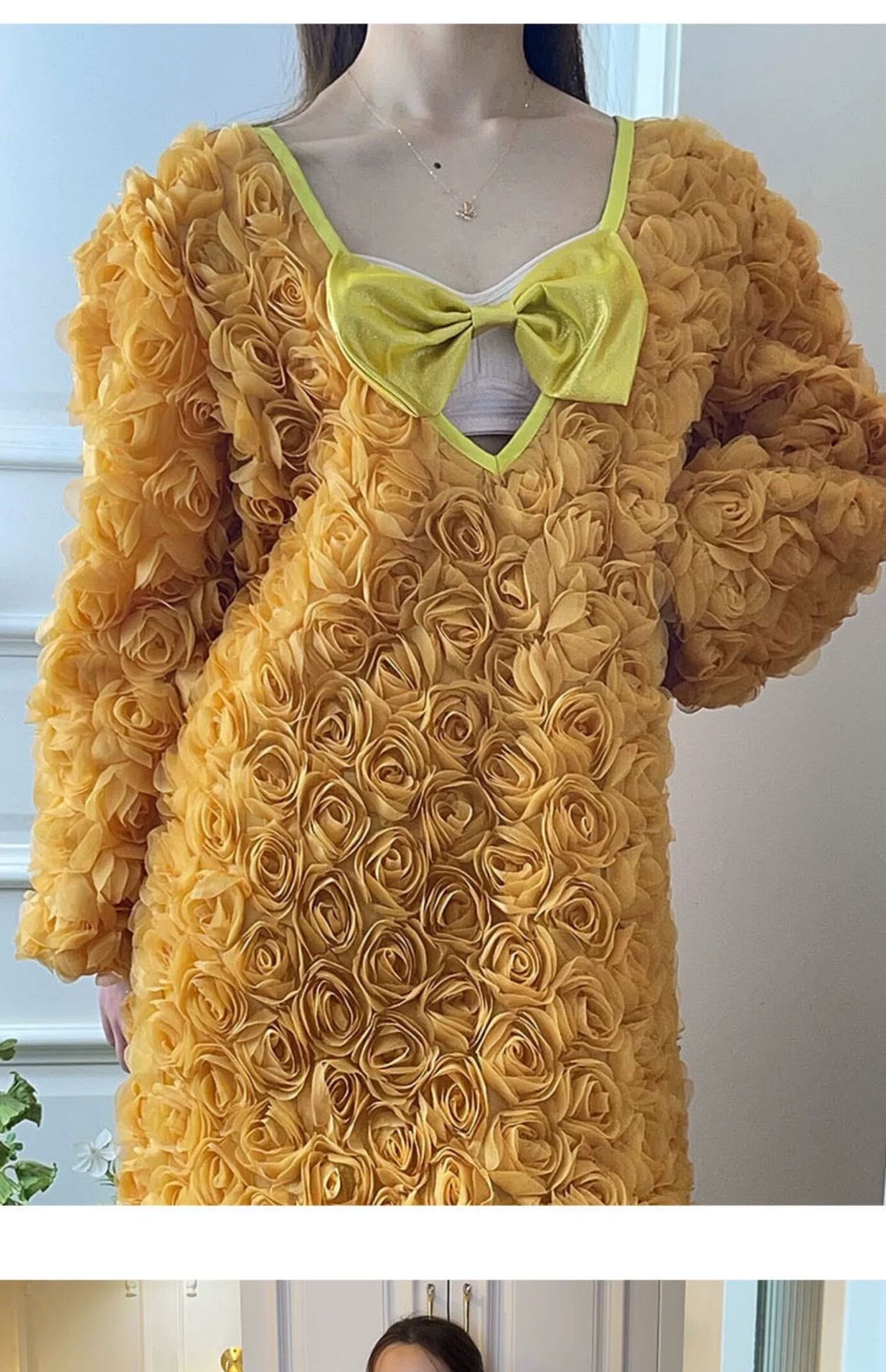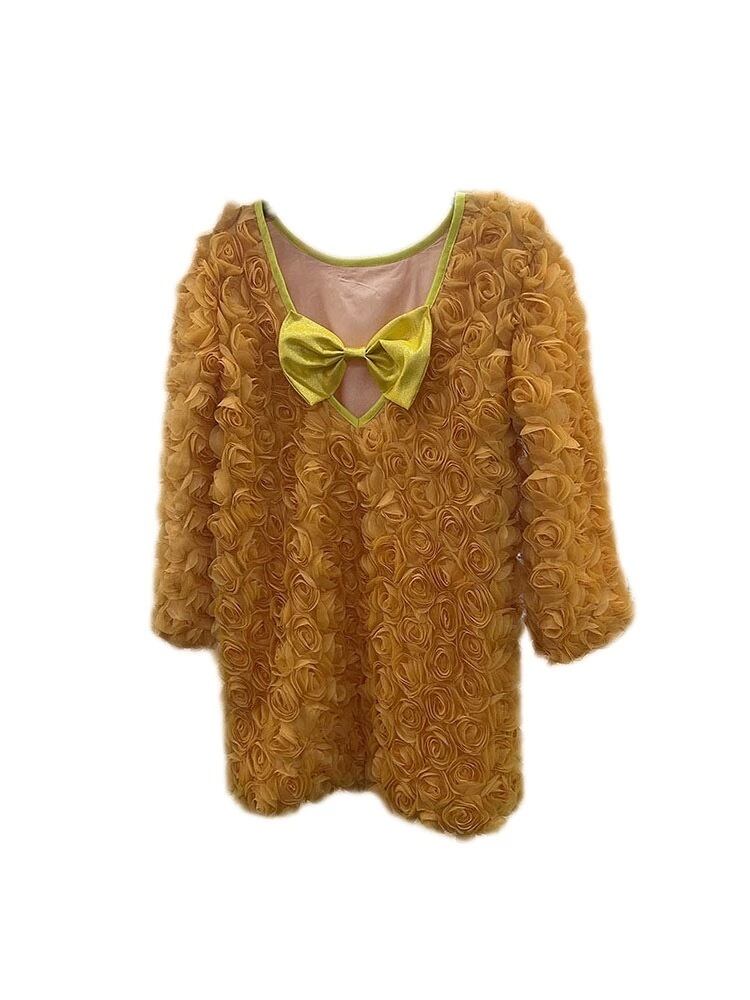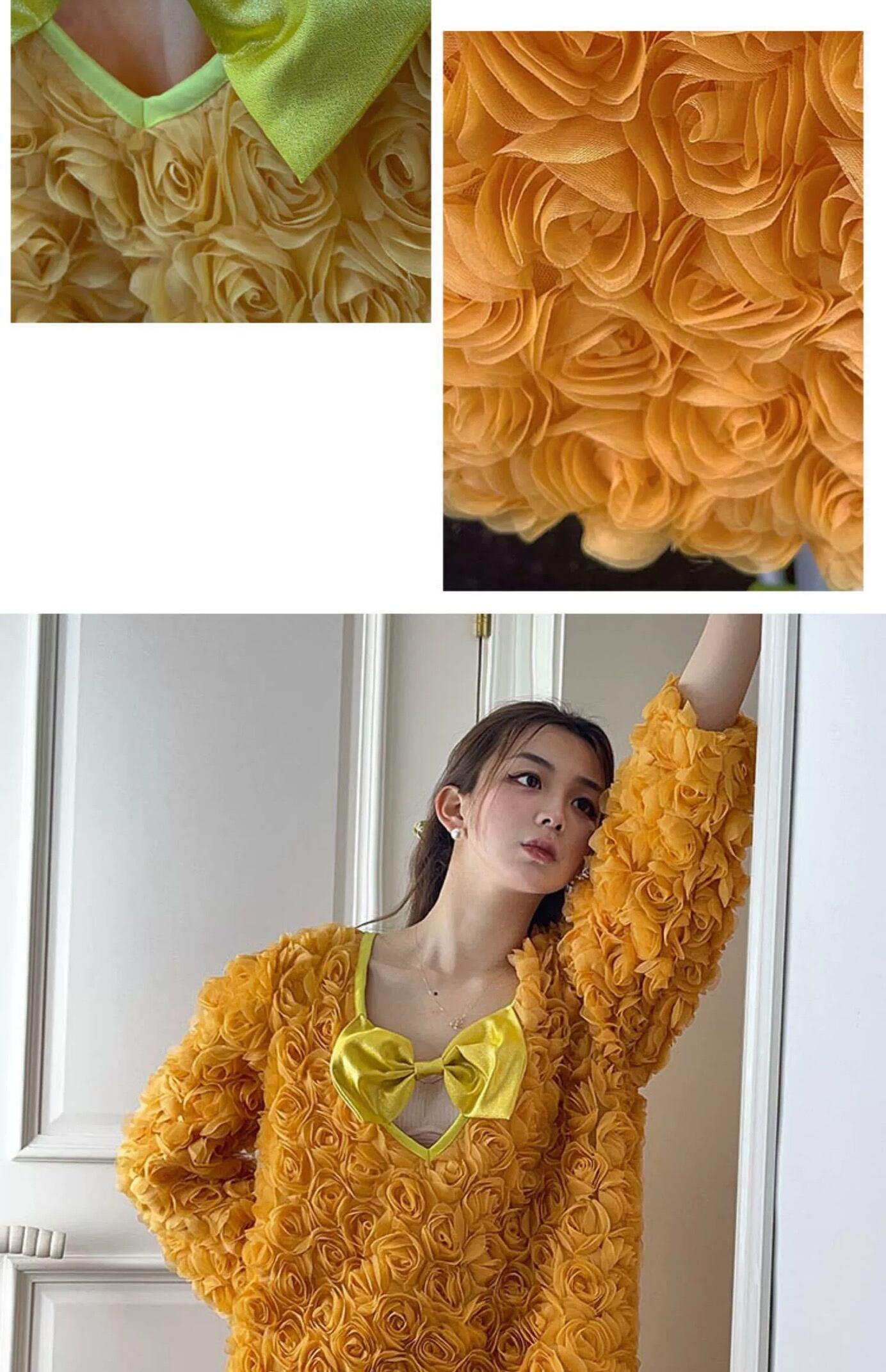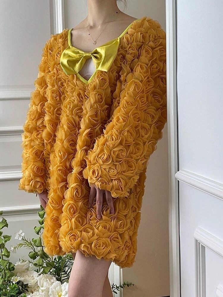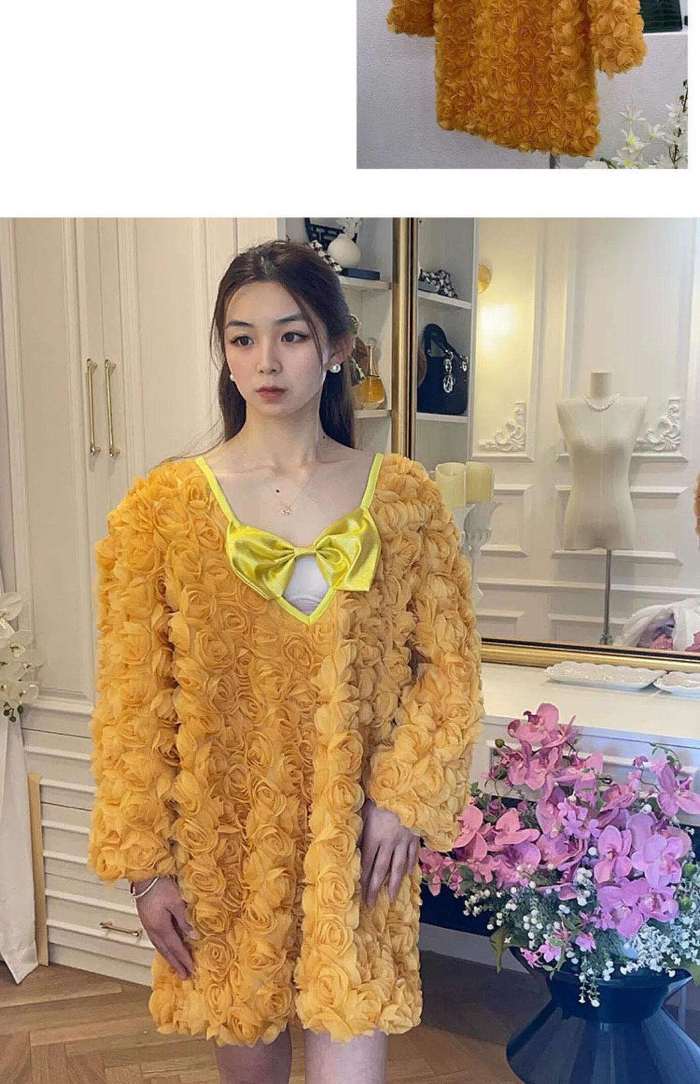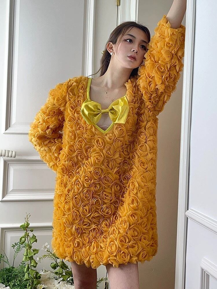 黄色 花柄 フラワー 薔薇 カメリア ワンピース チュニック パーティー ドレス オレンジ リボン
