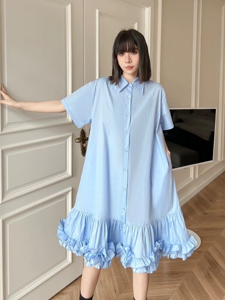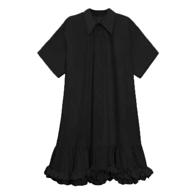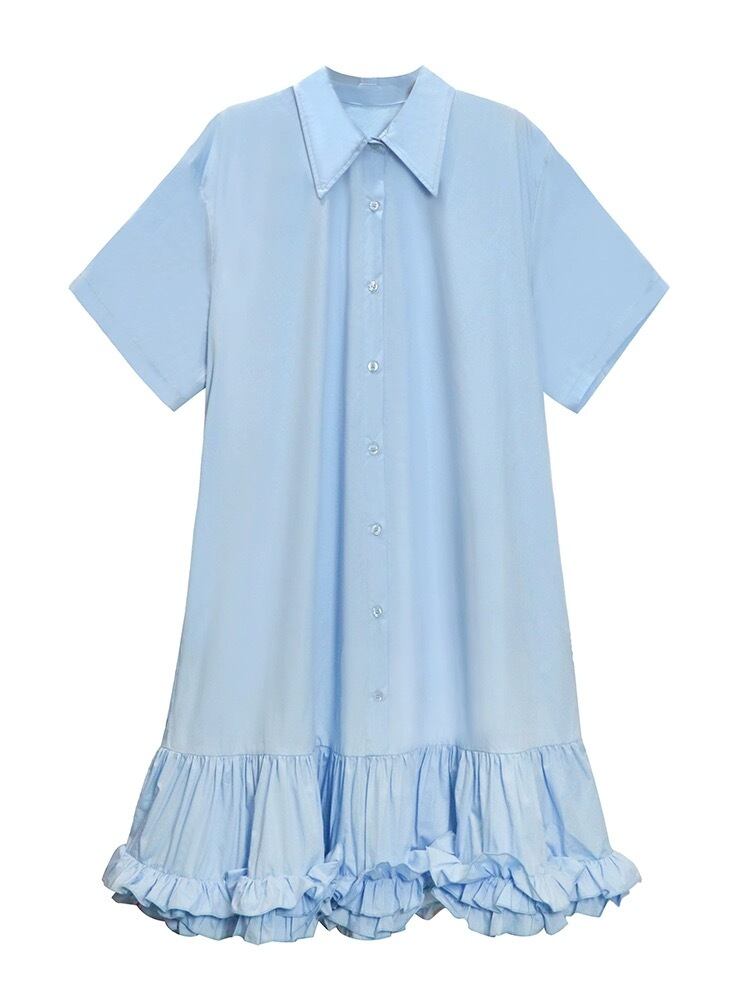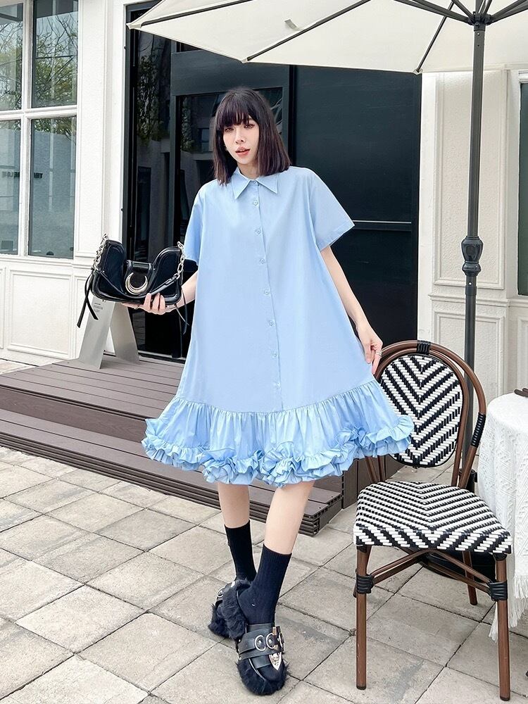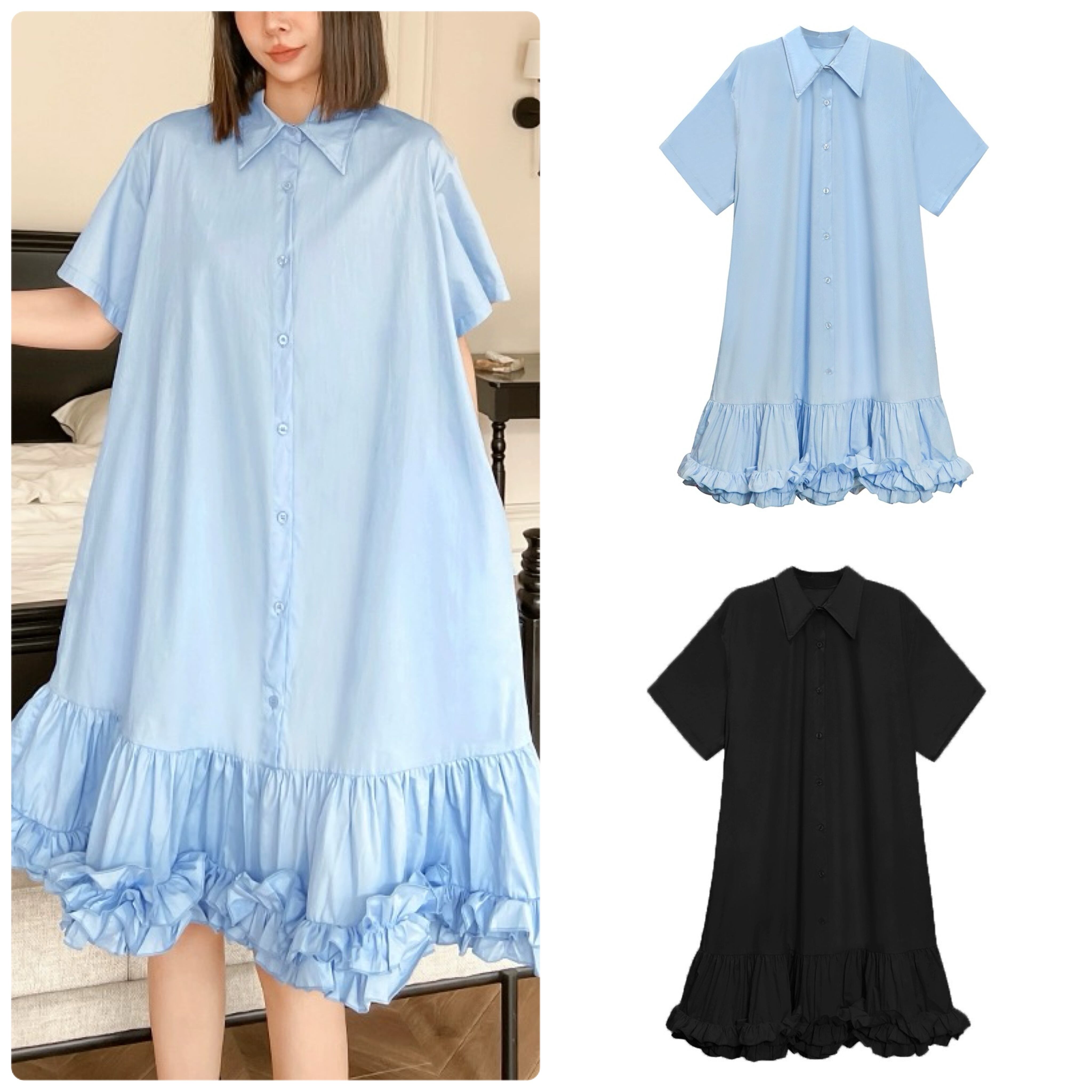 カジュアル ブラウス ワンピース 水色 黒 シャツ ゆったり
