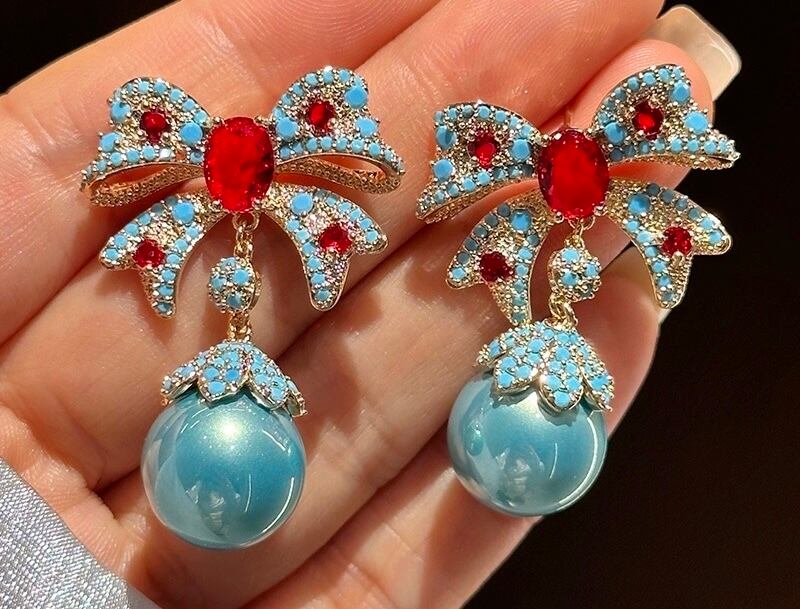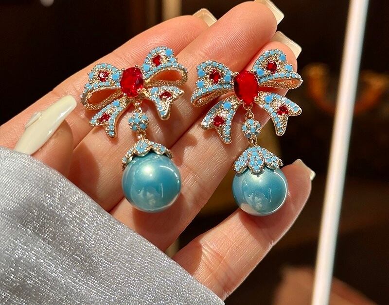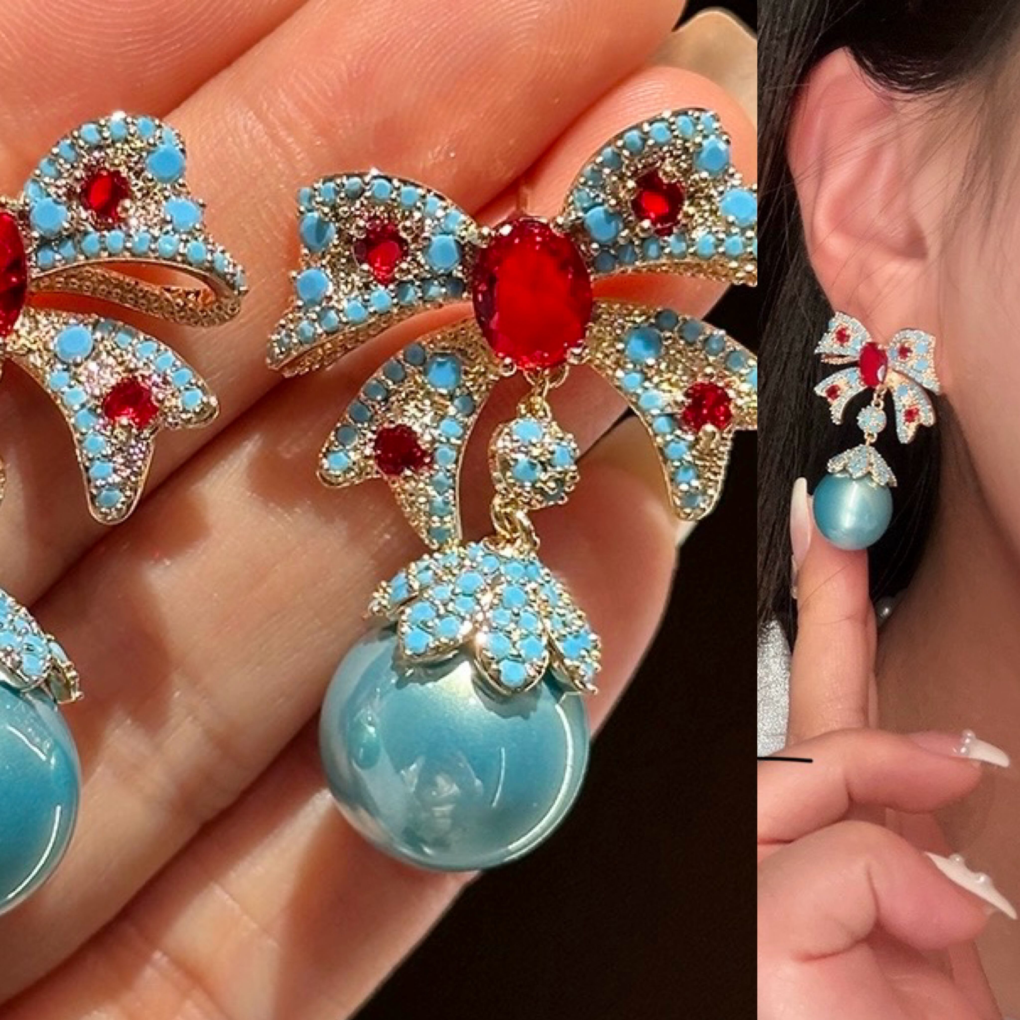 水色 パール リボン ラインストーン キラキラ 赤 ピアス